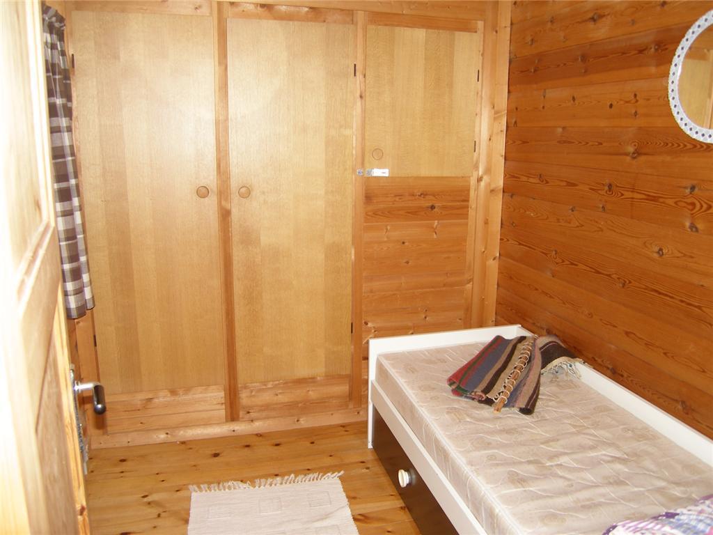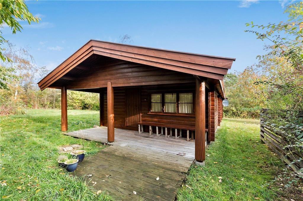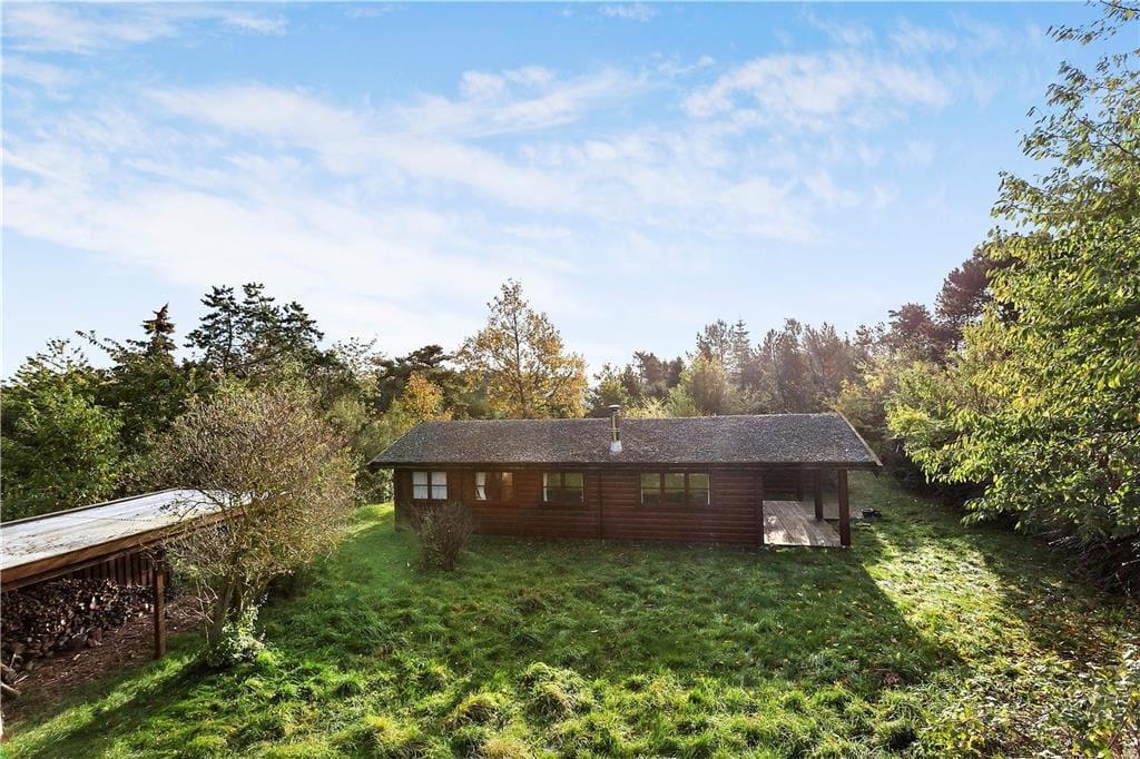 Opholdsstue med lofter til kip og synlige bjælker. Stuen indeholder sofagruppe, spisebord og udgang til en overdækket terrasse. Åbent køkken. Badeværelse med brus. Soveværelse med dobbeltseng. Værelse med enkeltseng. Værelse med køjesenge.