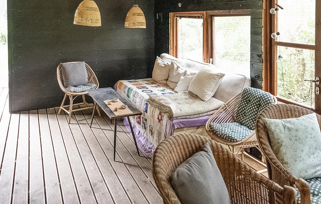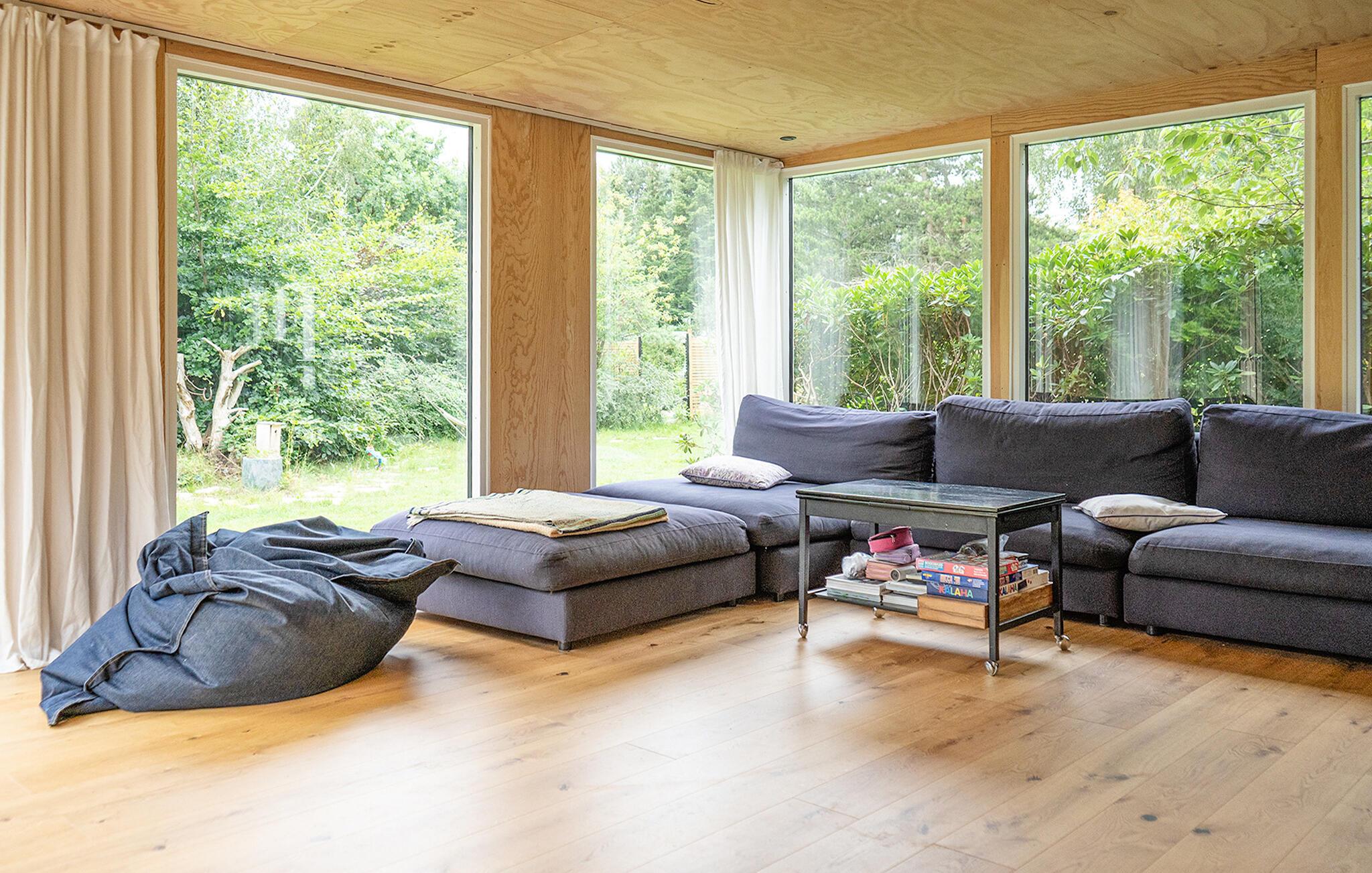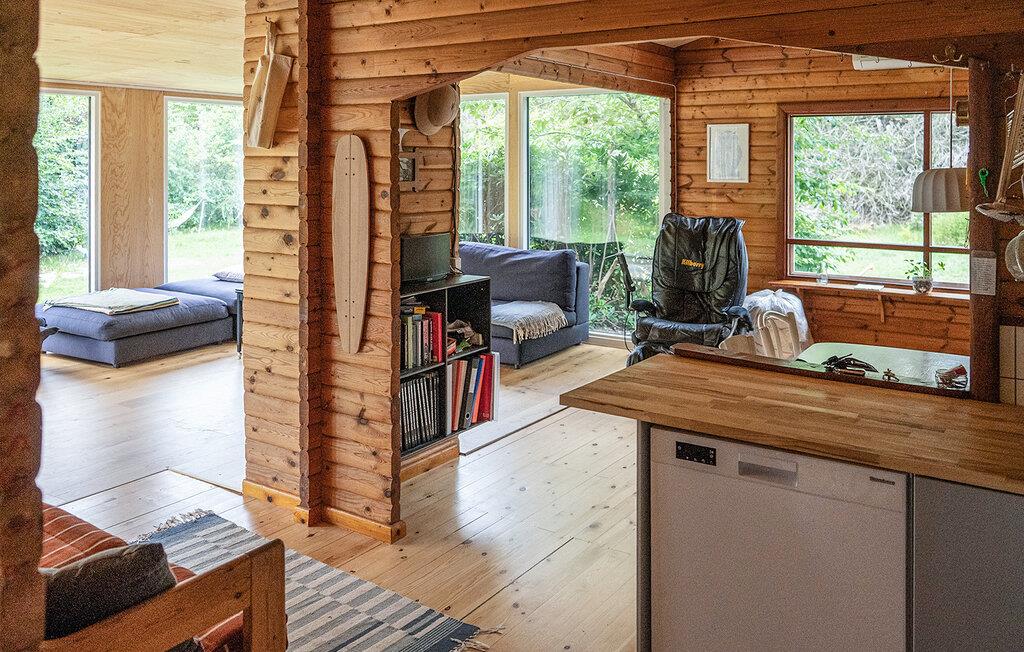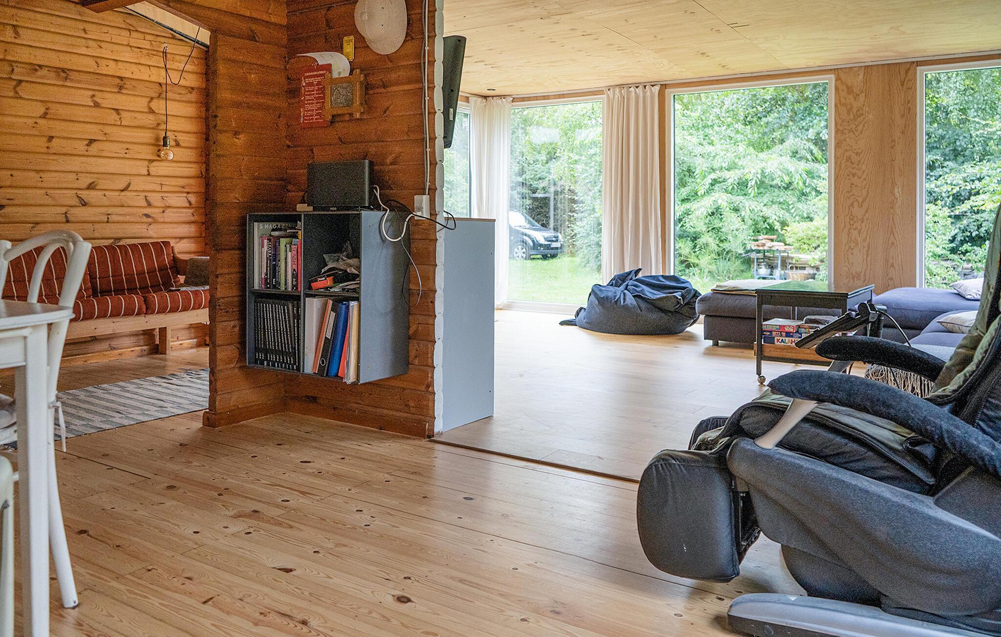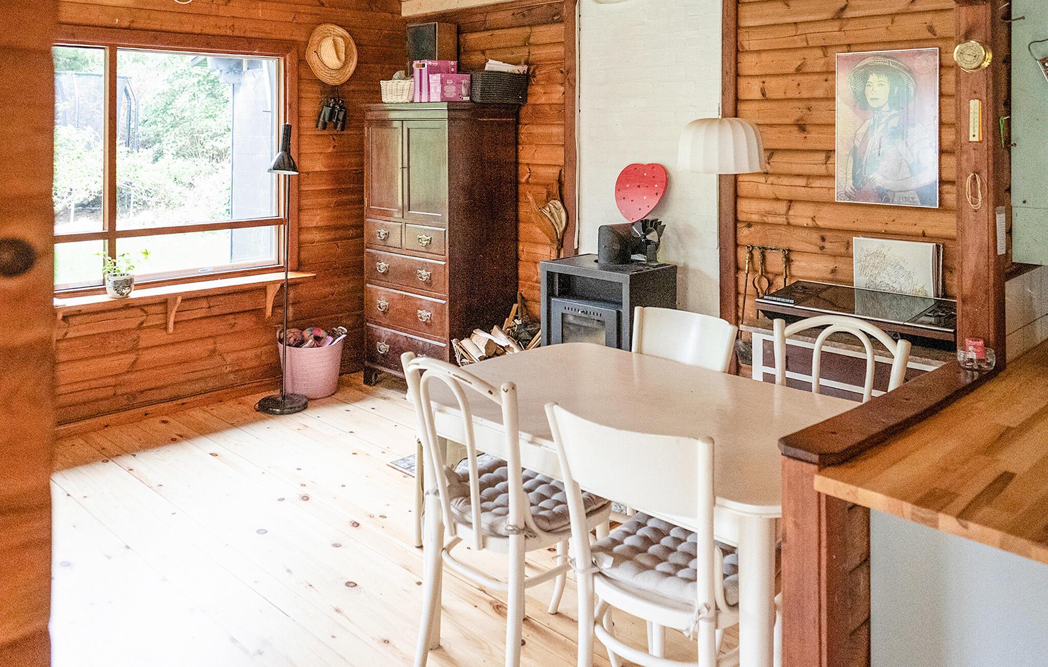 På en skøn naturgrund med træer og buske ligger dette indbydende træhus perfekt til en afslappende ferie i fredfyldte omgivelser. Her får I en skøn blanding af hyggelige forhold, skøn natur og familievenlighed. Indenfor finder I en hjemlig stil med masser af træ og varm belysning. Den hyggelige sofakrog er det ideelle sted at slappe af efter en lang gåtur på stranden. Lav mad sammen i det åbne køkken, og brug spiseområdet til hyggelige måltider eller spilleaftener med familien. Imens sørger brændeovnen for hyggelig varme.