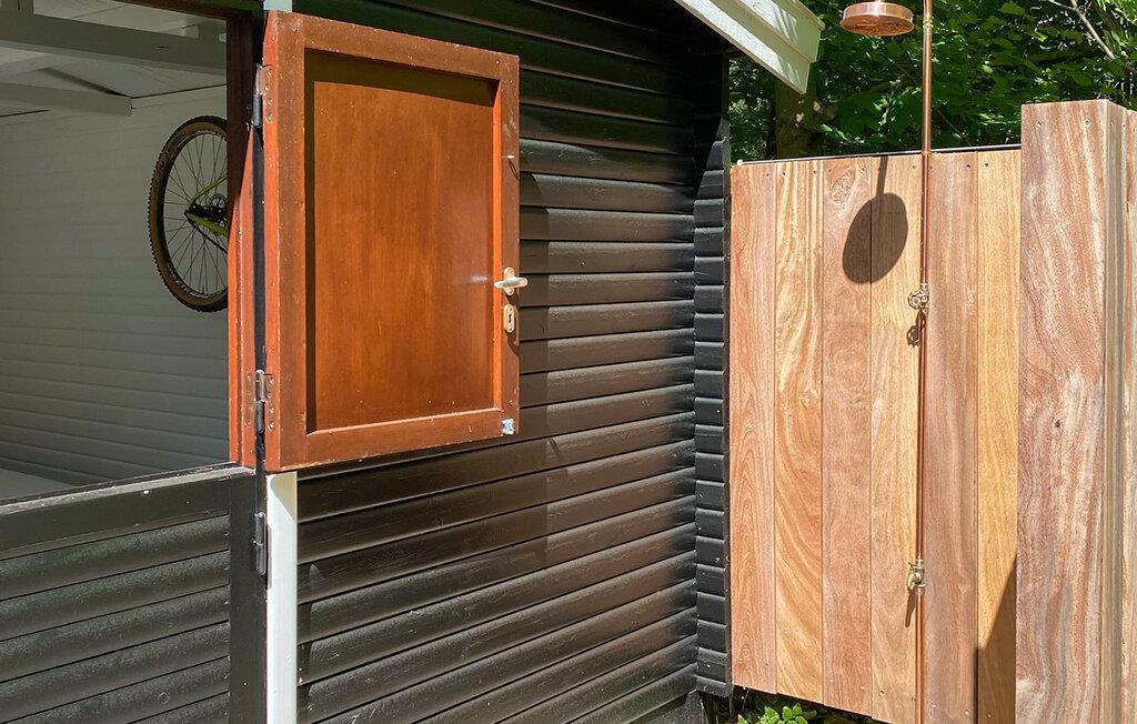 Udeområdet er skønt og frodigt. På den store træterrasse kan I nyde morgenmaden eller afslutte dagen med et glas vin. Find jer godt til rette i liggestolene eller ryk ud i shelteret, hvis I ønsker jer en unik udendørsoplevelse. I kan også overnatte her. Udendørsbruseren giver jer mulighed for at køle ned på varme dage.