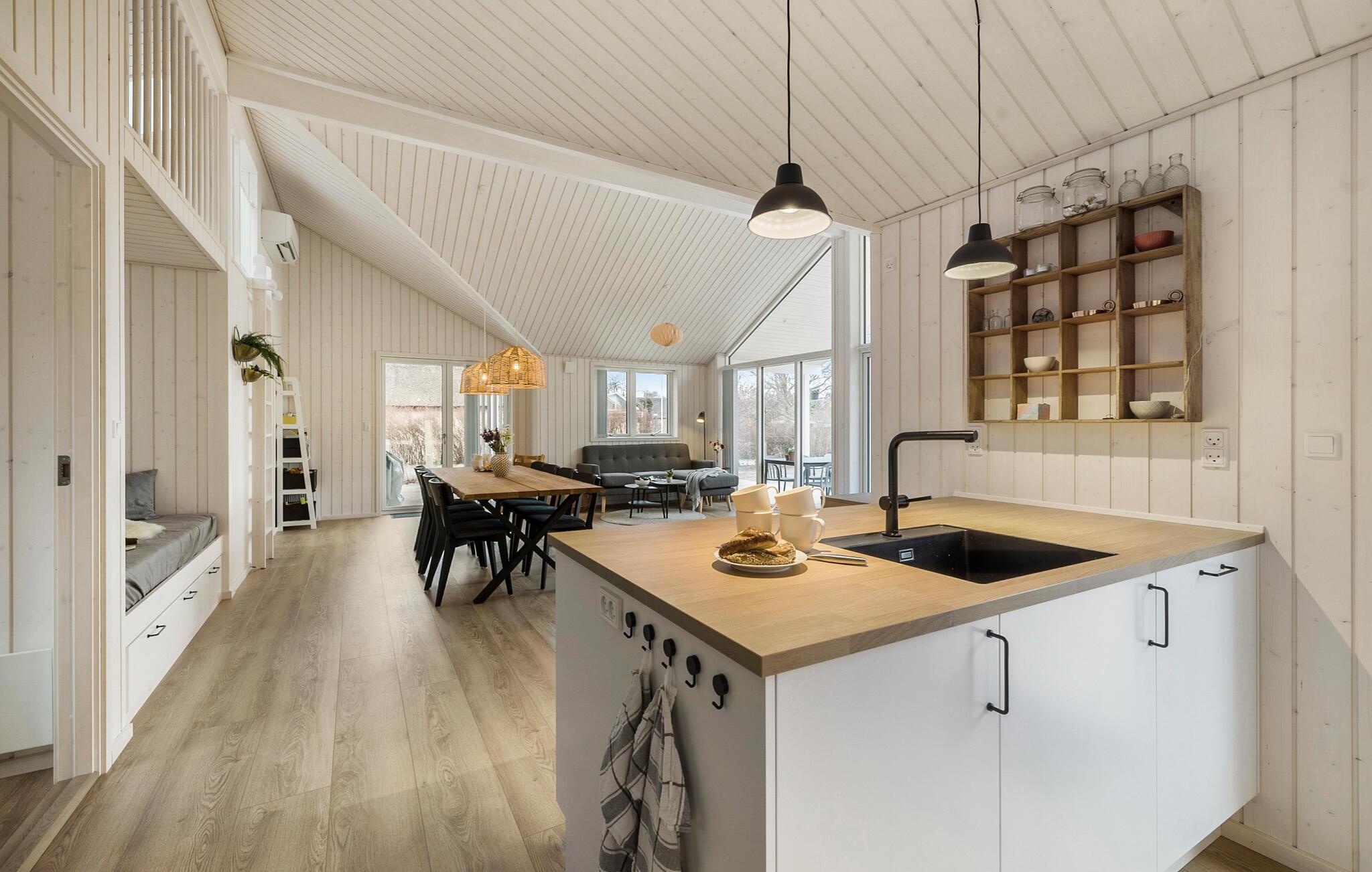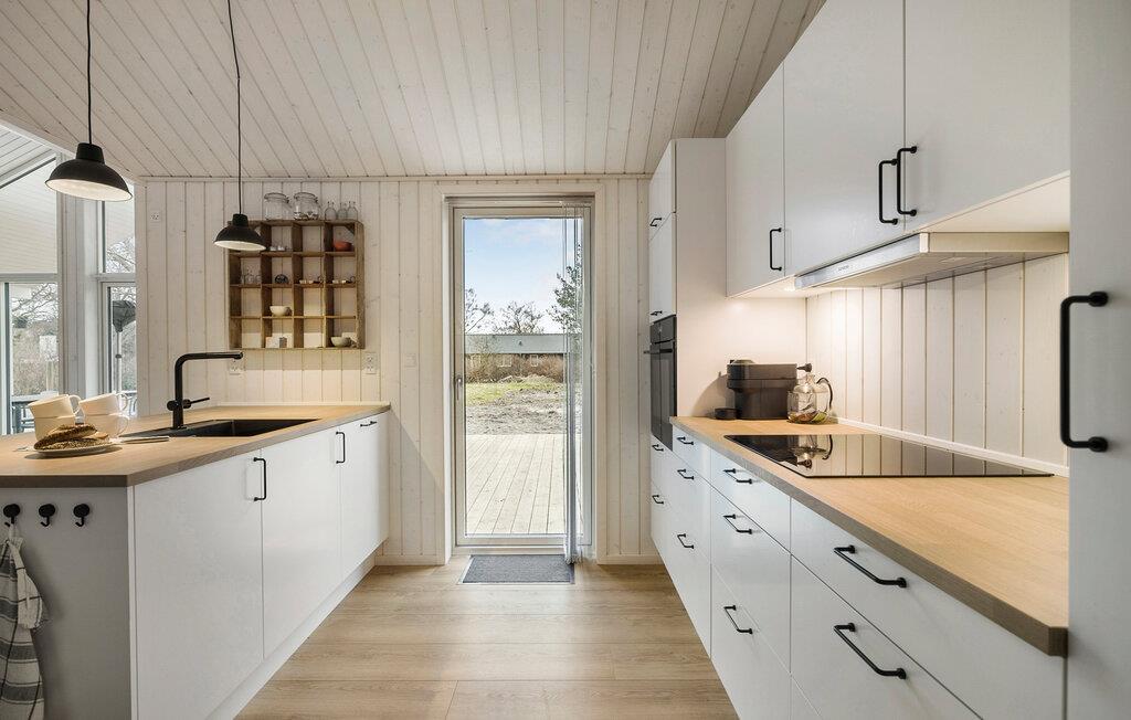 Dette charmerende sommerhus venter på jer nær den populære Liseleje Strand og byder på ro og afslapning. Sæt hverdagen på pause og fordyb jer i den typiske danske hygge. Den lyse stue og spiseplads grænser direkte op til det åbne køkken og skaber en harmonisk atmosfære, hvor I straks vil føle jer hjemme. Begynd dagene med en friskbrygget kop kaffe og nyd jeres morgenmad, mens I planlægger dagens udflugter. Når det bliver køligere udenfor, giver pejsen behagelig varme og en hyggelig atmosfære.