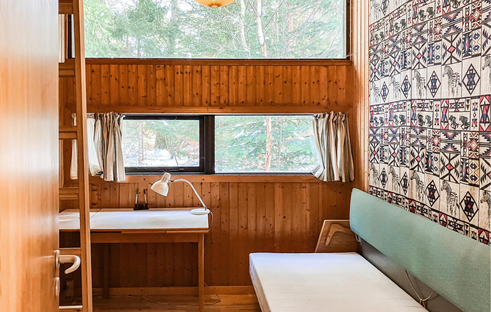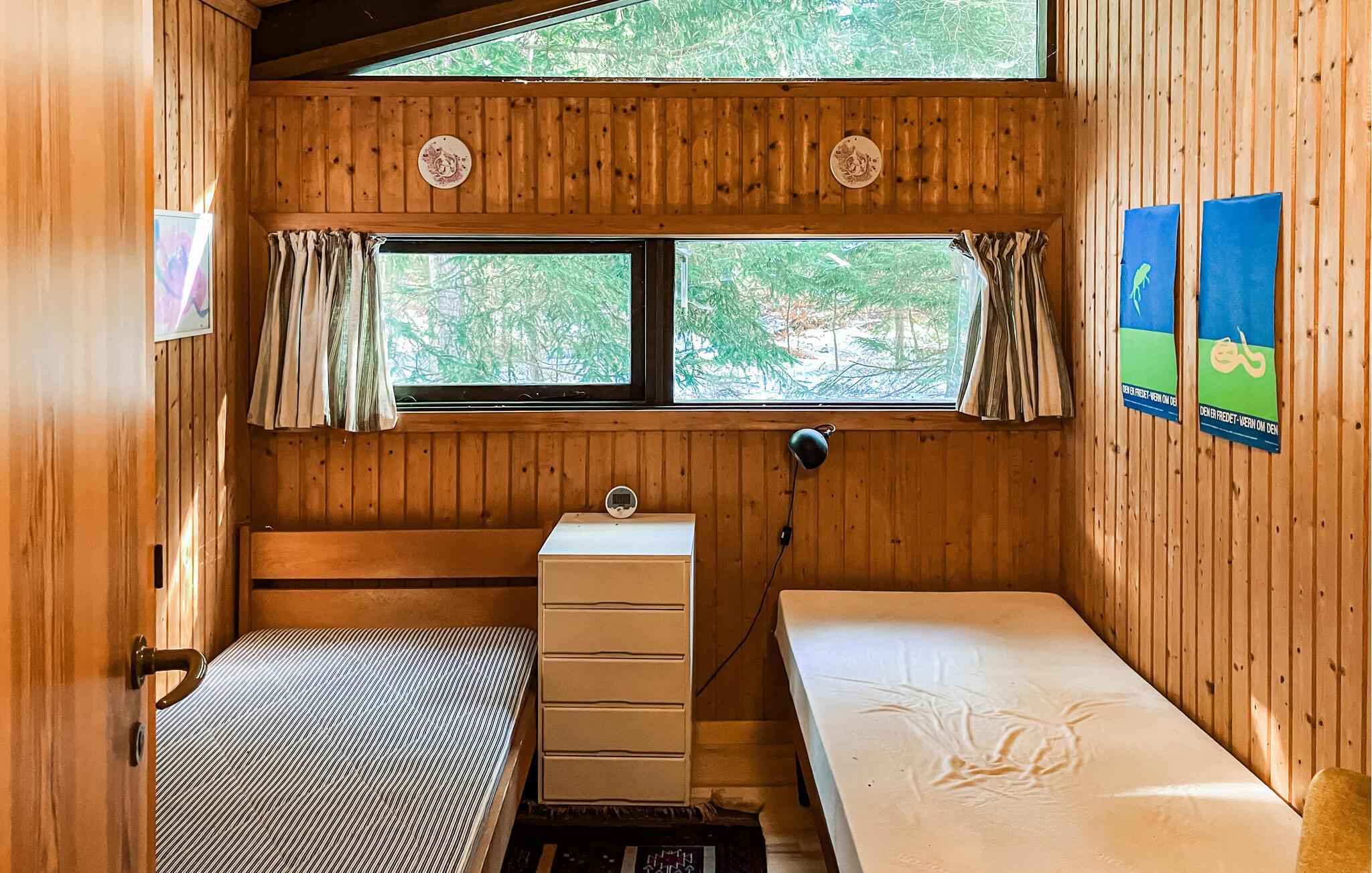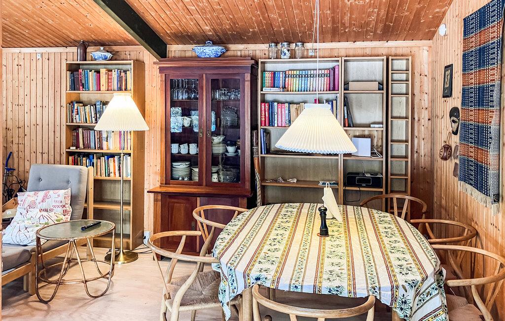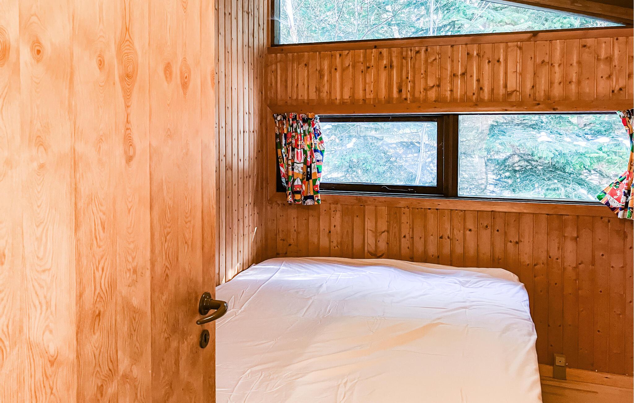 Dette hyggelige træhus udstråler en behagelig og naturlig atmosfære med sine varme vægbeklædninger, store vinduer og brændeovn. Tilbring hyggelige timer med at spille kort eller se en film sammen på sofaen. Læn jer tilbage i en af ??lænestolene med en god bog og glem tiden.