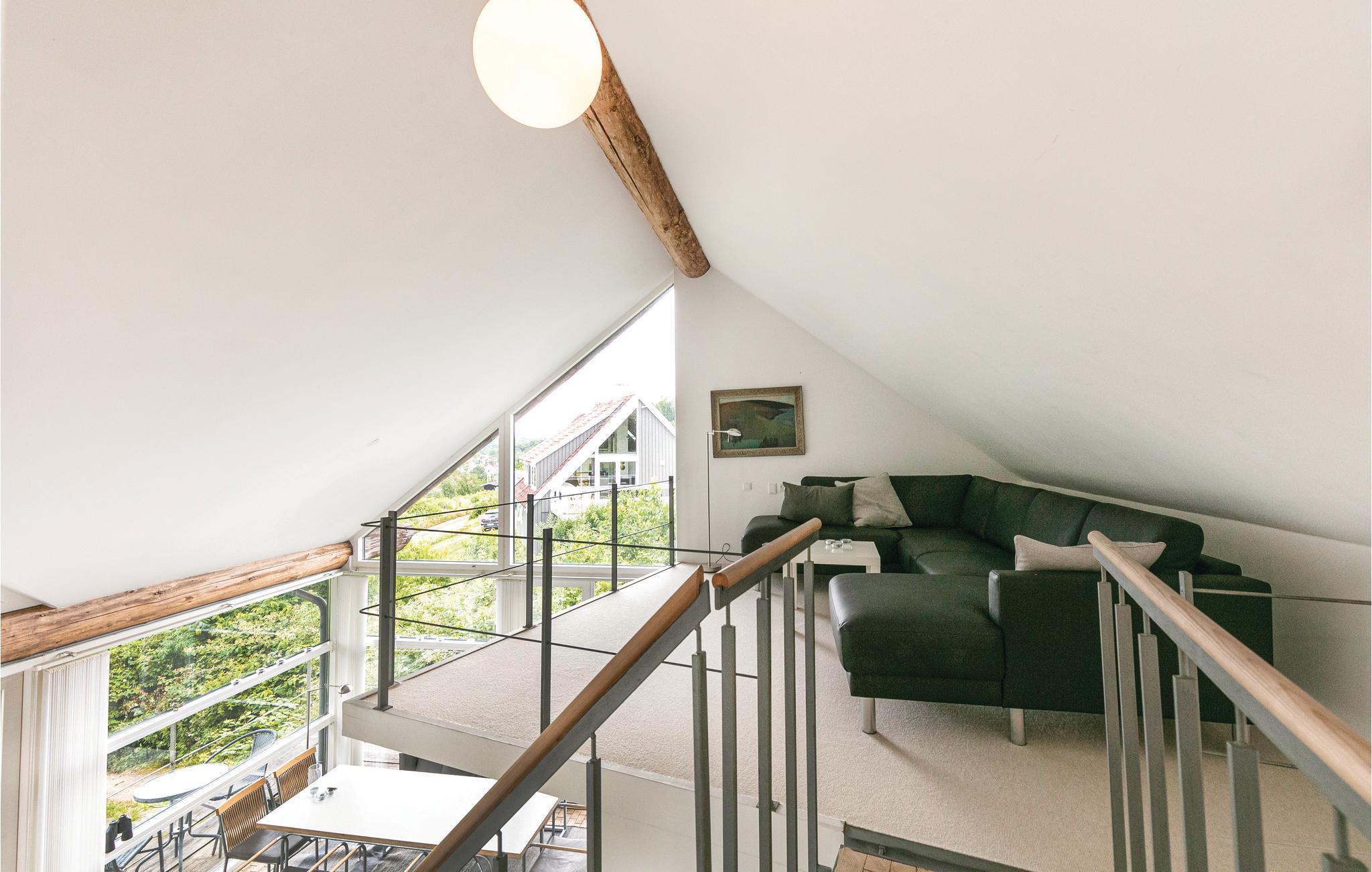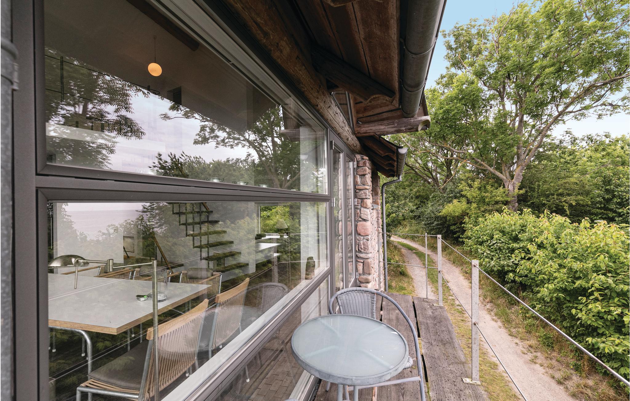 Helt unikt og meget attraktivt beliggende luksushus i to plan og med skøn panoramaudsigt over Østersøen. Huset ligger højt på en åben naturgrund og er bygget af rustikke bjælker og er meget moderne og smagfuldt indrettet i et lyst og åbent miljø med flere trappepartier. Fra det lækre åbne køkken er der en flot havudsigt. Fra husets spisestue har I opgang til en hems, som også er en del af opholdsstuen og kan bruges til afslapning og hygge. Husets mange trapper samt højdeforskelle gør det ikke egnet til mindre børn. Dette flotte liebhaverhus har en højtbeliggende balkon samt en dejlig træterrasse, hvor I kan nyde ferien i afslappede omgivelser.
