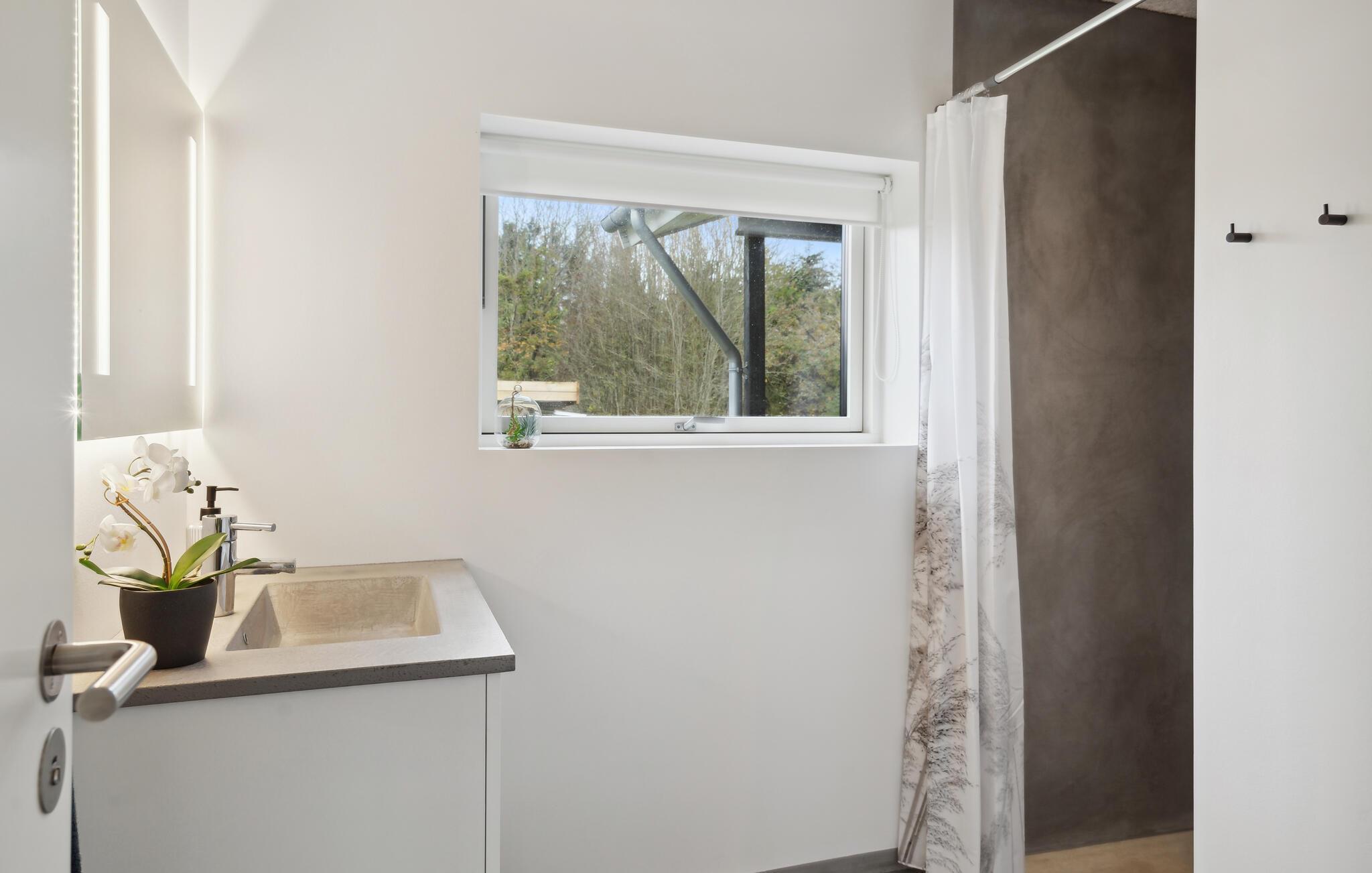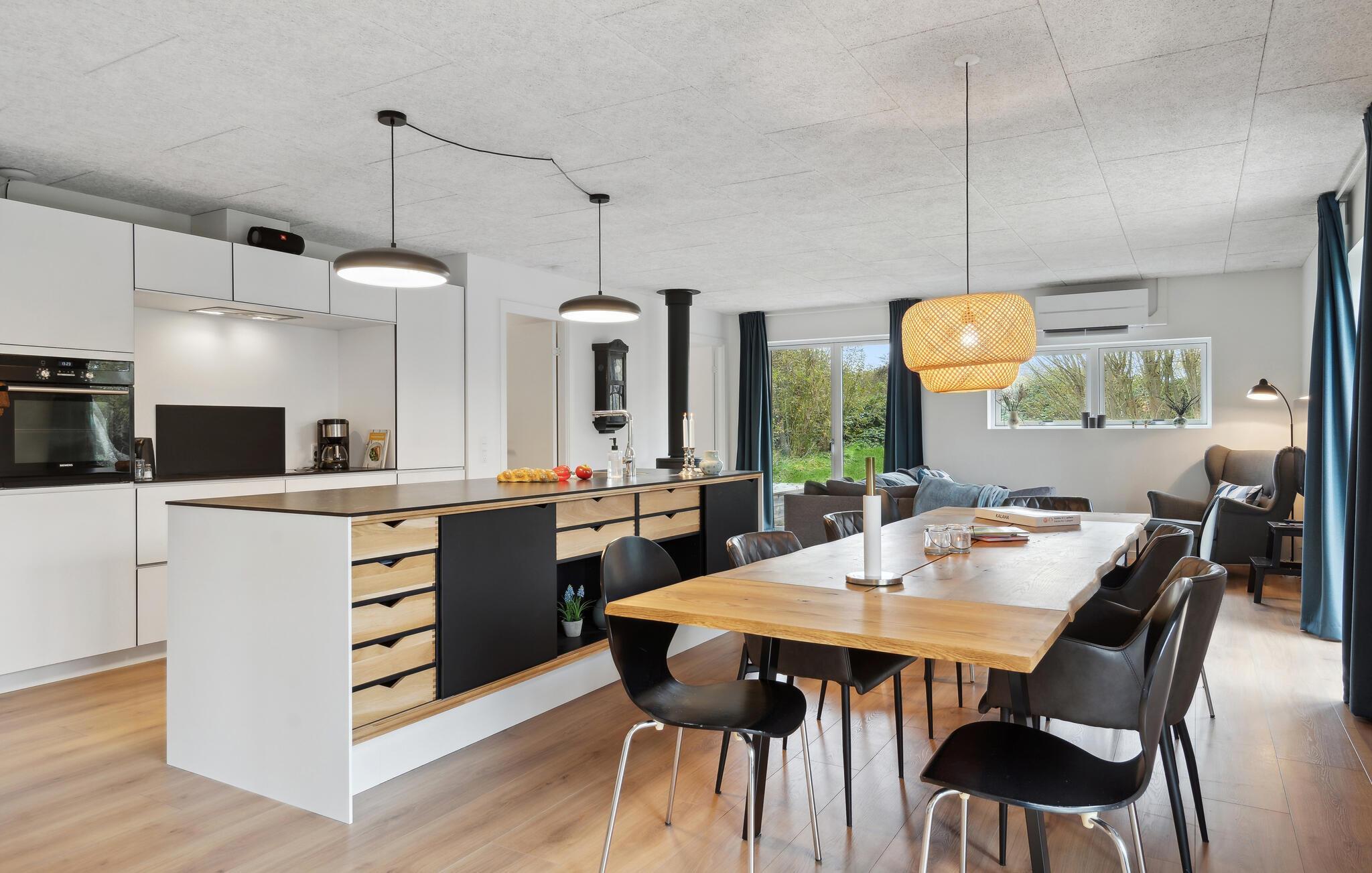 Tag til Livbjerggård Strand og mærk skuldrene sænke sig i dette æstetisk moderne hus, som venter på jer med en gunstig beliggenhed nær fjorden. I vil straks føle jer hjemme i de smagfuldt indrettede værelser. I det store køkken-alrum kan I slappe af sammen i den indbydende sofa og sludre længe, mens flammerne knitrer sagte i brændeovnen. Nyd solen på terrassen og rund dagen af med kolde drikke og lækre grillretter, mens en dukkert i vildmarksbadet byder på ren afslapning.