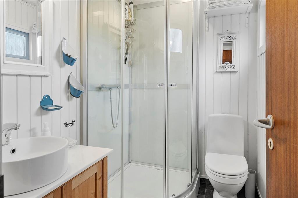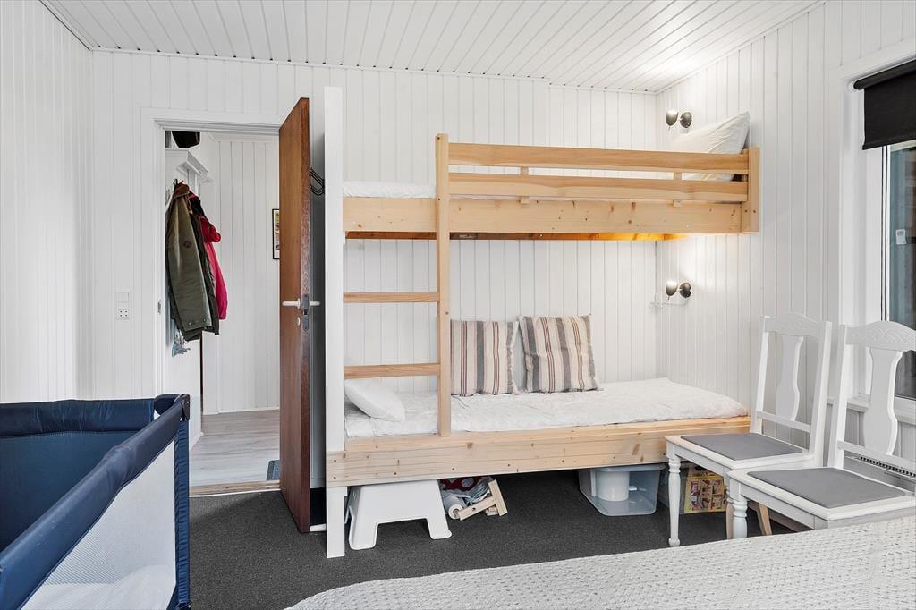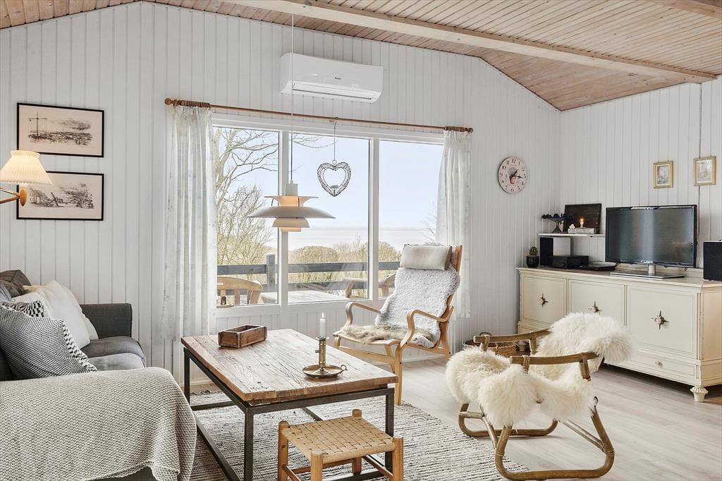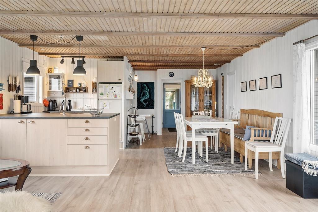 Hvis du elsker klassiske ferieboliger med en hyggelig atmosfære, vil du føle dig godt tilpas i opholdsrummet i dette hus, der er indrettet med hvidmalede trævægge, et spisebord med en smuk bænk og et veludstyret køkken. Polstersædegruppen er placeret direkte ved det store vindue mod vest, så du kan nyde den smukke udsigt over fjorden, mens du slapper af. Underholdning og variation sørges der for med en fladskærms-tv, en DVD-afspiller og Chromecast. Varmepumpen med ekstra kølefunktion sikrer behagelige temperaturer året rundt. Badeværelset har et brusehjørne. De to soveværelser har plads til fire voksne og to børn.