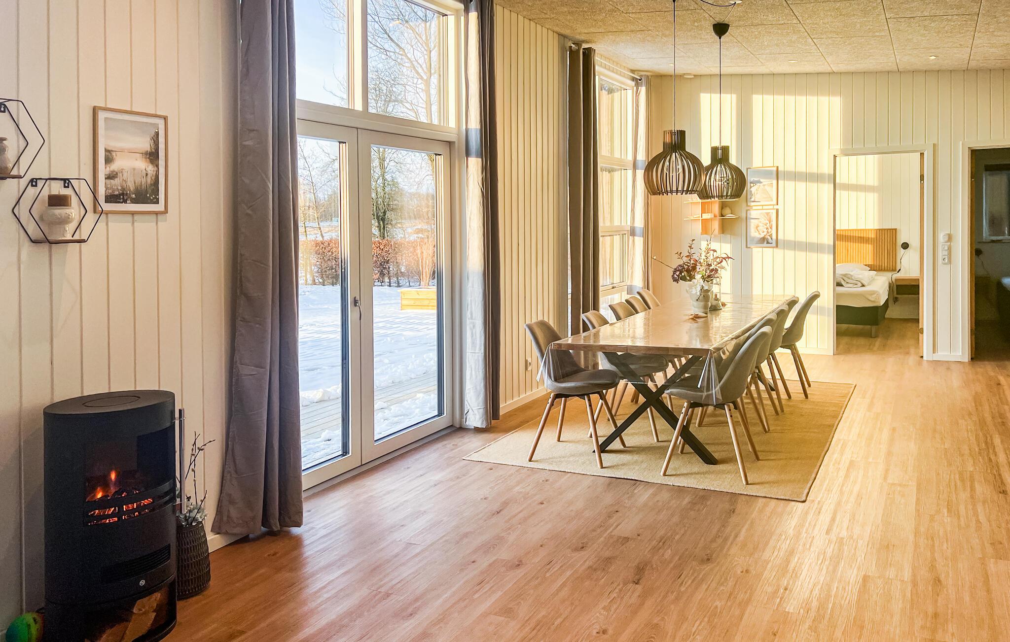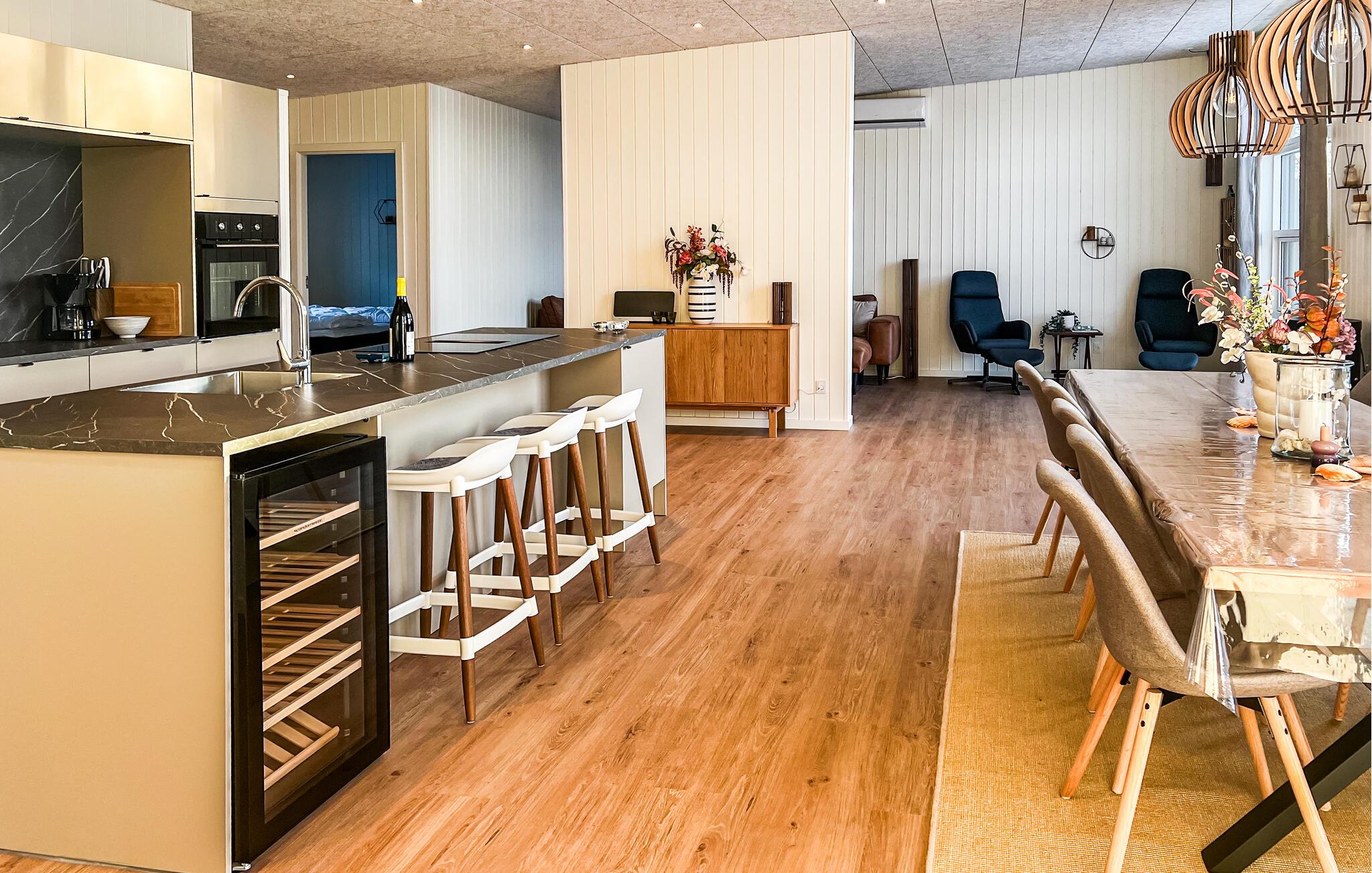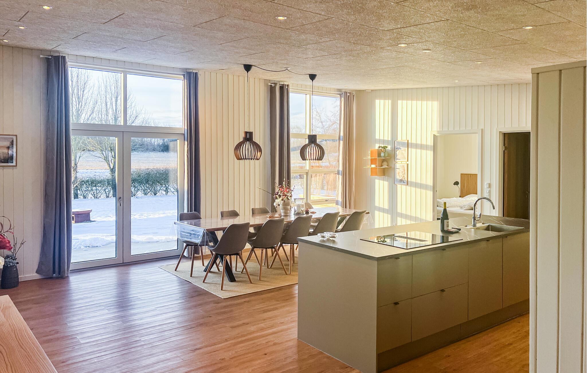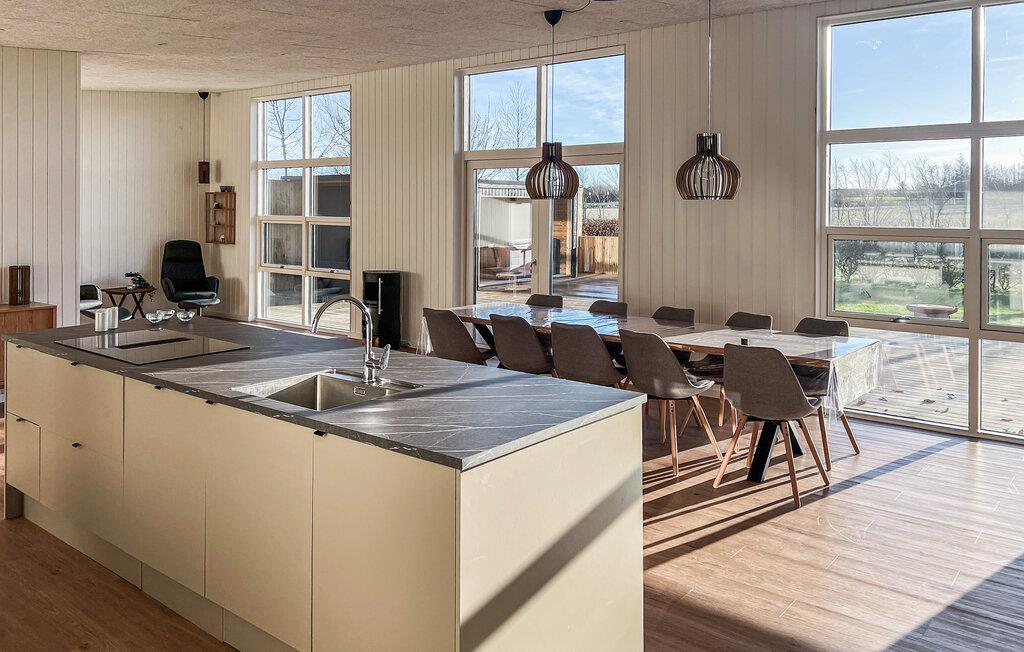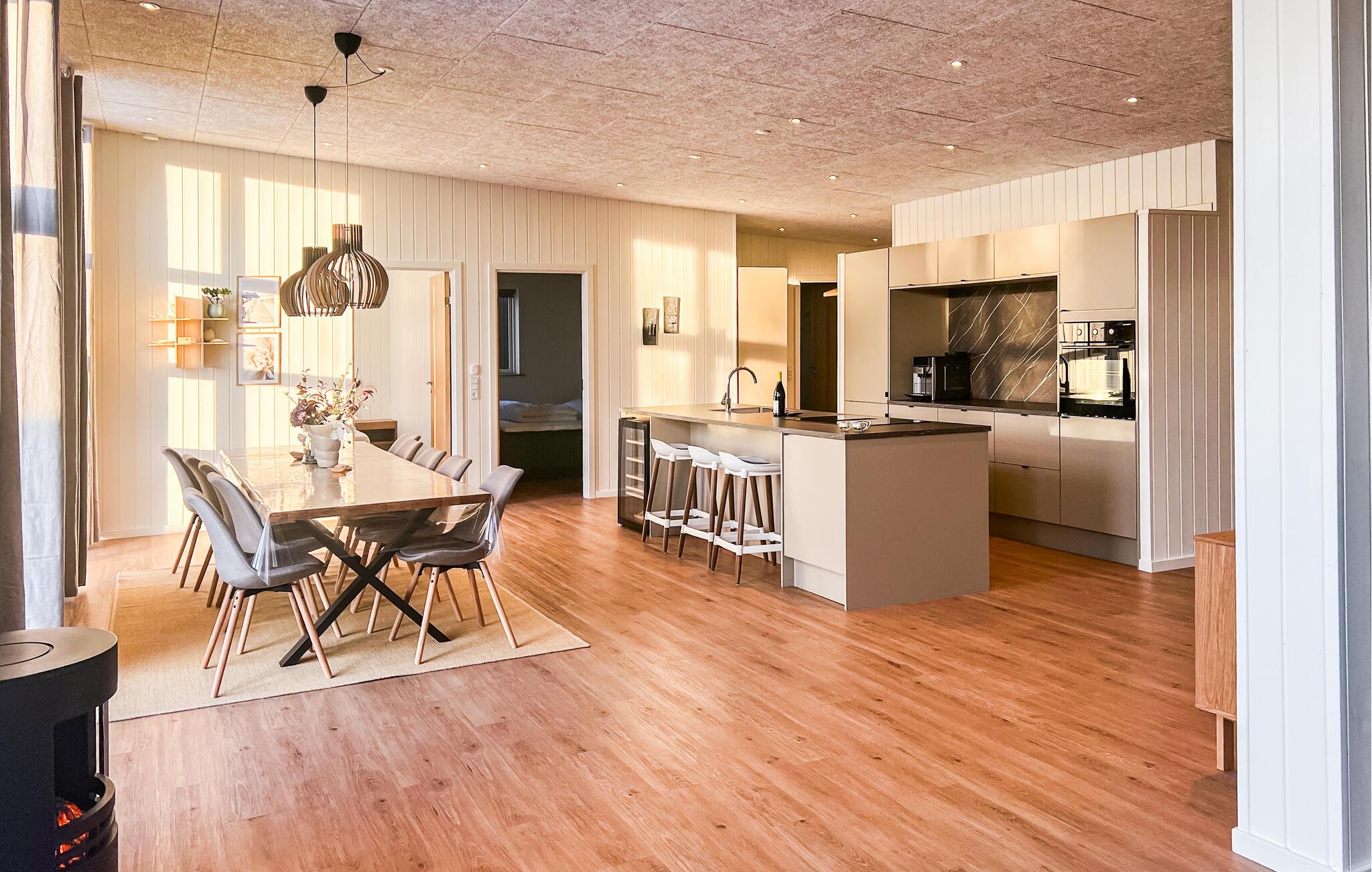 Slå jer ned i stuens behagelige sofa og lad blikket vandre over det åbne landskab bag grunden. I kan også sætte jer godt til rette i de behagelige lænestole med en god bog. Når I vender hjem fra dagens eventyr, er det hyggeligt at give sig god tid til madlavningen i det lækre køkken med øen midtfor, hvor I har et dejligt lys og det skønne blik ud mod haven. Efter I har kreeret en dejlig feriemenu, kan I dække op ved spisebordet, og trænger I derefter til at komme op at røre jer, er der både billard, airhockey og dart i aktivitetsrummet.