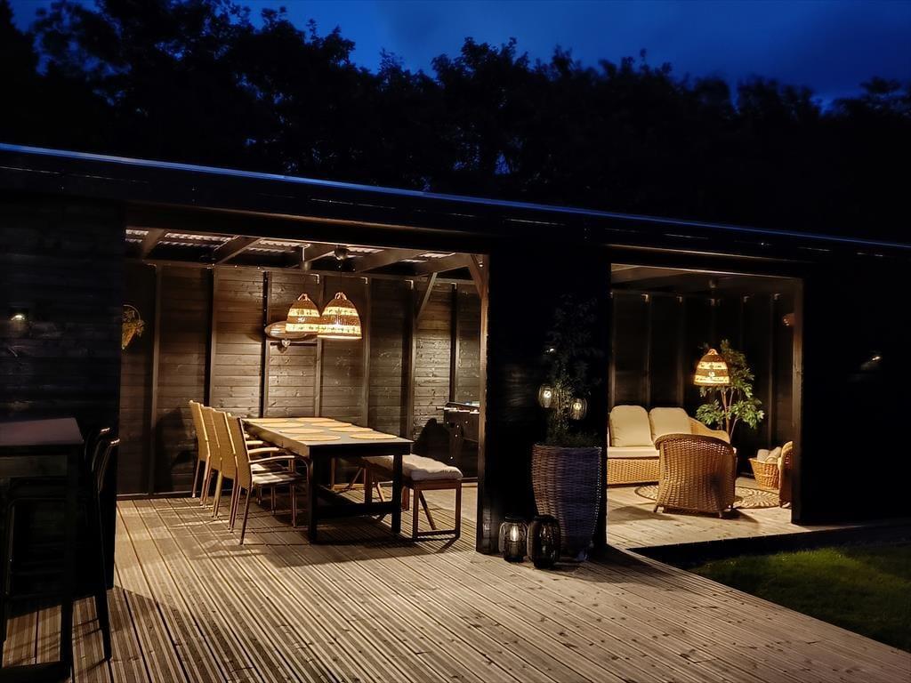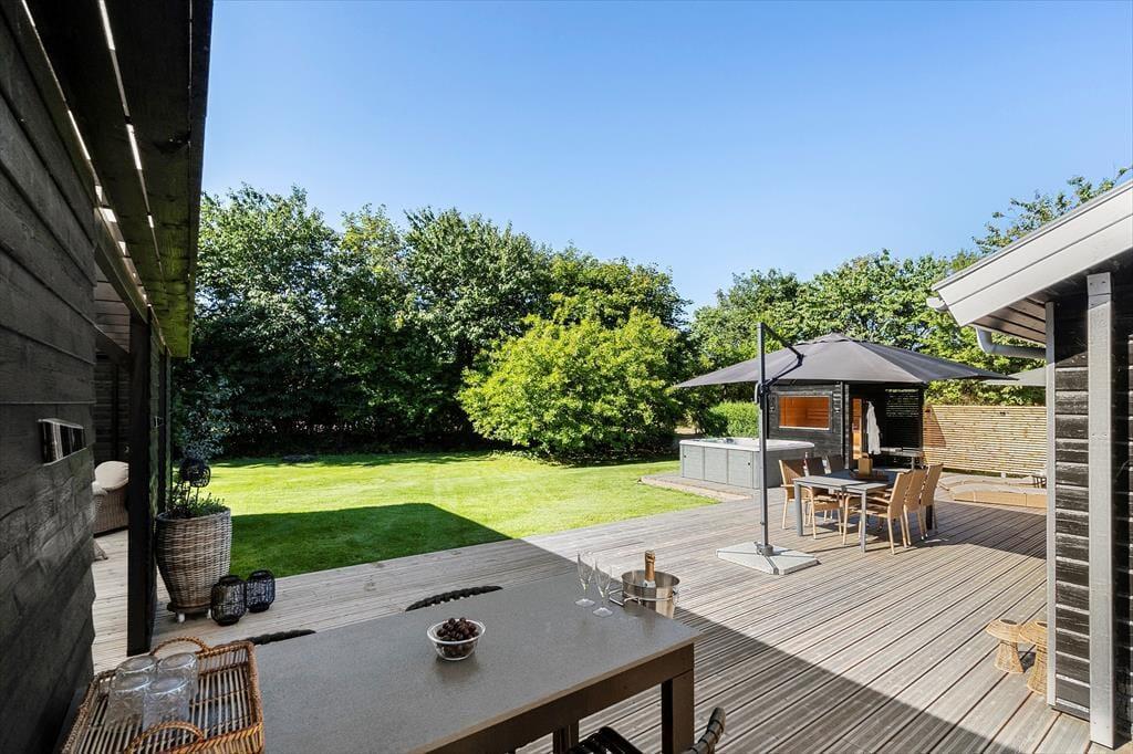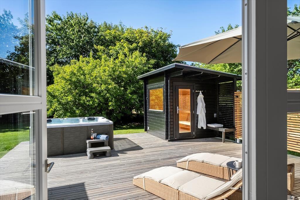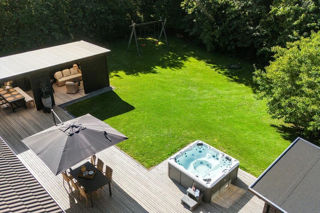 Det er udenfor, at Fyrrealle 3 for alvor folder sig ud som et ferieparadis. Her kan I nyde livet på en fuldstændig ugeneret grund med flere dejlige terrasser, hvor der både er plads til leg, afslapning og forkælelse. I det store udendørs wellnessområde finder I en opvarmet spa til seks personer, sauna og solopvarmet udebruser – den perfekte kombination efter en tur i Vesterhavet. Under det overdækkede loungeområde kan I trække i skygge, spille bordfodbold eller tilberede aftensmaden på gasgrillen, mens duften af sommer breder sig. På den anden terrasse kan der spilles bordtennis og dart, og børnene kan more sig på den dobbelte gynge i haven. På den indhegnede grund vokser både blommer og mirabeller, som I frit kan nyde i sæsonen – en lille smag af den danske sommer lige uden for døren.