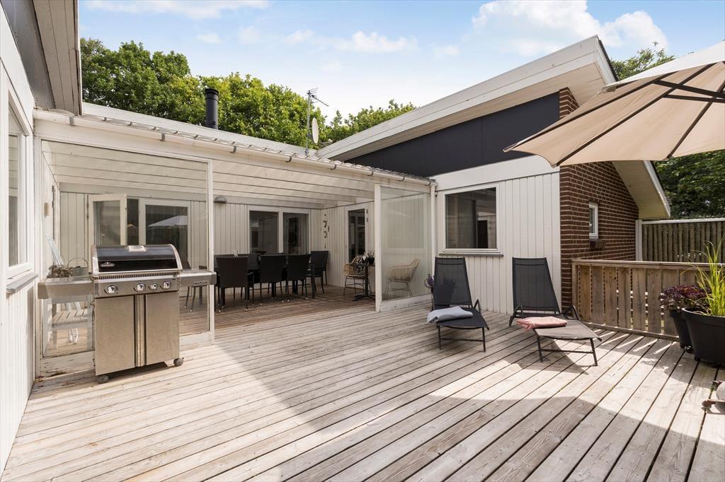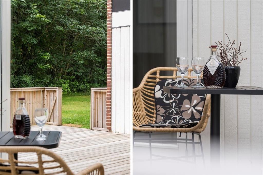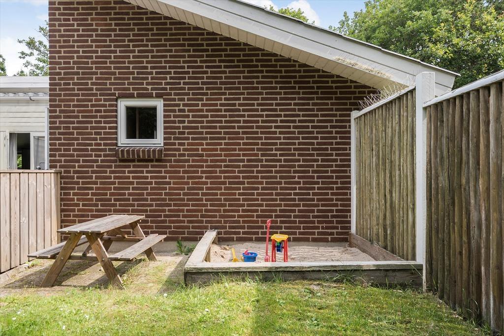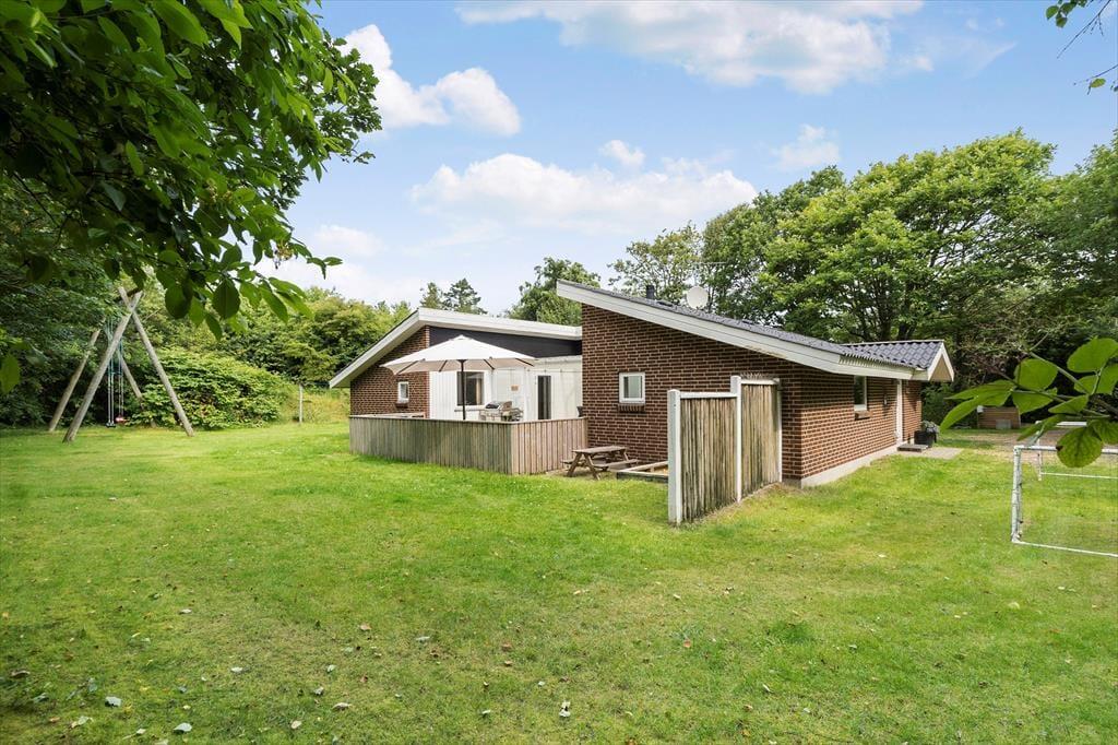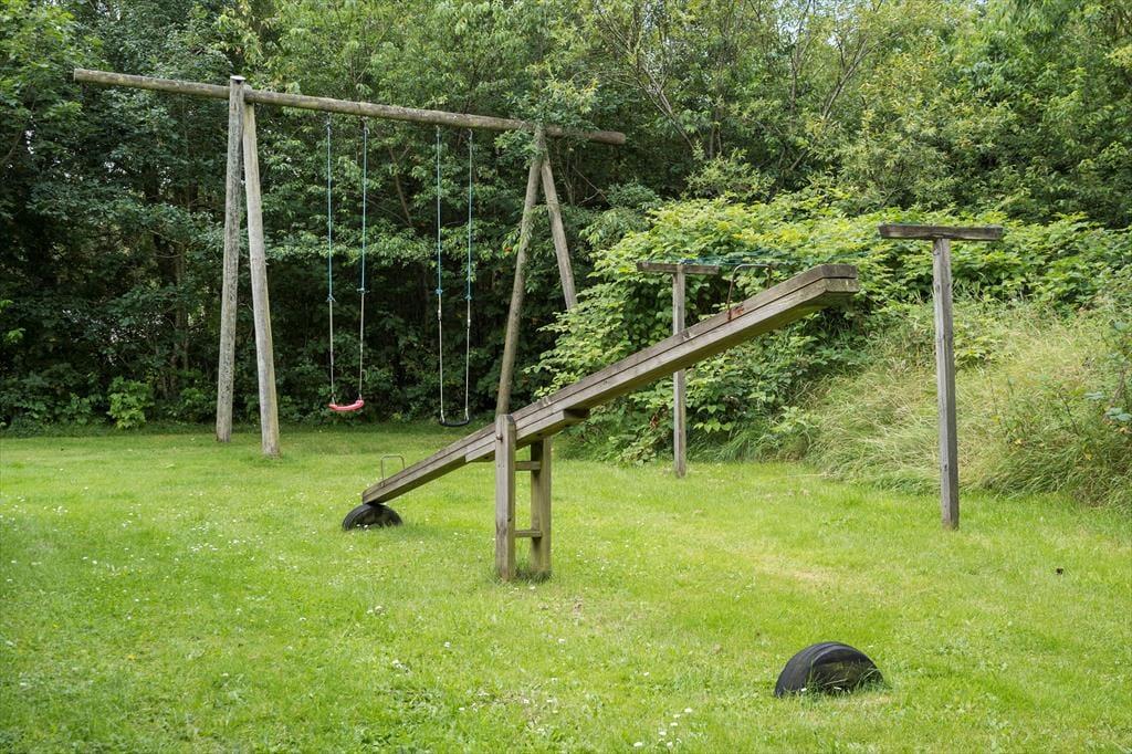 Den store træterrasse ligger i læ af husets tre længer, og det inderste område er helt overdækket, så det føles næsten som at sidde i en udestue. Ud mod græsplænen er terrassen lukket af med hegn, hvilket både hundeejere og småbørnsforældre kan værdsætte. Haven omkranses af høje træer, og med sandkasse, vippe, gynger og fodboldmål er der masser af underholdning til de yngste feriegæster. Kommer I i elbil, er det rart, at der er lader ved huset.