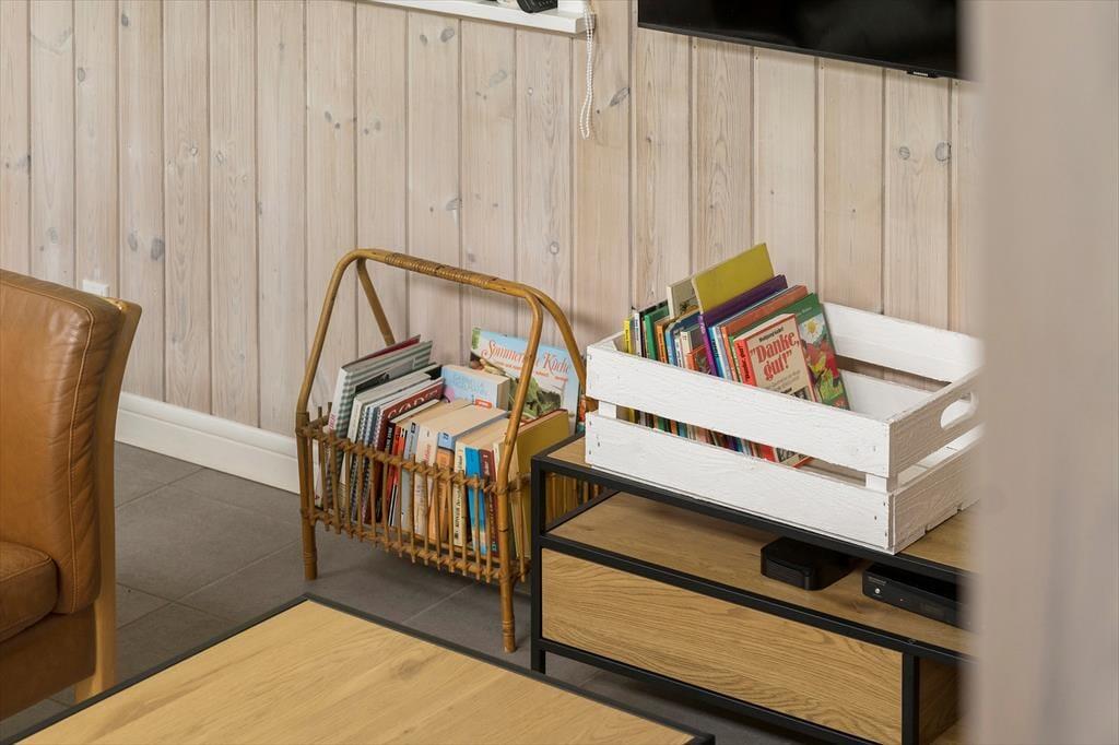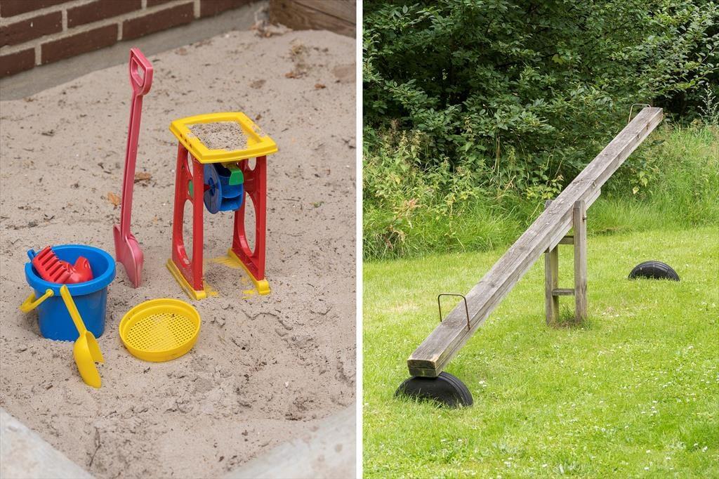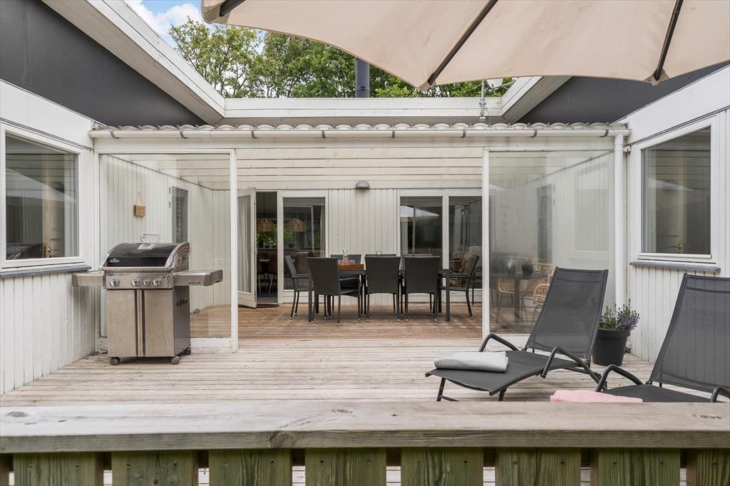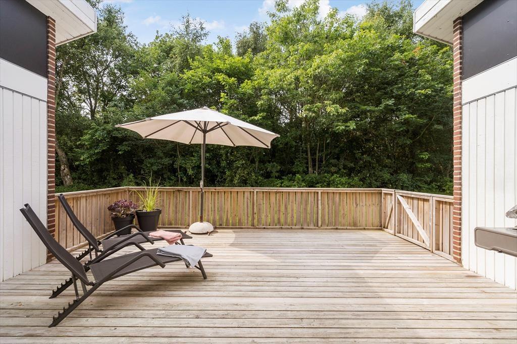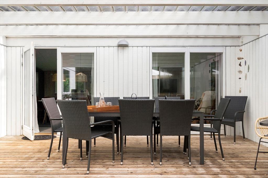 Den store træterrasse ligger i læ af husets tre længer, og det inderste område er helt overdækket, så det føles næsten som at sidde i en udestue. Ud mod græsplænen er terrassen lukket af med hegn, hvilket både hundeejere og småbørnsforældre kan værdsætte. Haven omkranses af høje træer, og med sandkasse, vippe, gynger og fodboldmål er der masser af underholdning til de yngste feriegæster. Kommer I i elbil, er det rart, at der er lader ved huset.