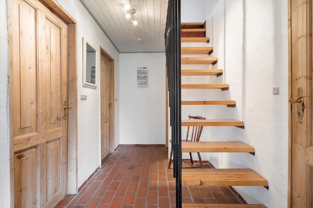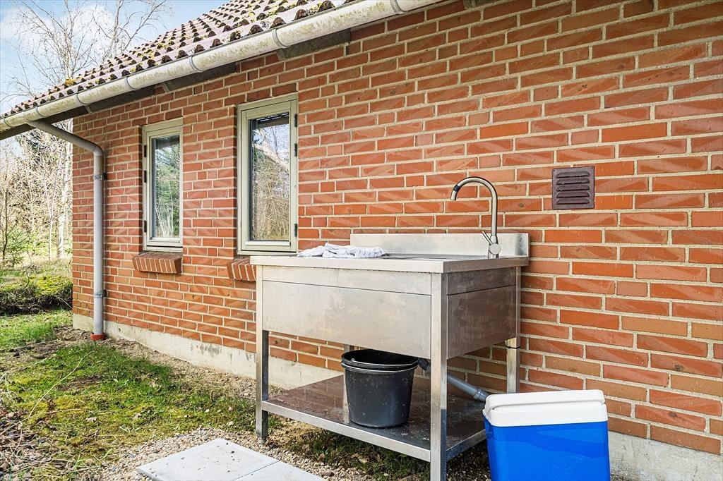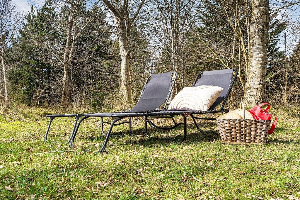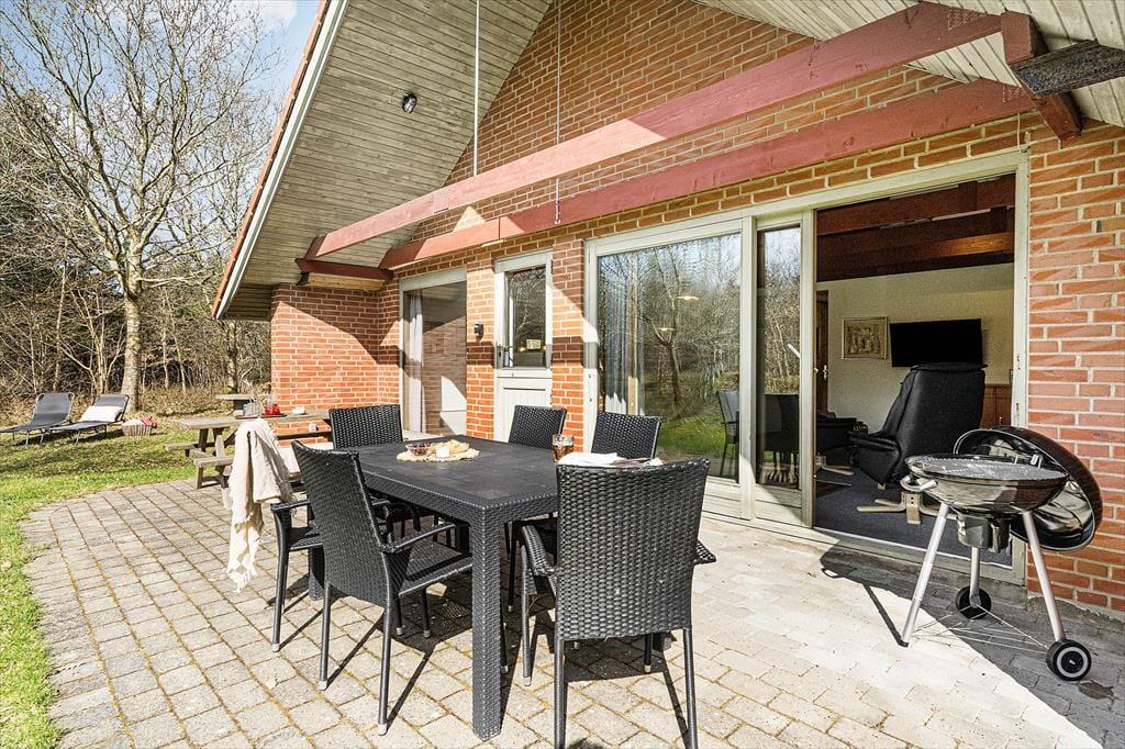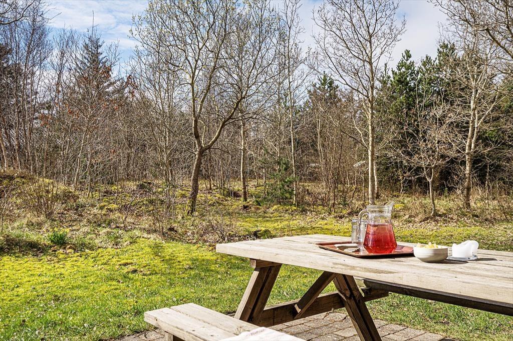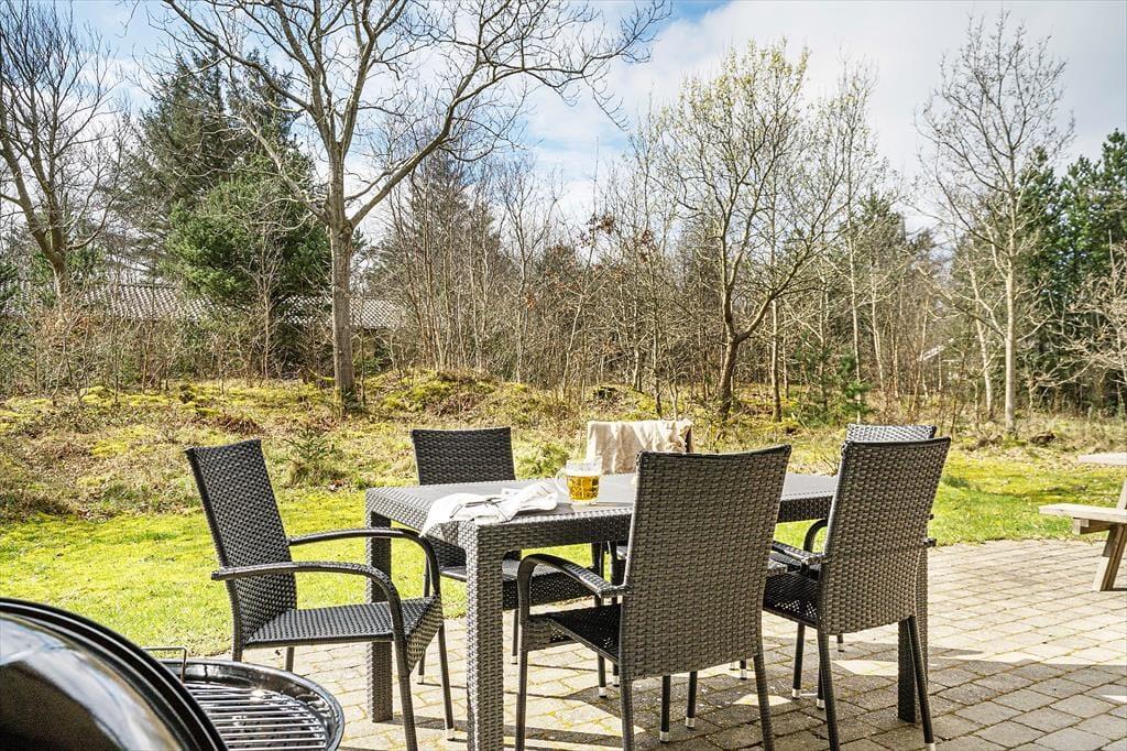 Mod syd har huset en delvist overdækket terrasse med havemøbler og liggestole. Den store naturgrund er 2500 m2 og det meste af grunden er beplantet eller selvsået med flere forskellige løvtræer. De mange træer giver læ for vinden og skærmer huset mod naboerne, men der er stadig rig mulighed for at sole sig på terrassen. Her er masser af muligheder for at børnene kan lege gemmelege eller man kan spise frokost et skyggefuldt sted under trækronerne. Man kan opholde sig relativt ugenert i huset og på terrassen. Der er desuden parkeringsplads lige ved huset.