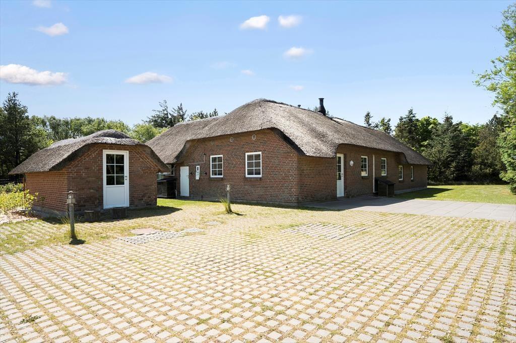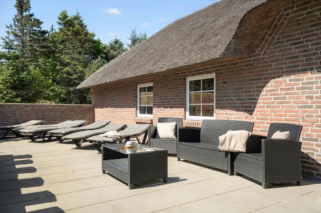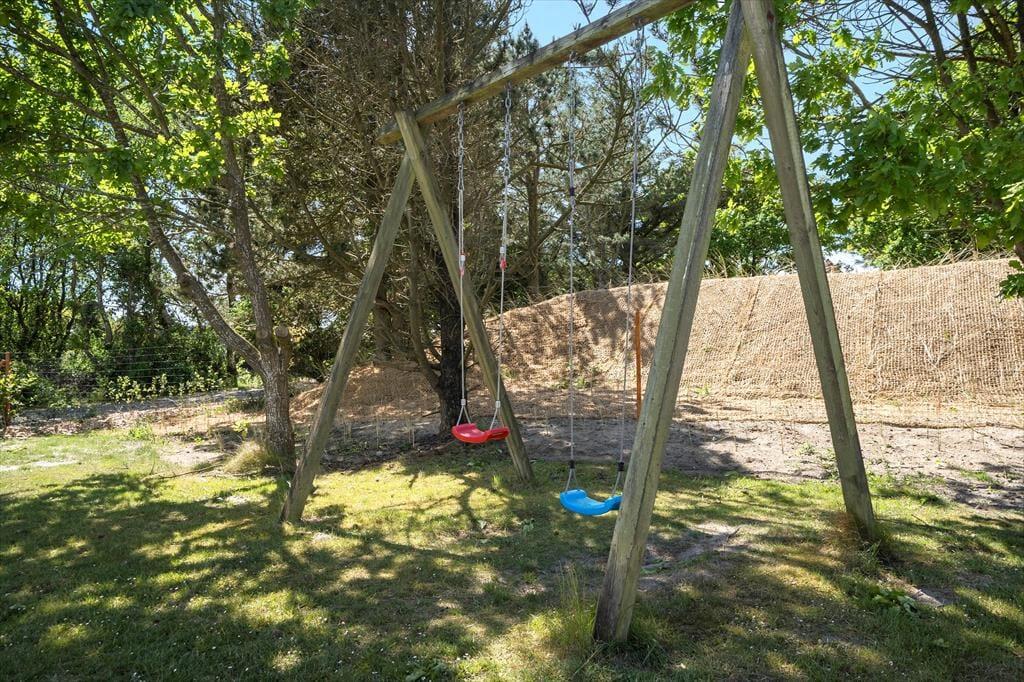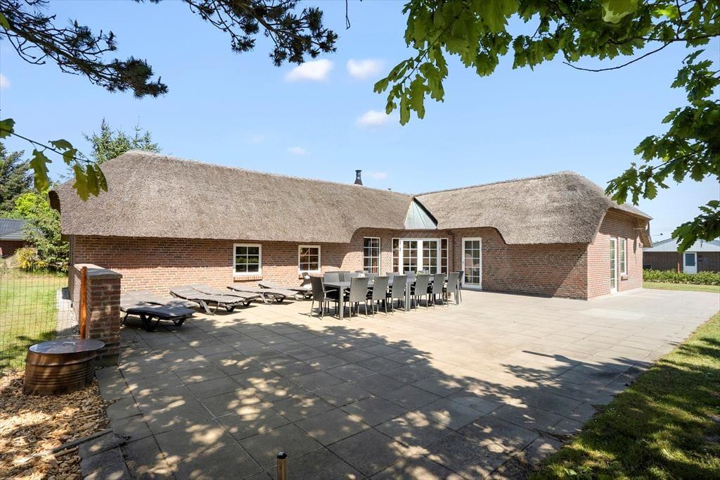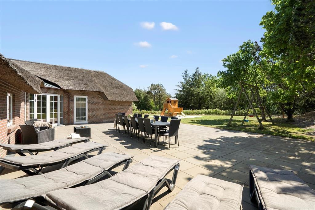 Det stråtækte rødstenshus ligger smukt placeret på en 2300 m2 stor grund, der skærmes mod vest af tæt bevoksning. Græsplænen er god og plan, så den indbyder til boldspil og andre aktiviteter. Der er også sandkasse og gynger til de yngste feriegæster – og legefaciliteterne er for øvrigt smart placeret, så de voksne kan sidde lige i nærheden på den flisebelagte terrasse. Takket være den sydvendte placering og generøse størrelse er det muligt at finde en solrig terrasseplads det meste af dagen, og om aftenen kan du forkæle resten af selskabet med friskgrillede lækkerier, når I sidder bænket om havebordene.