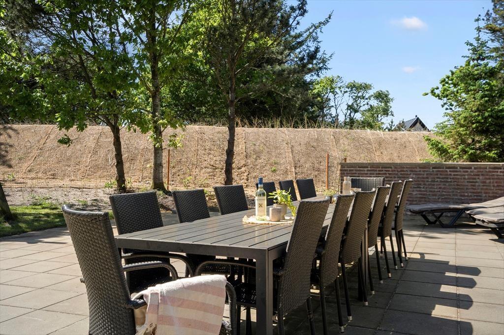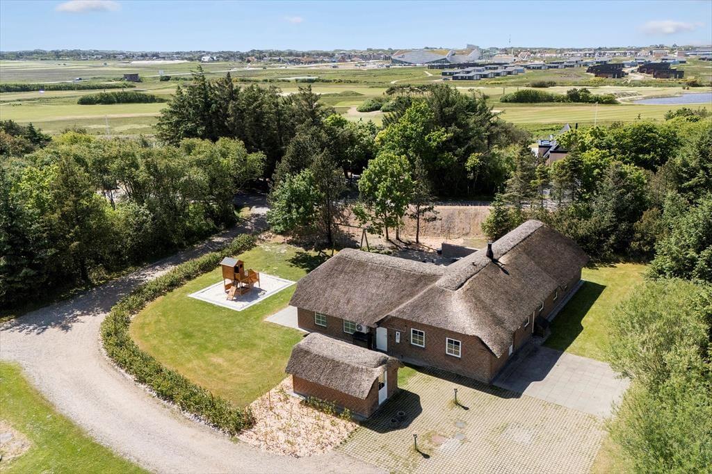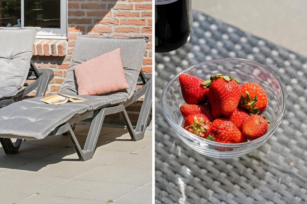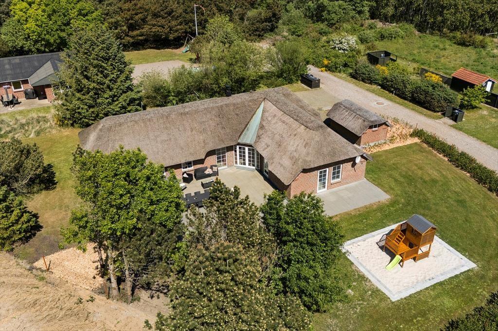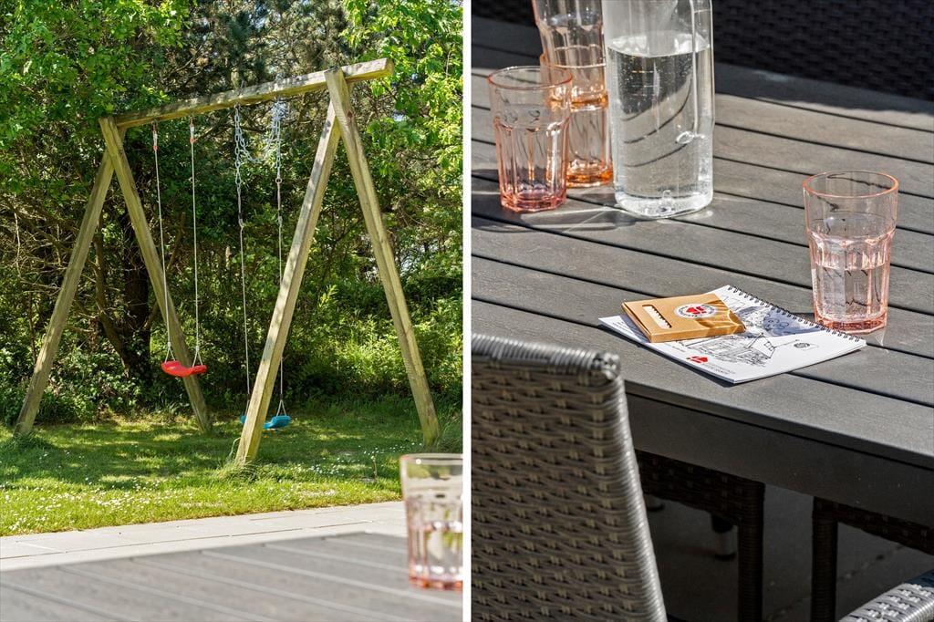 Det stråtækte rødstenshus ligger smukt placeret på en 2300 m2 stor grund, der skærmes mod vest af tæt bevoksning. Græsplænen er god og plan, så den indbyder til boldspil og andre aktiviteter. Der er også sandkasse og gynger til de yngste feriegæster – og legefaciliteterne er for øvrigt smart placeret, så de voksne kan sidde lige i nærheden på den flisebelagte terrasse. Takket være den sydvendte placering og generøse størrelse er det muligt at finde en solrig terrasseplads det meste af dagen, og om aftenen kan du forkæle resten af selskabet med friskgrillede lækkerier, når I sidder bænket om havebordene.