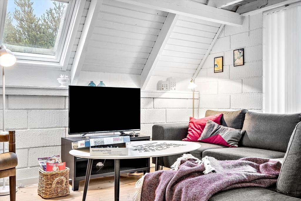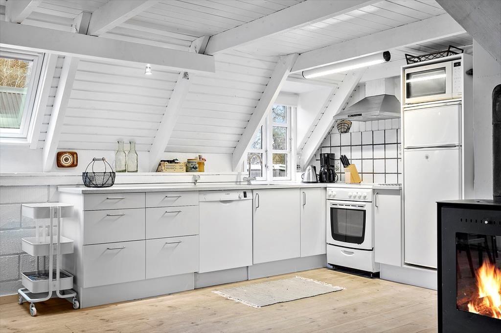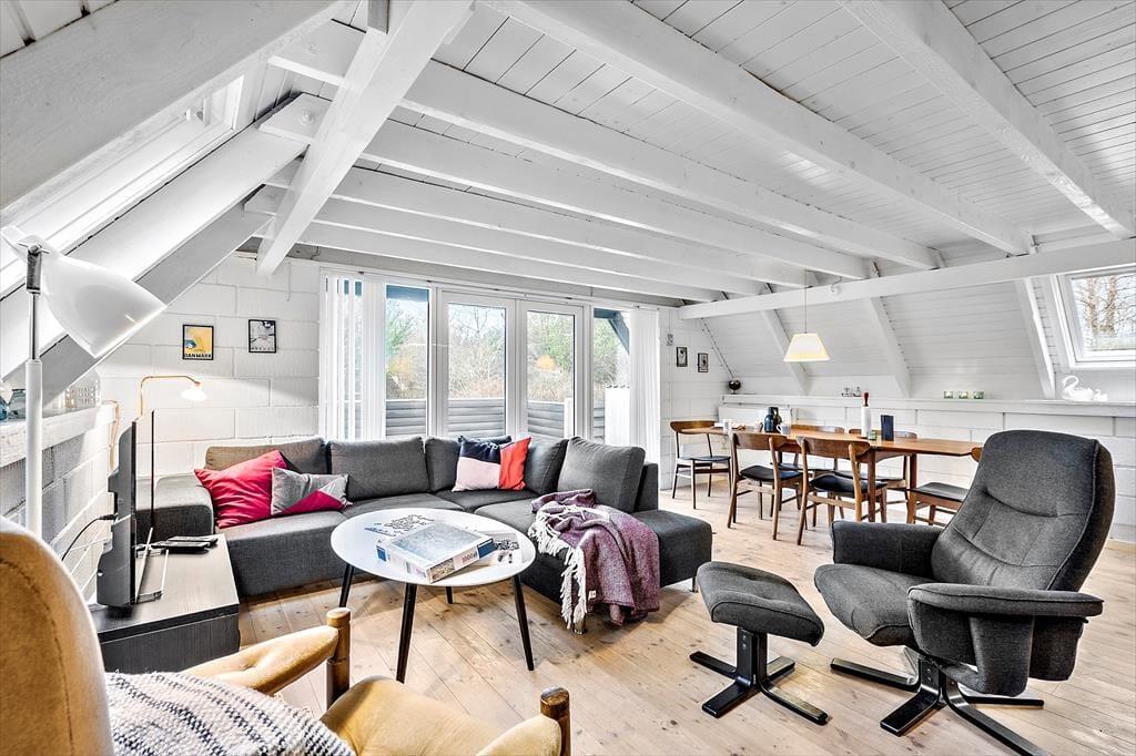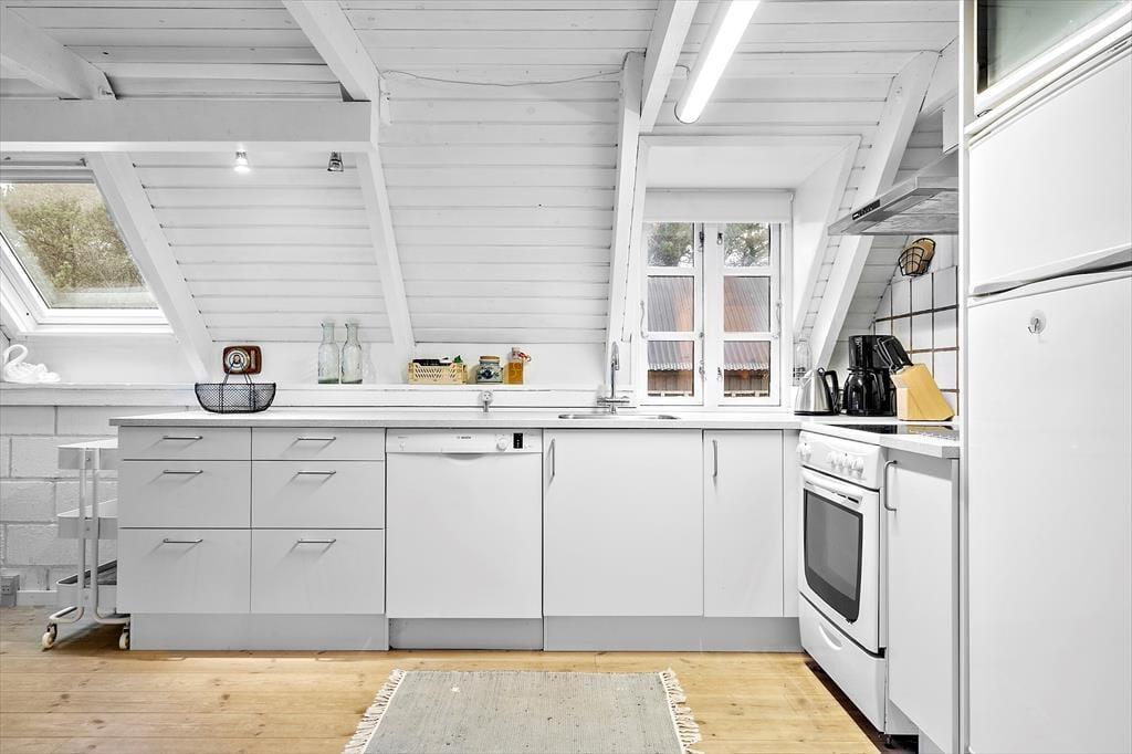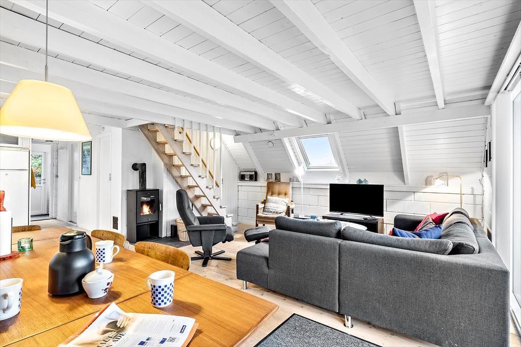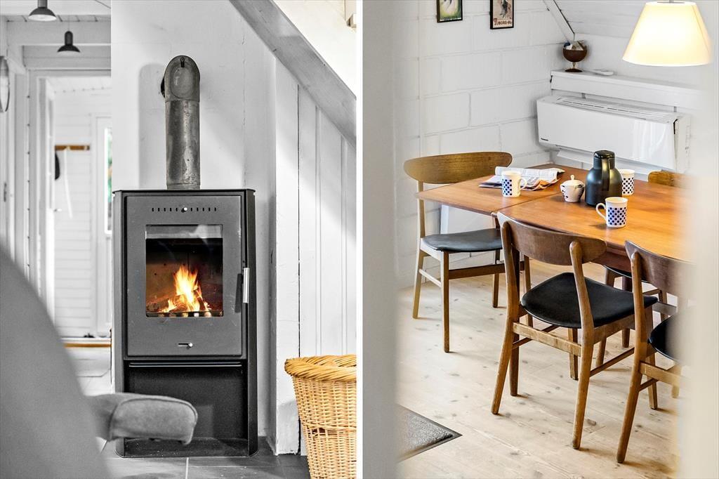 Sommerhuset er et af den slags, man straks føler sig hjemme i, lige fra man hænger jakken i entréen og træder ind i den hyggelige stue. Her er der brændeovn og varmepumpe til eventuelle kølige dage, og i det åbne køkken har I alt, hvad I skal bruge, når der skal laves mad. Efter måltidet kan I putte tallerknerne i opvaskemaskinen og vende tilbage til sofaen for at færdiggøre puslespillet, læse i jeres medbragte krimier eller gå i gang med at se film på fladskærms-tv’et. På badeværelset kan I tage brusebad og børste tænder, og når det er sengetid, er der et soveværelse i stueplan og to på førstesalen.