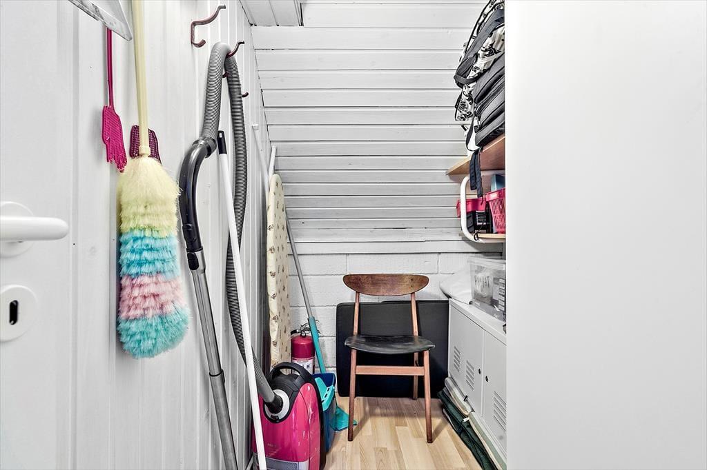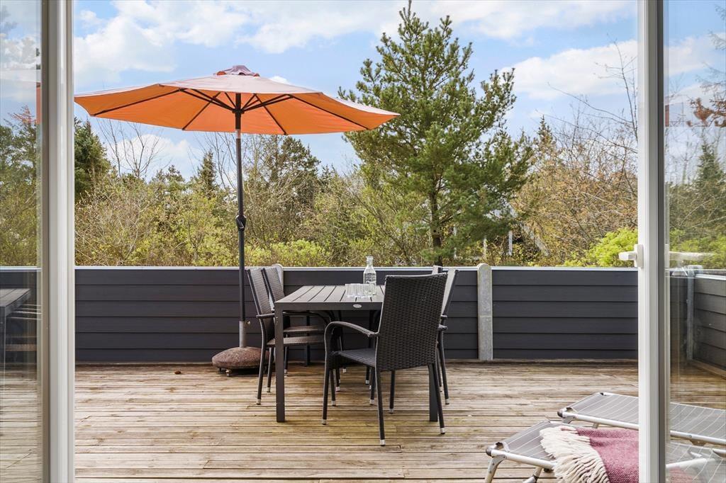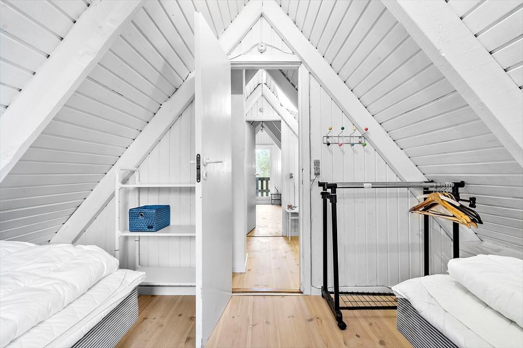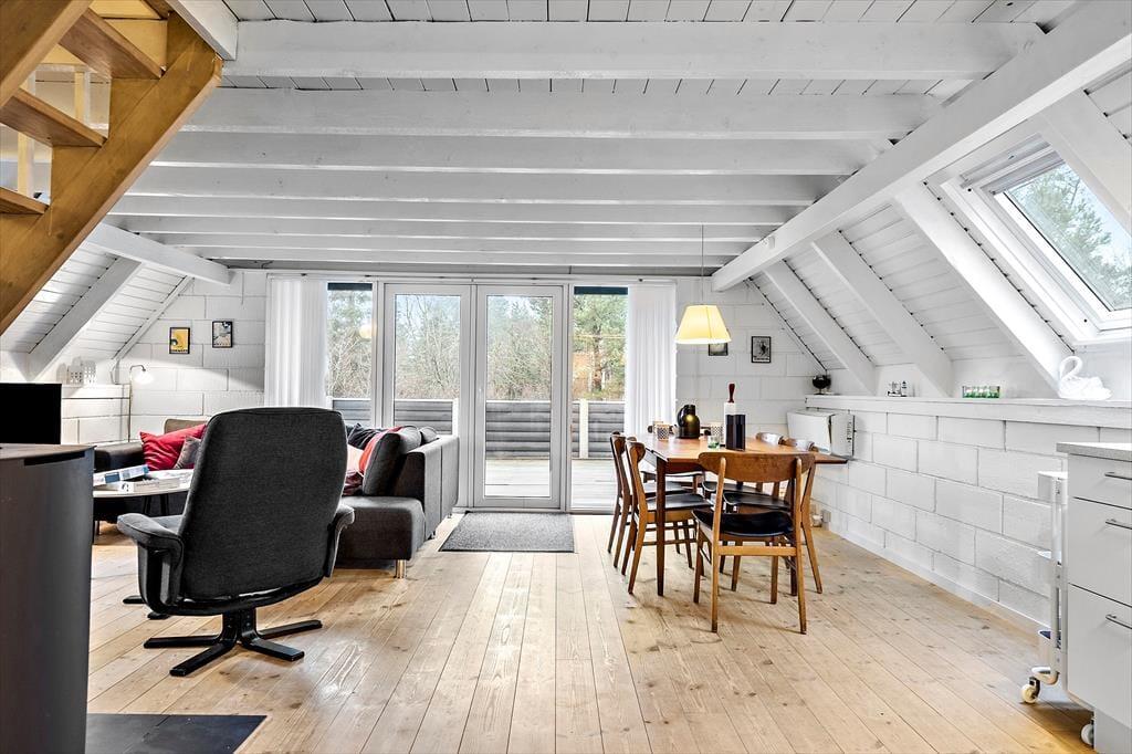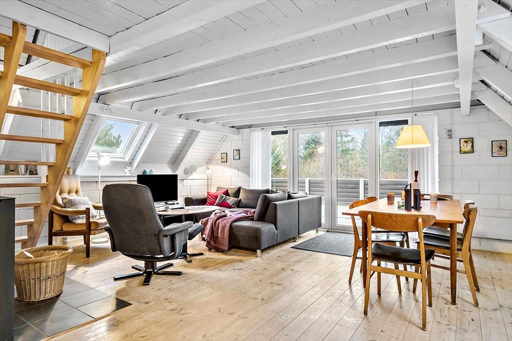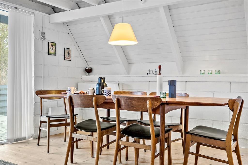 Sommerhuset er et af den slags, man straks føler sig hjemme i, lige fra man hænger jakken i entréen og træder ind i den hyggelige stue. Her er der brændeovn og varmepumpe til eventuelle kølige dage, og i det åbne køkken har I alt, hvad I skal bruge, når der skal laves mad. Efter måltidet kan I putte tallerknerne i opvaskemaskinen og vende tilbage til sofaen for at færdiggøre puslespillet, læse i jeres medbragte krimier eller gå i gang med at se film på fladskærms-tv’et. På badeværelset kan I tage brusebad og børste tænder, og når det er sengetid, er der et soveværelse i stueplan og to på førstesalen.
