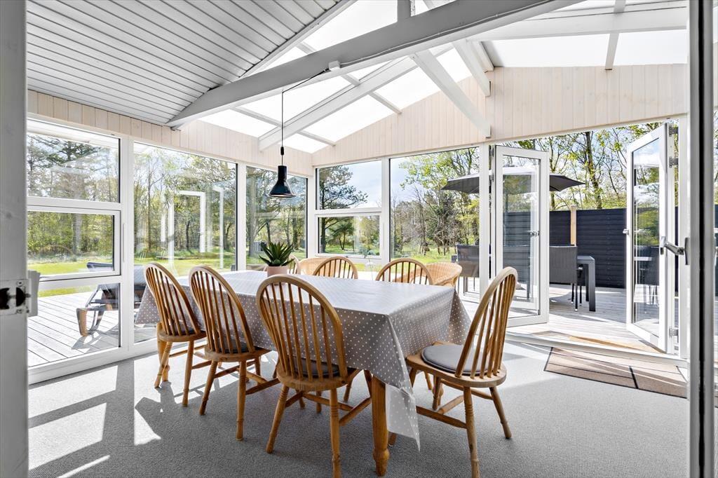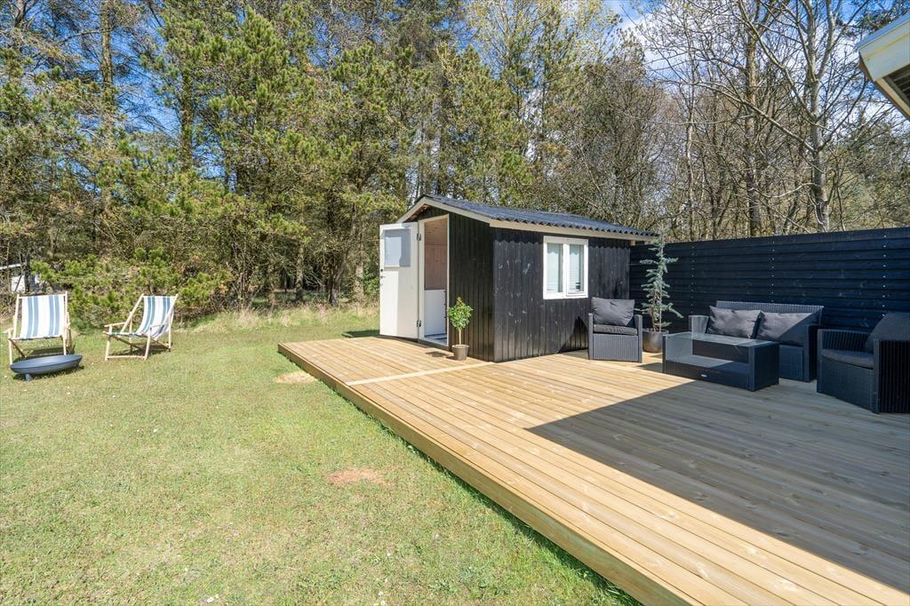 Udestuen fungerer som en god mellemstation, når I vil nyde solen på kølige årstider, og på en sommeraften kan det også være den helt rette opholdsplads. I godt vejr er det derimod husets store terrassemiljø, der er det foretrukne valg – hvis ikke I flytter driverlivet over på den anden lækre træterrasse, der ligger mellem de to annekser. Havegrunden byder på en stor græsplæne og blandet bevoksning, og med bålsted, hvor der mulighed for at grille skumfiduser til børnene og I har masser af plads at hygge jer på. Til lystfiskerne er der et udendørs fiskerensebord, og i garagen står der en 100 liters fryser til dage med en heldig fangst.