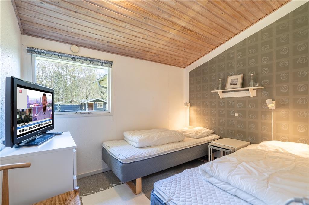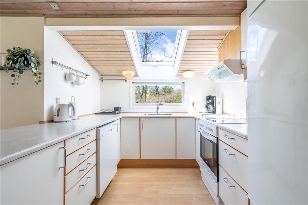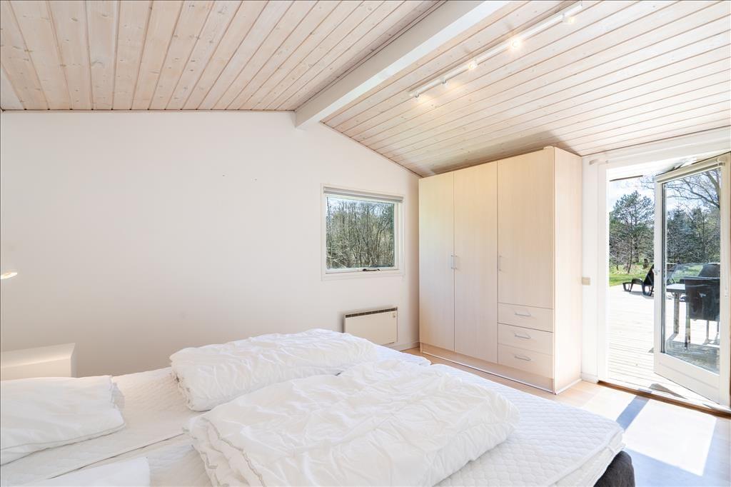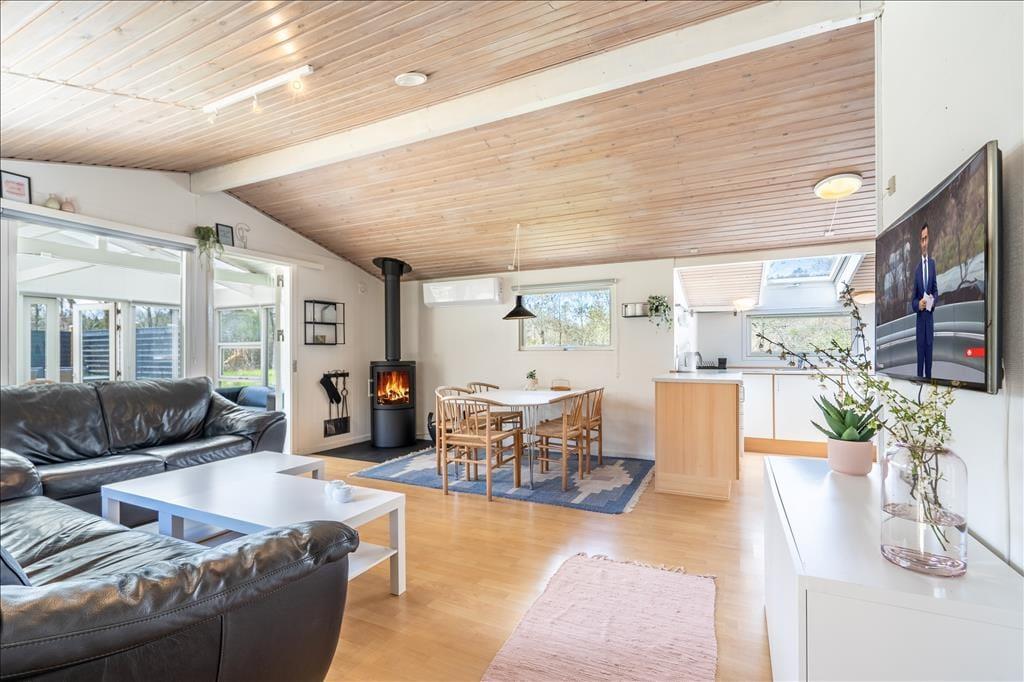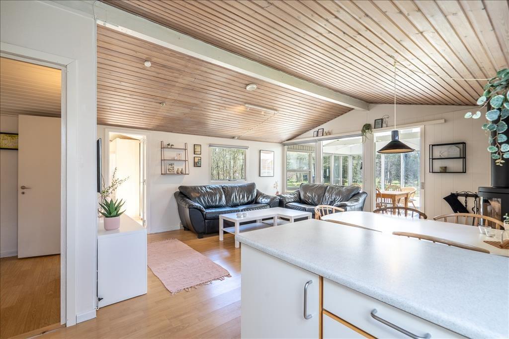 Sommerhuset er et charmerende byggeri på 92 m2, og dertil to annekser, hvoraf det ene kan bruges til overnatning, og det andet er privat. Huset rummer seks voksne og to børn inden døre, og to hunde er også velkomne, hvis familiens firebenede venner skal med på ferie. I selve sommerhuset har I tre gode soveværelser og et badeværelse med sauna at gøre godt med, og endelig er der opholdsafdelingen, der består af stue og køkken i åben forbindelse – og herfra har I adgang til en stor og velisoleret udestue. Farvetonerne er lyse overalt i huset, og med loft til kip, ovenlysvinduer, brændeovn og komfortabelt møblement er der lagt op til nogle utroligt skønne dage.
