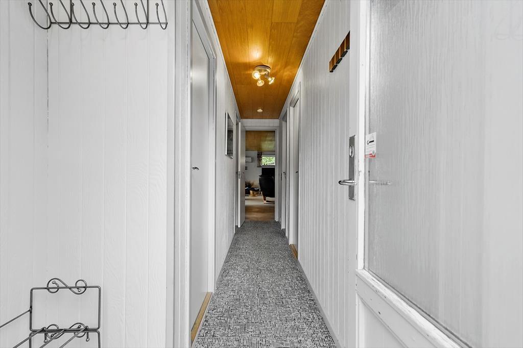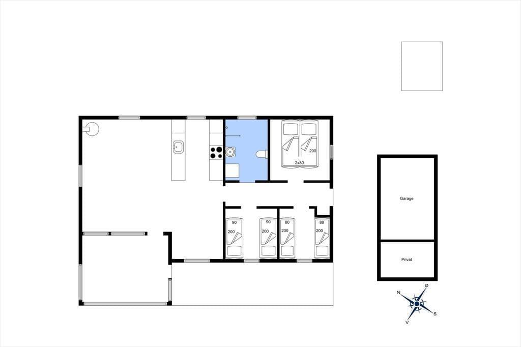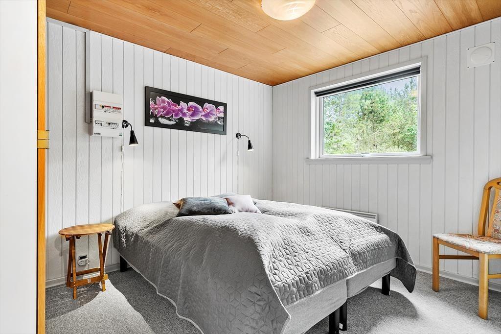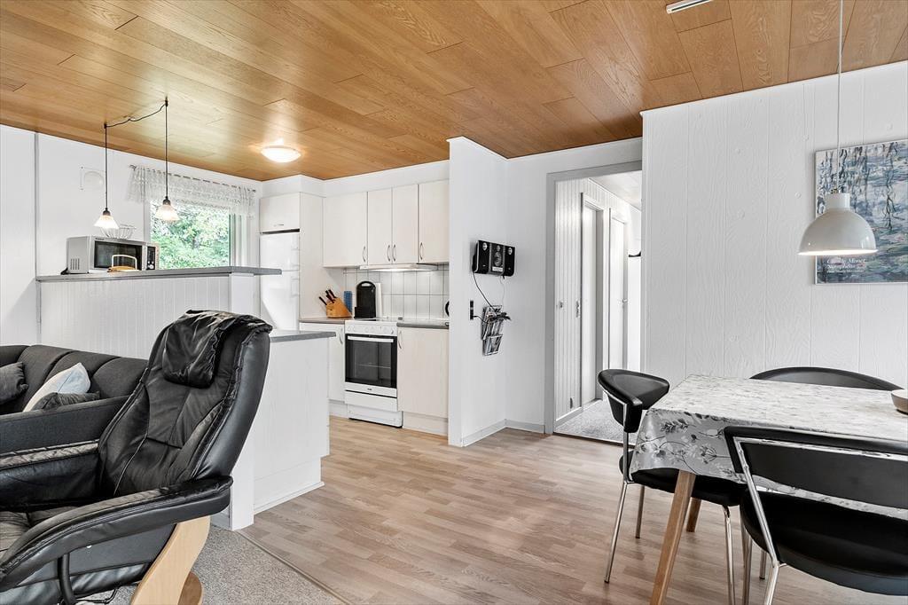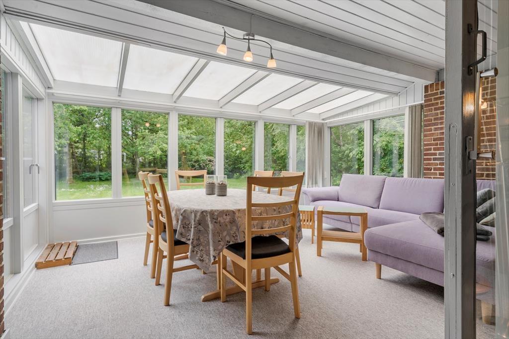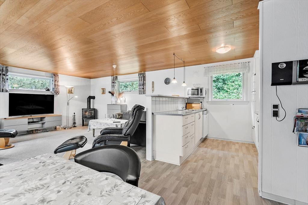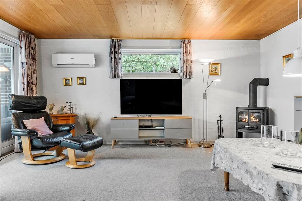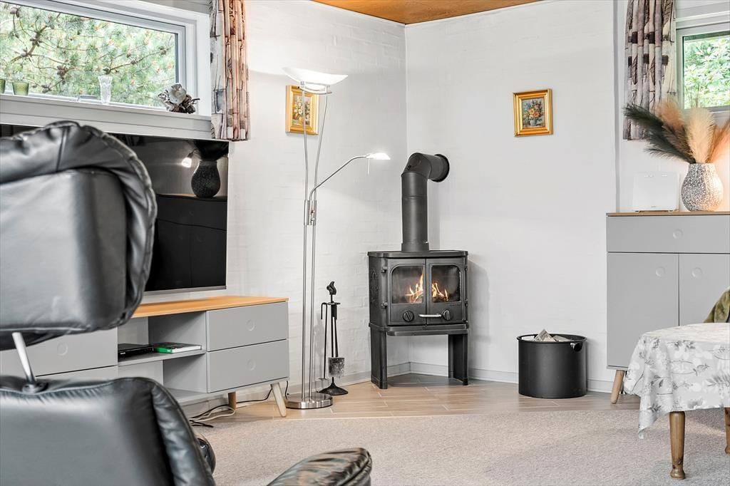 De 83 m2 er godt udnyttede i sommerhuset, der byder på tre gode soveværelser og et praktisk badeværelse med bruseniche, gulvvarme og vaskemaskine (en tørretumbler findes i garagen). Feriens sociale stunder kan oplagt udspille sig i stuen, hvor I kan lave mad i det åbne køkken, spille brætspil ved spisebordet og krybe sammen i sofaafdelingen for at se film eller streame serier på det store fladskærms-tv. Der er både brændeovn og en energivenlig varmepumpe i rummet, og hvis I ikke har brug for ekstra varme, men derimod smukt sollys og løvgrønne farver, kan I sætte jer ud i havestuen, hvor I har udsigt til havens frodige beplantning.