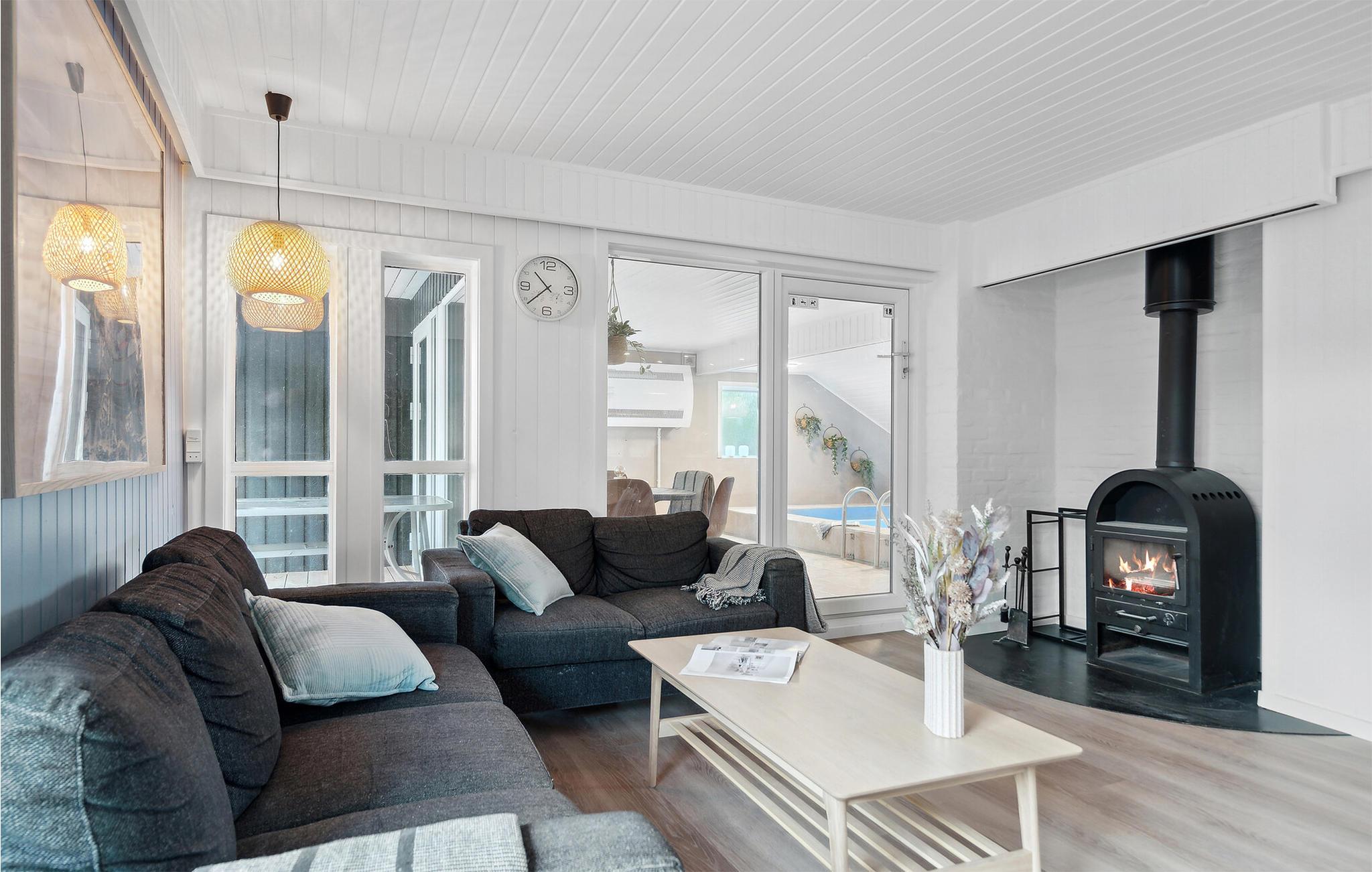 Huset er indrettet med et lyst, åbent køkken/alrum der ligger i forbindelse med stuen. I stuen skaber brændeovnen hygge på de mørke dage, og fungerer ligeledes som supplerende varmekilde til varmepumpen. Der findes fire gode soveværelser samt et aktivitetsrum med billiardbord. I wellnessområdet kan I nyde swimmingpoolen, spabadet og saunaen.