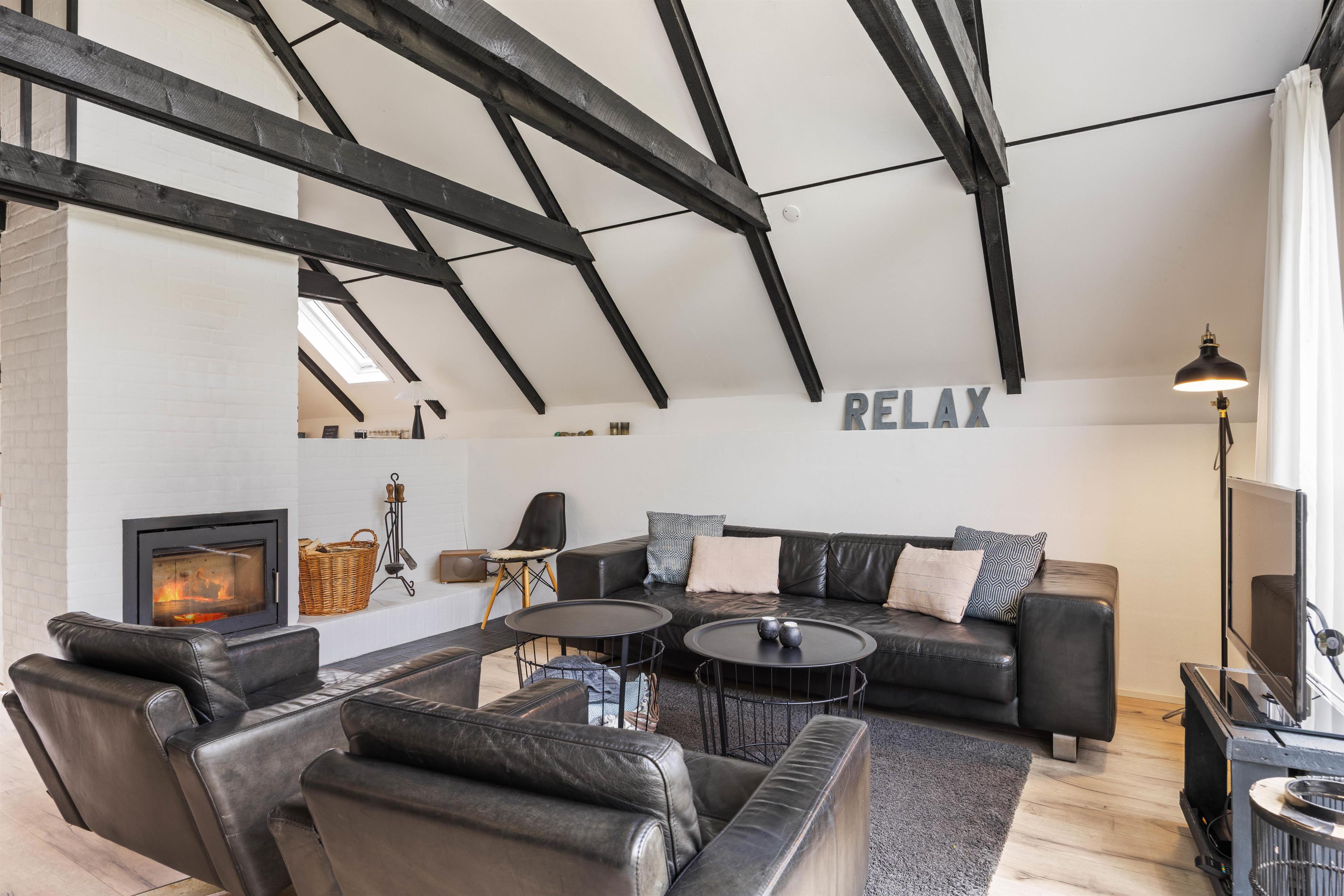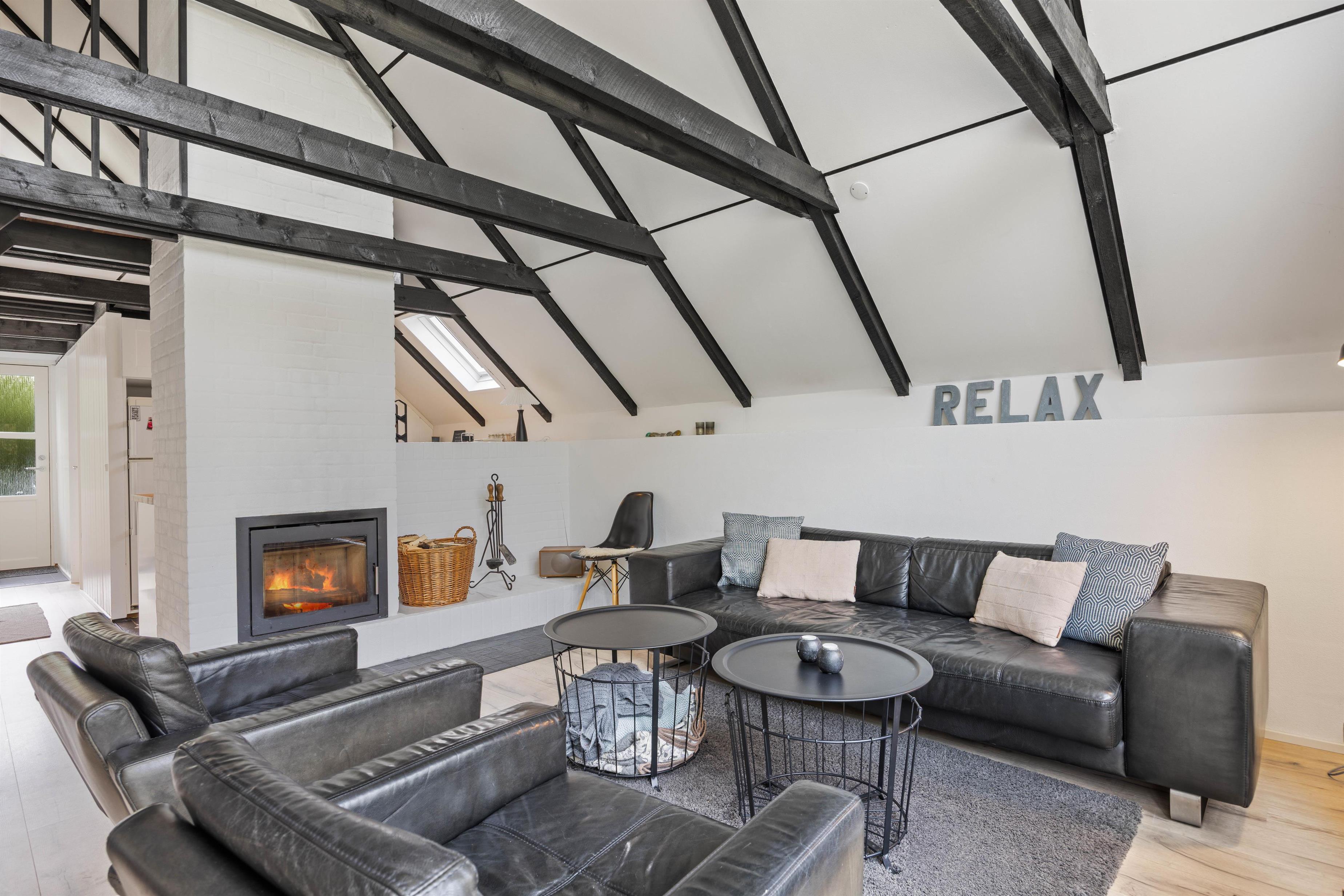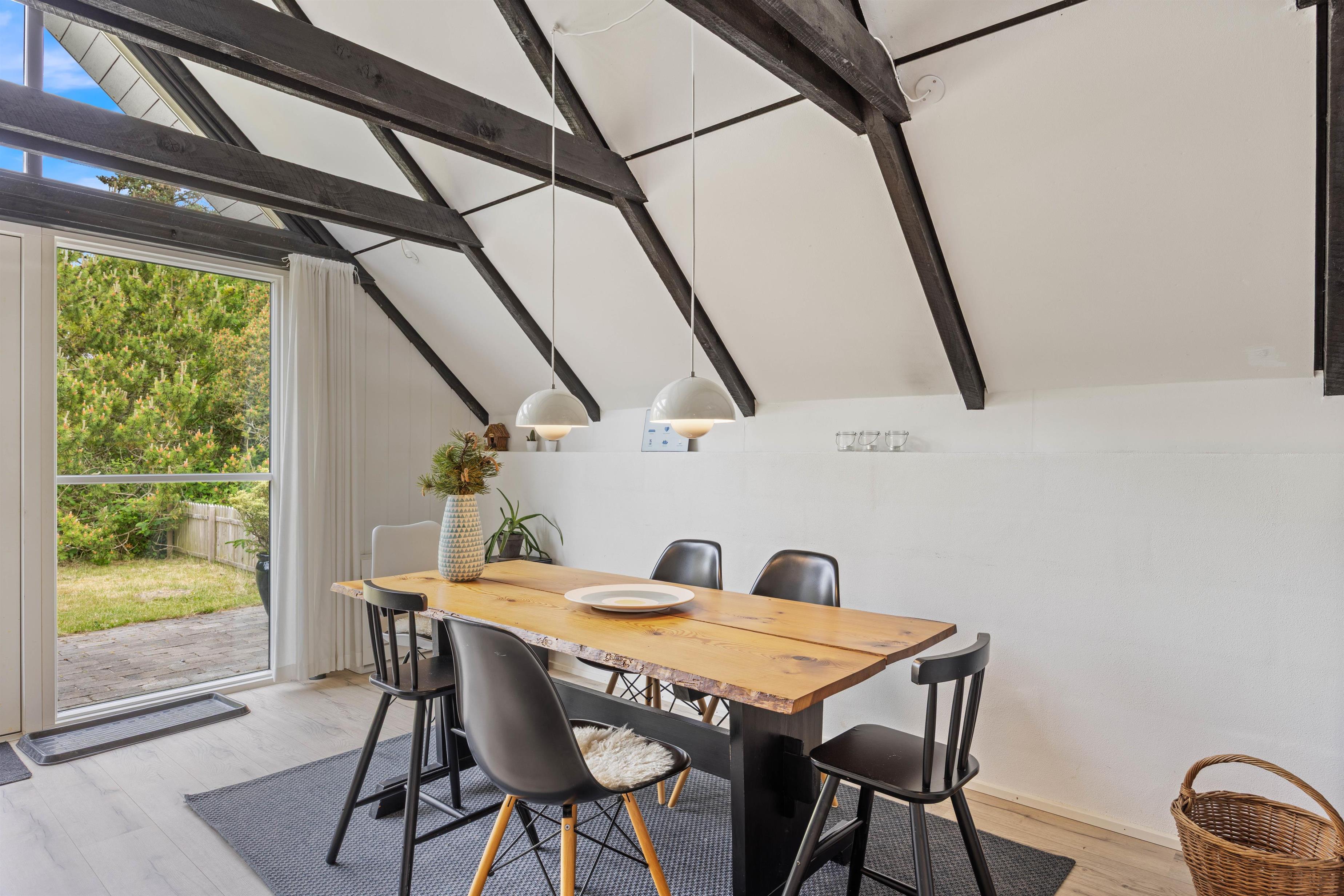 Der er højt til himlen i Lodbjerg Hede og højt til loftet i dette stilfuldt indrettede hus. I det store alrum er de hvide lofter trukket helt op i kip, så man har masser af luft og lys og kan beundre det flotte sorte bjælkeværk. Køkkenet er moderne og godt udstyret, blandt andet med en opvaskemaskine, så der er mere tid til hygge med en god bog eller en film i den store lækre lædersofa. Huset har en energisparende luftvarmepumpe, men for ekstra hygge og varme kan I tænde op i den centralt placerede indbyggede pejs.