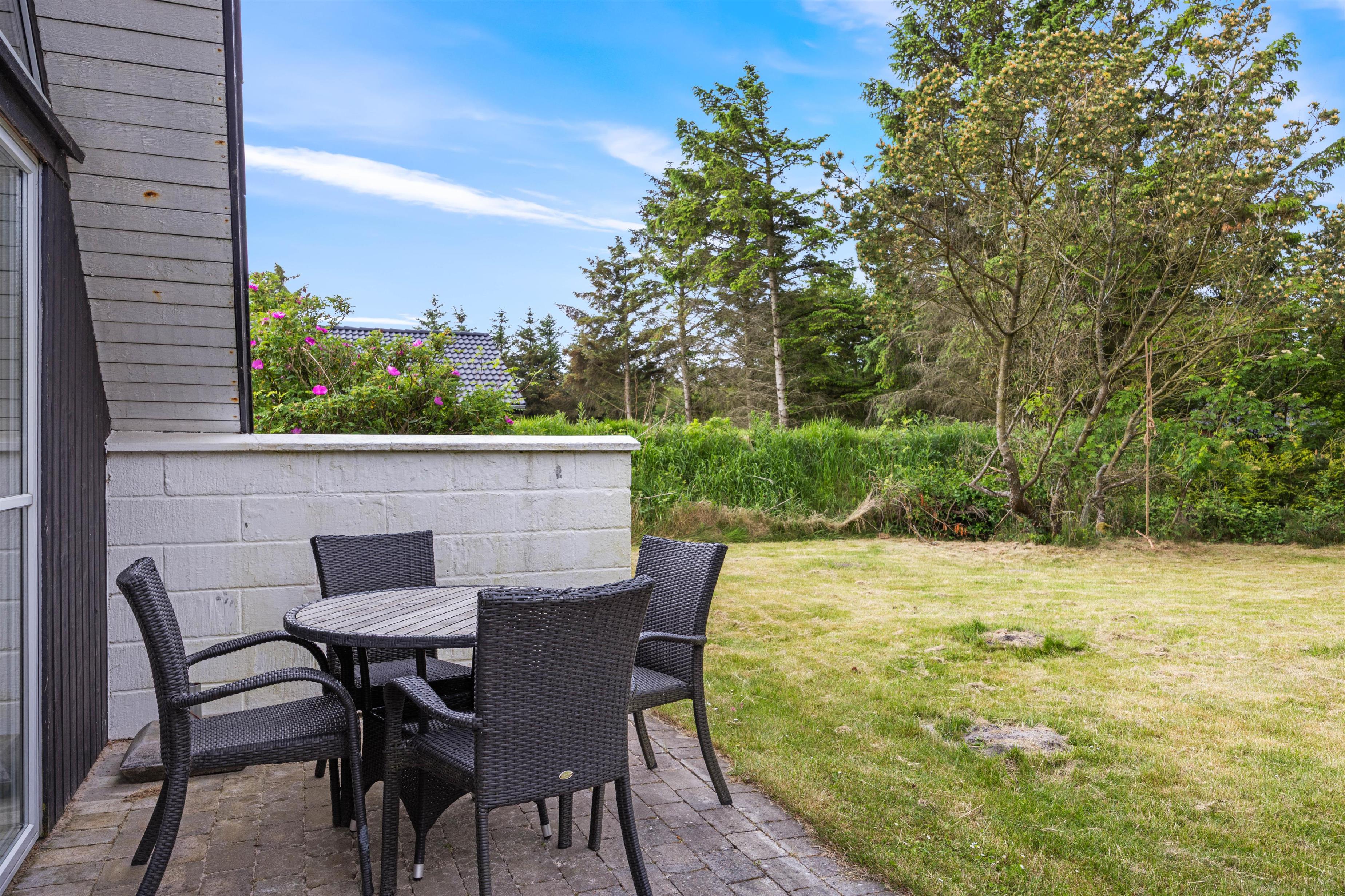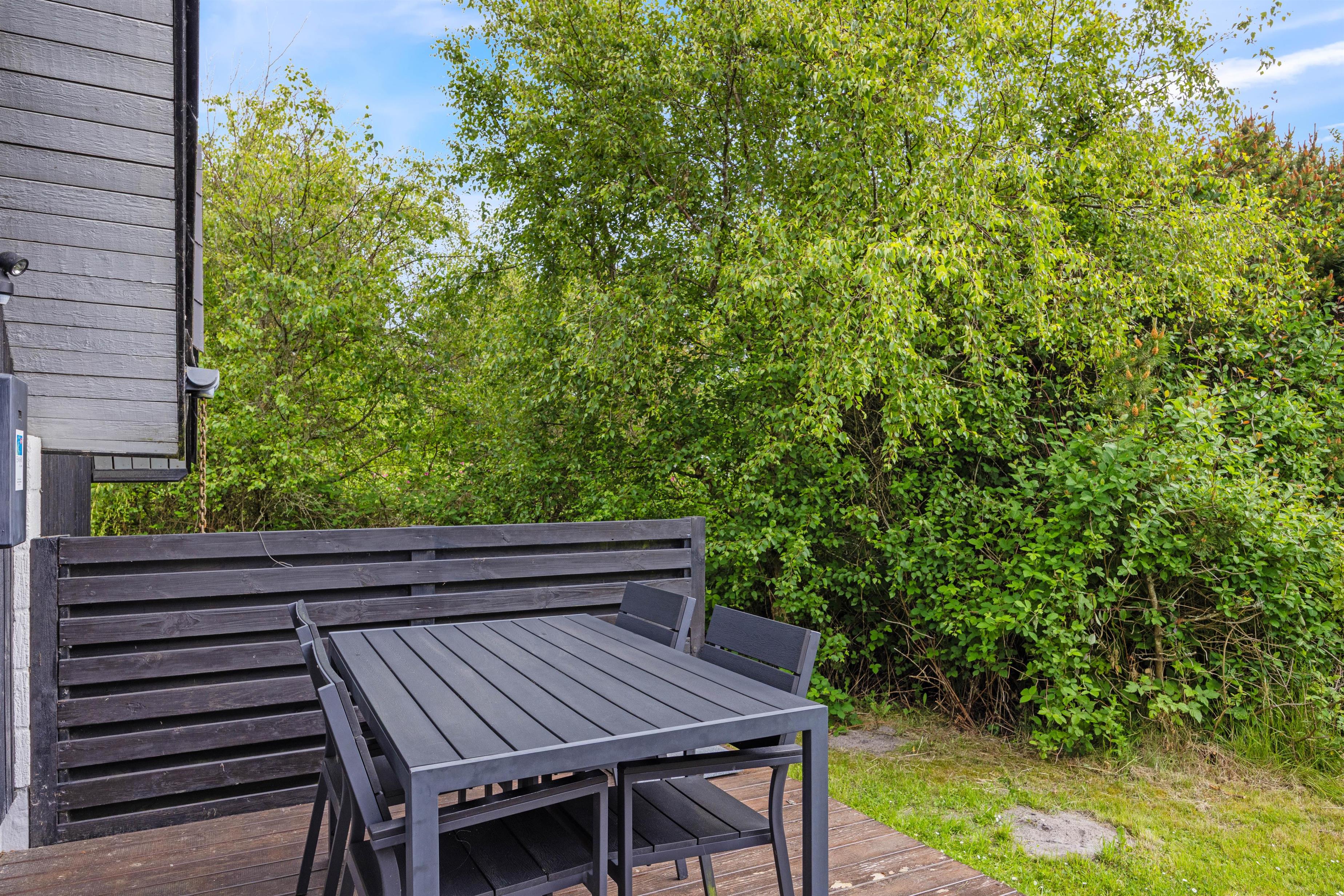En absolut privat terrasse med gode læforhold indbyder til udeliv. Her kan der solbades og holdes lange hyggelige grillaftener. Børnene kommer ikke til at kede sig, de har både sandkasse og gynger til deres rådighed.