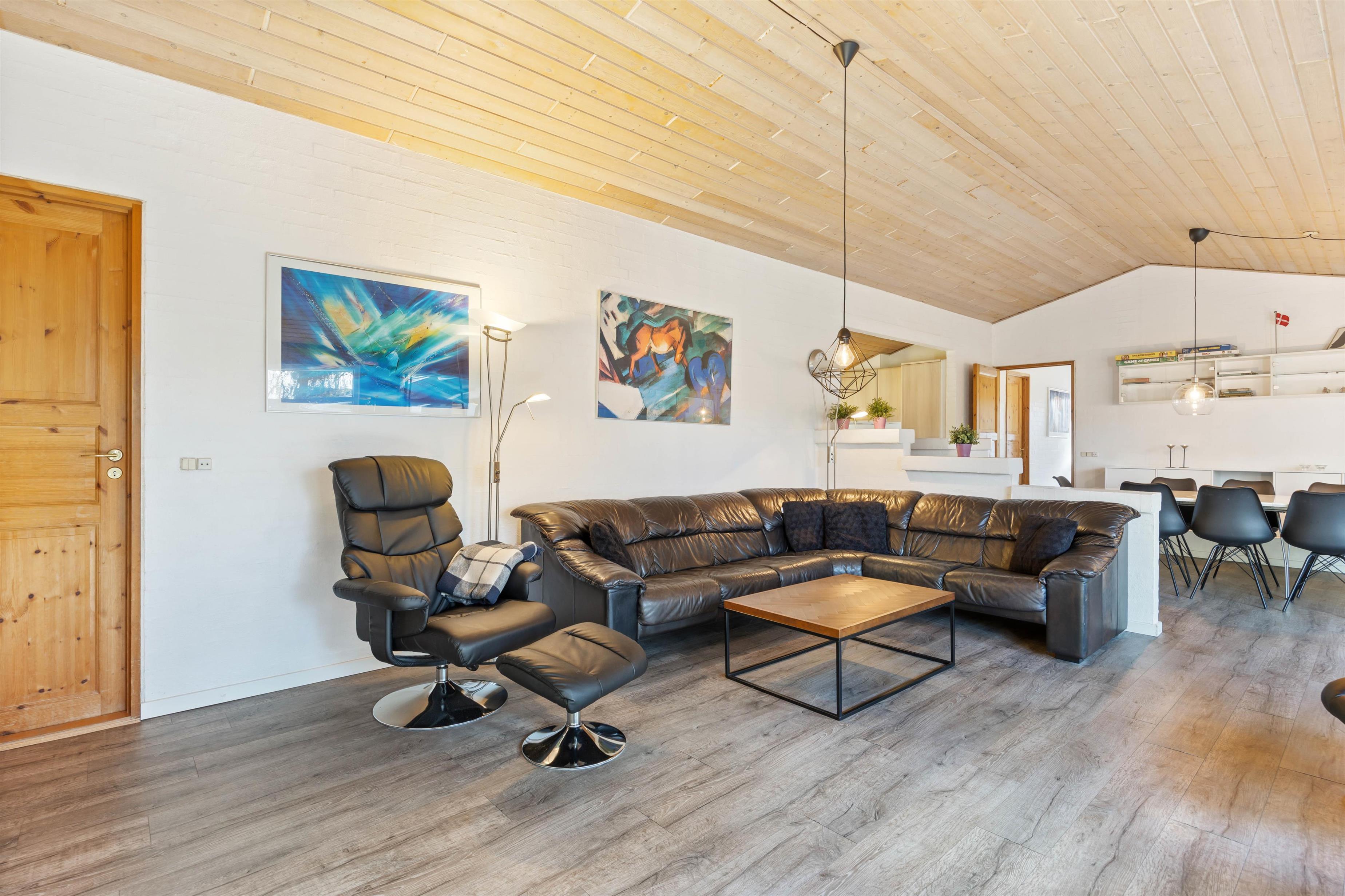 Stuen har en dejlig, varm og hjemlig fornemmelse. Brændeovnen sørger for varme og hygge til rummet. Mens de komfortable møbler sammen med fladskærmen, sikre gode rammer for en hyggelig aften med film.