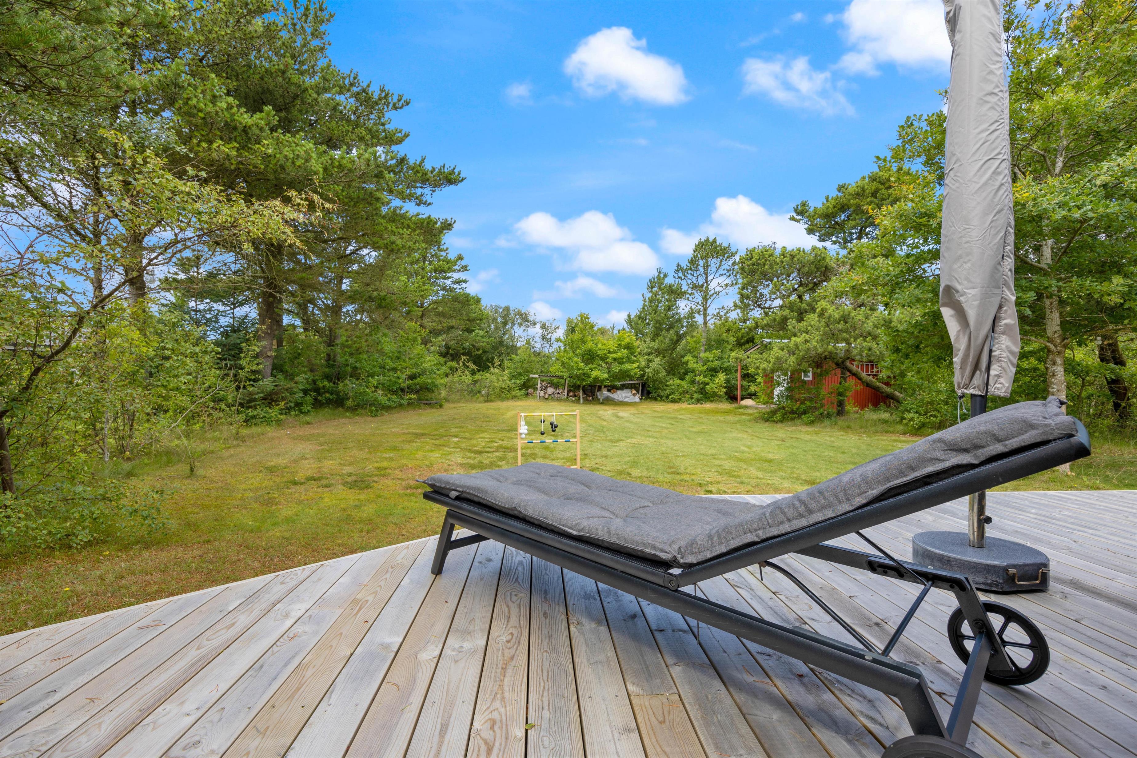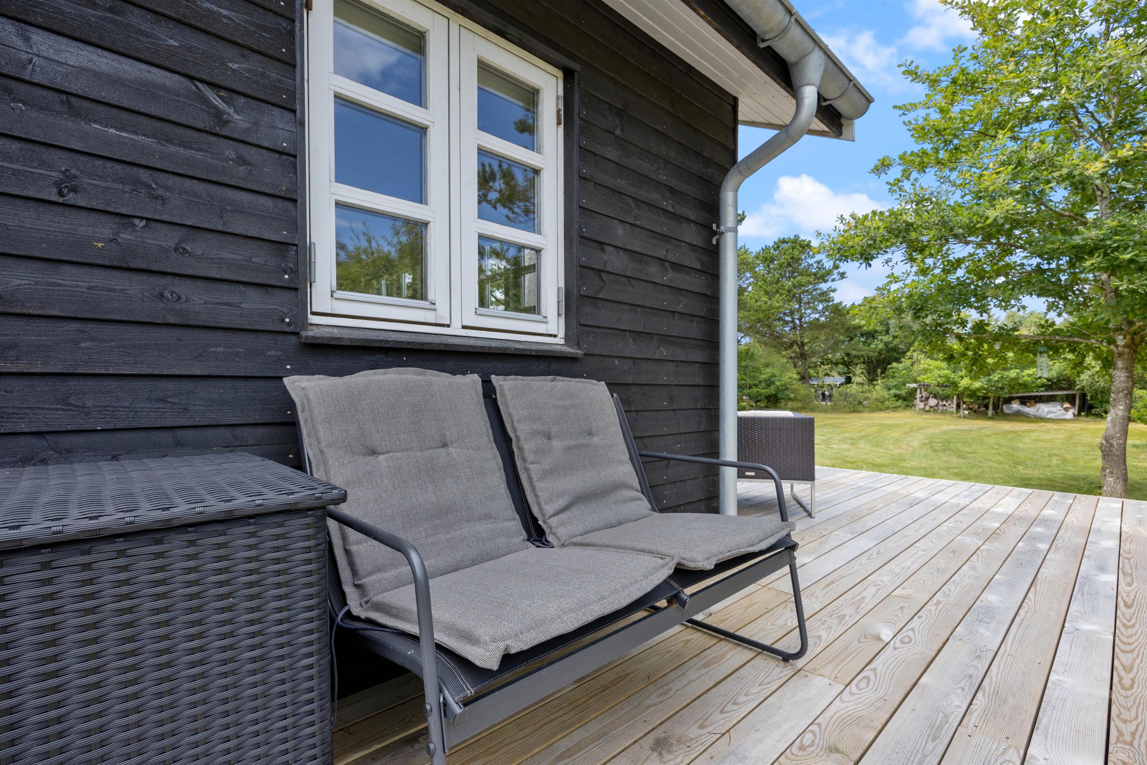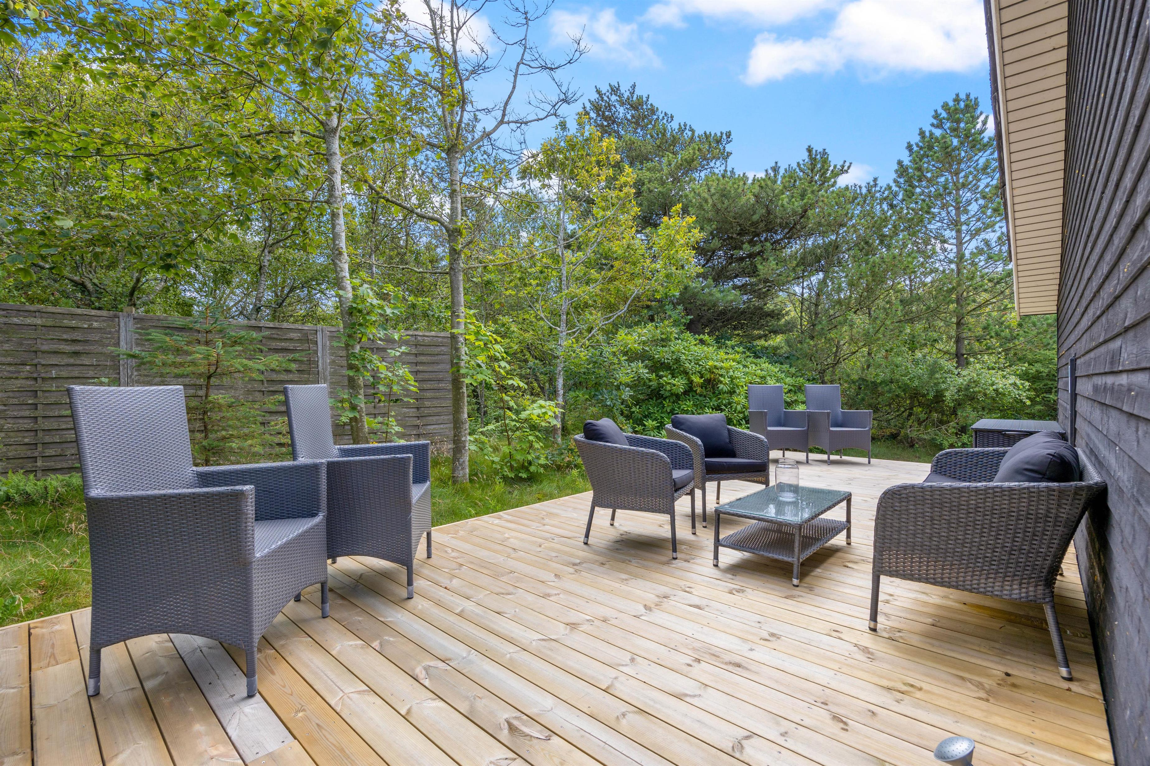 På sommerhusets udeområde venter jer desuden en åben træterrasse. På terrassen kan I finde jer til rette i havemøblerne, nyde solen og lytte til vinden i træerne. De lune ferieaftener kan I tilbringe på terrassen med en lækker middag på grillen.