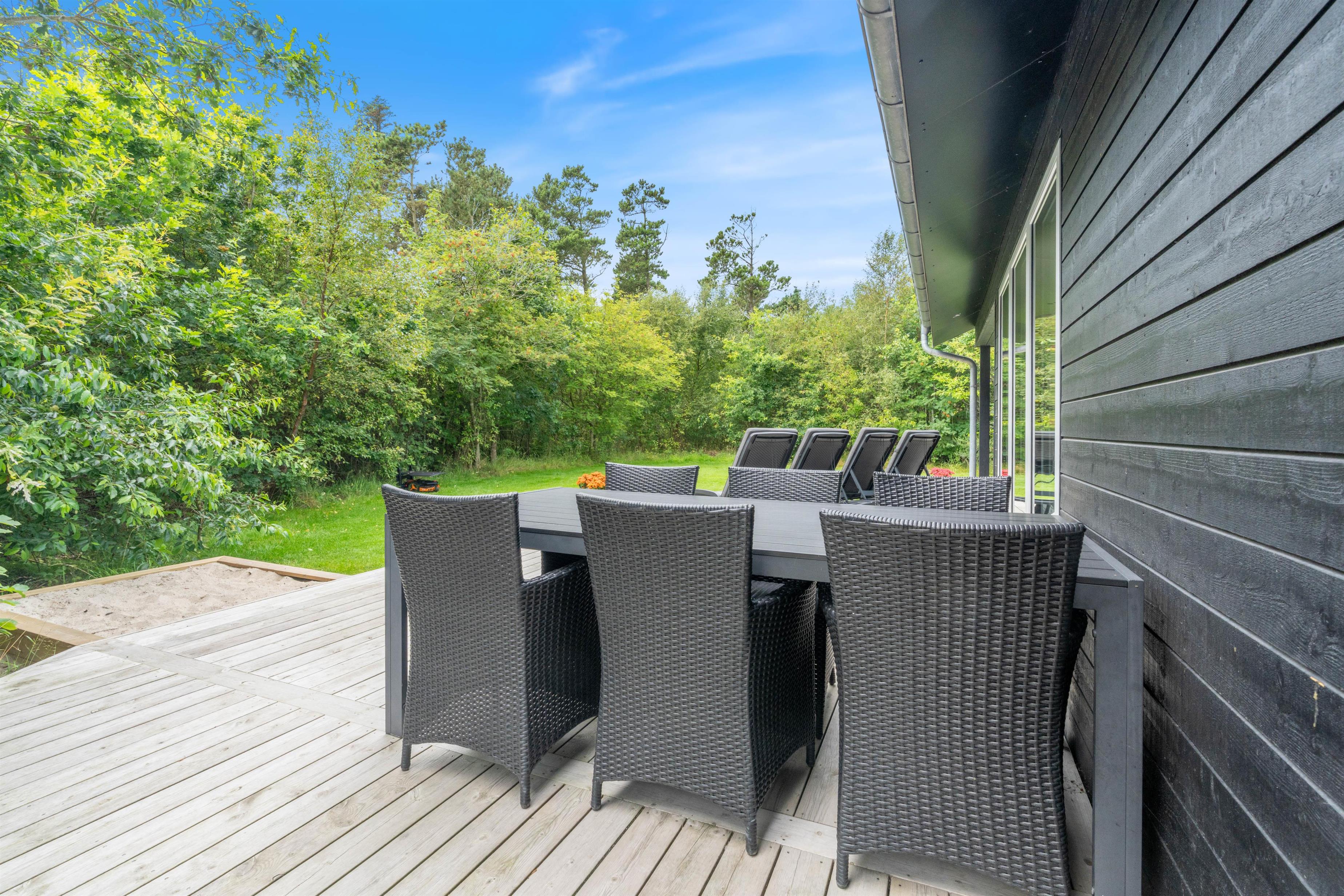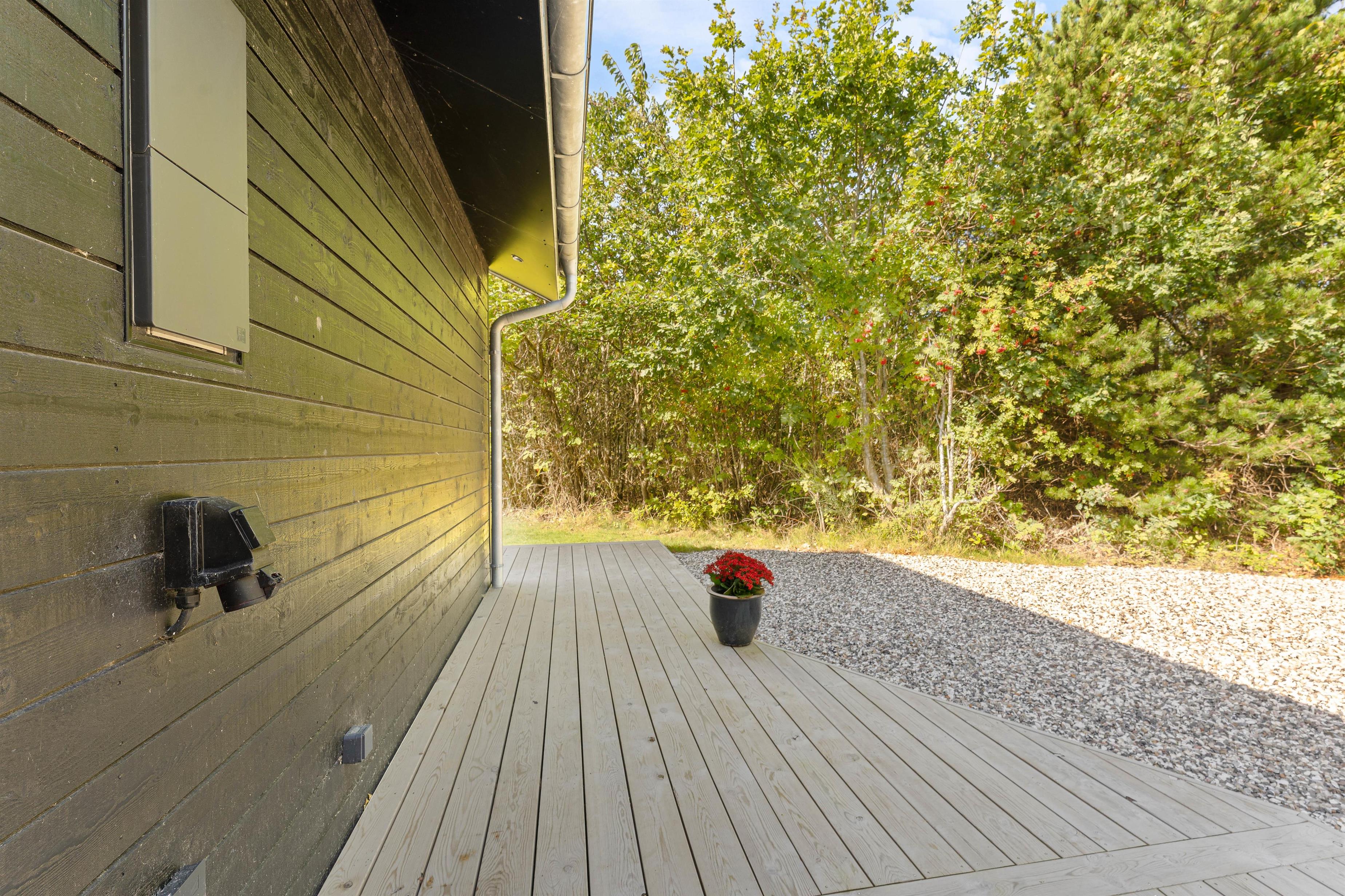 Sommerhuset har en dejlig beliggenhed på en mere end 2.000 kvadratmeter stor plænegrund i Lodbjerg Hede. Høje træer og tæt buskads afskærmer hele grunden og sørger for, at I helt ugeneret kan nyde feriedagene på den store terrasse – som desuden også har en overdækket del. Det er altså ikke vejret, der skal stå i vejen for, at I kan samle fornyet energi i den friske luft og den grønne natur.