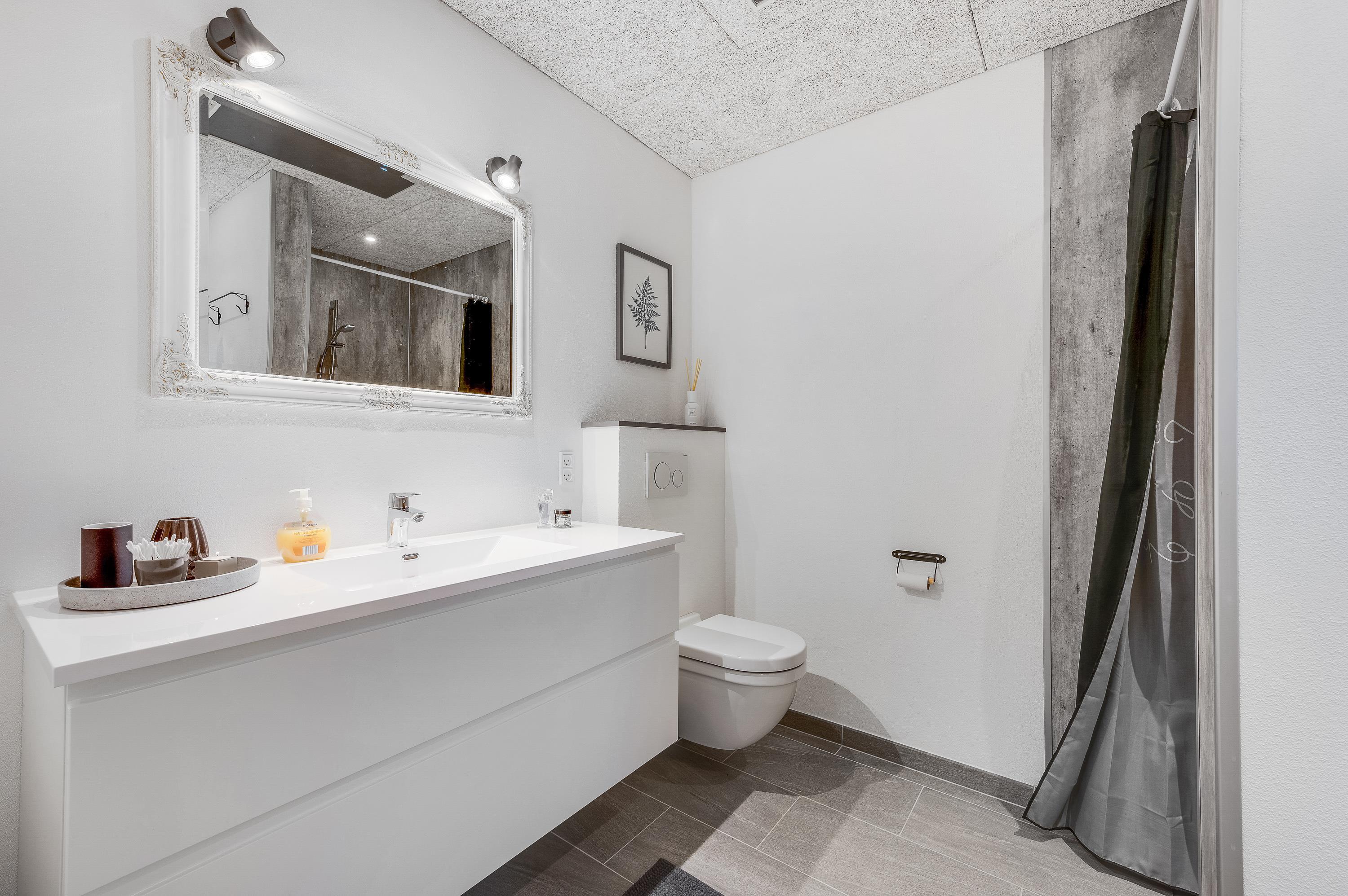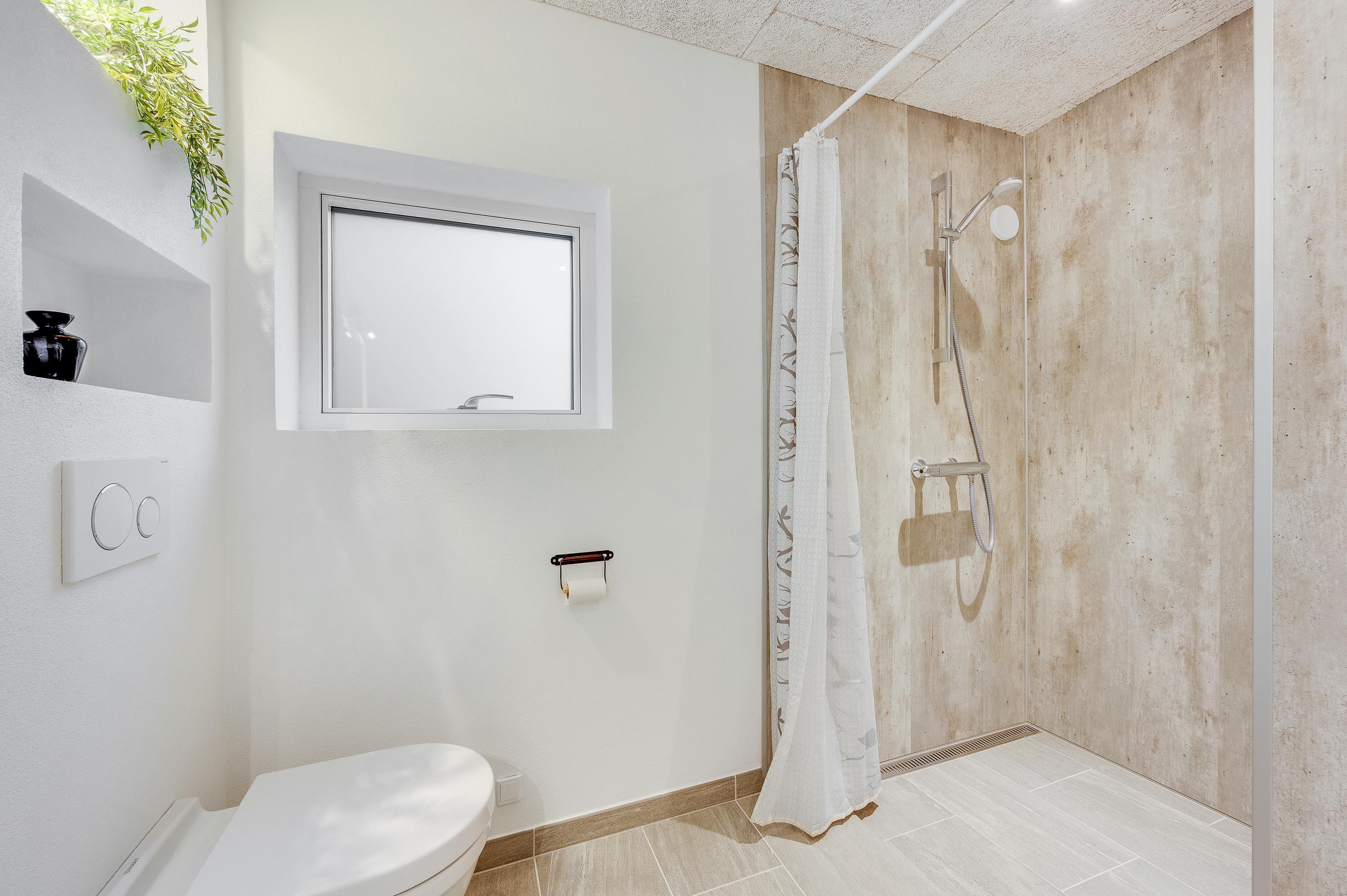 Med 2 badeværelser – begge udstyret med gulvvarme – slipper I for lange køer til brusebadet fra morgenstunden af, og der er også en vaskemaskine i sommerhuset.