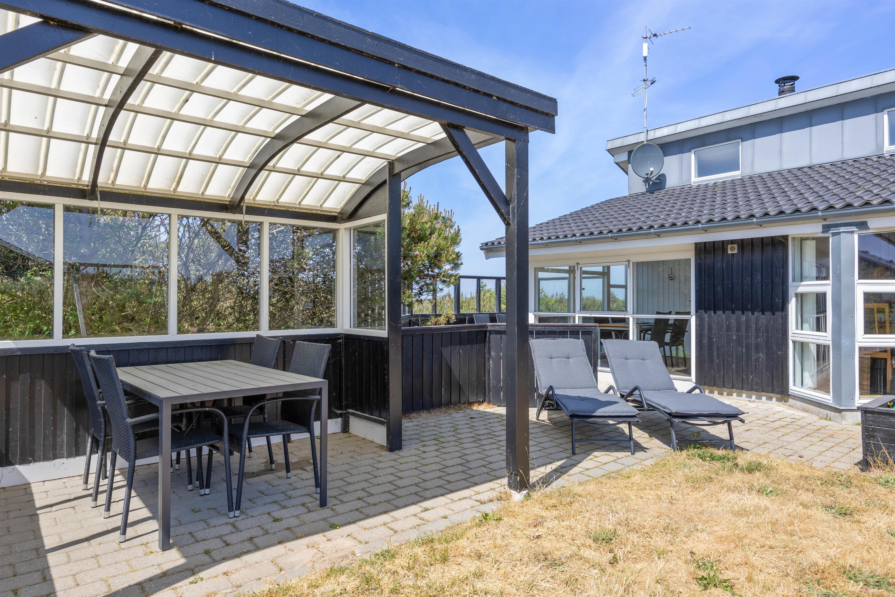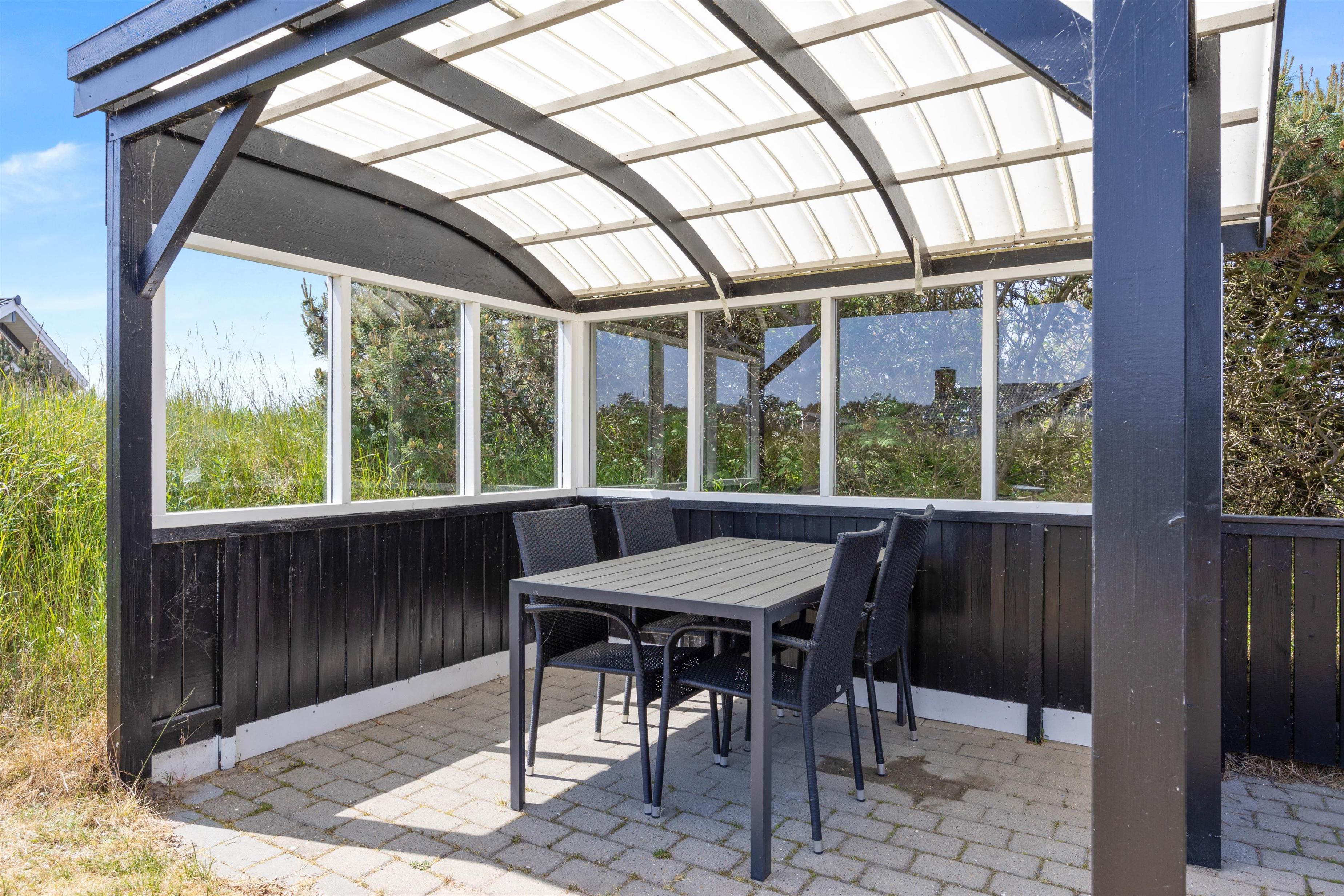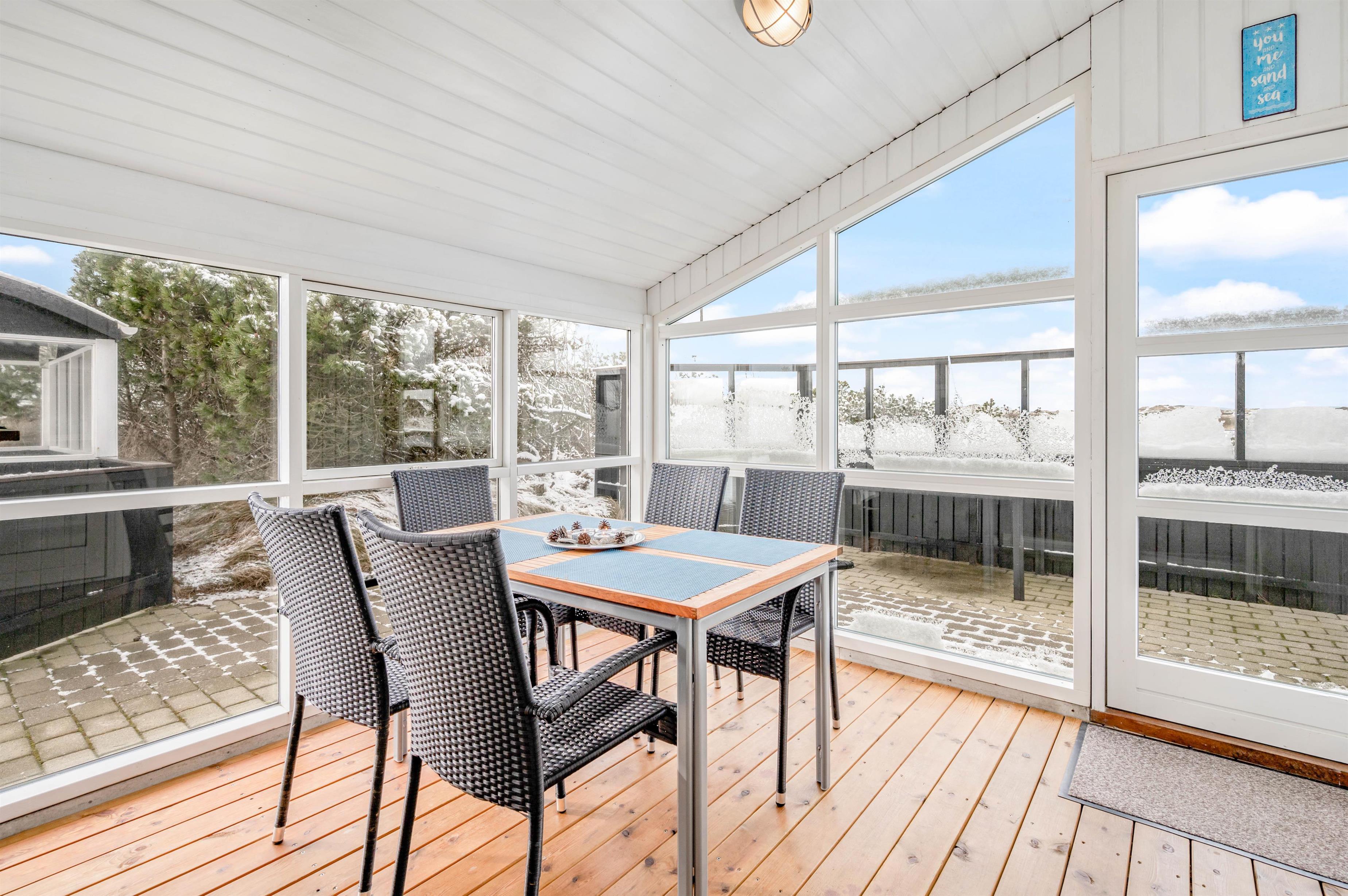 Når vejret ikke helt tillader, at man kan sidde udenfor på terrassen, er det det dejligt med en overdækket terrasse, hvor man kan sidde beskyttet mod vejr og vind i sommerhusets udestue. Uanset, om I sidder og nyder et glas vin, spiller kort eller lignende, skal I ikke bekymre jer om, at noget blæser væk, eller I kommer til at fryse, hvis det trækker ud.