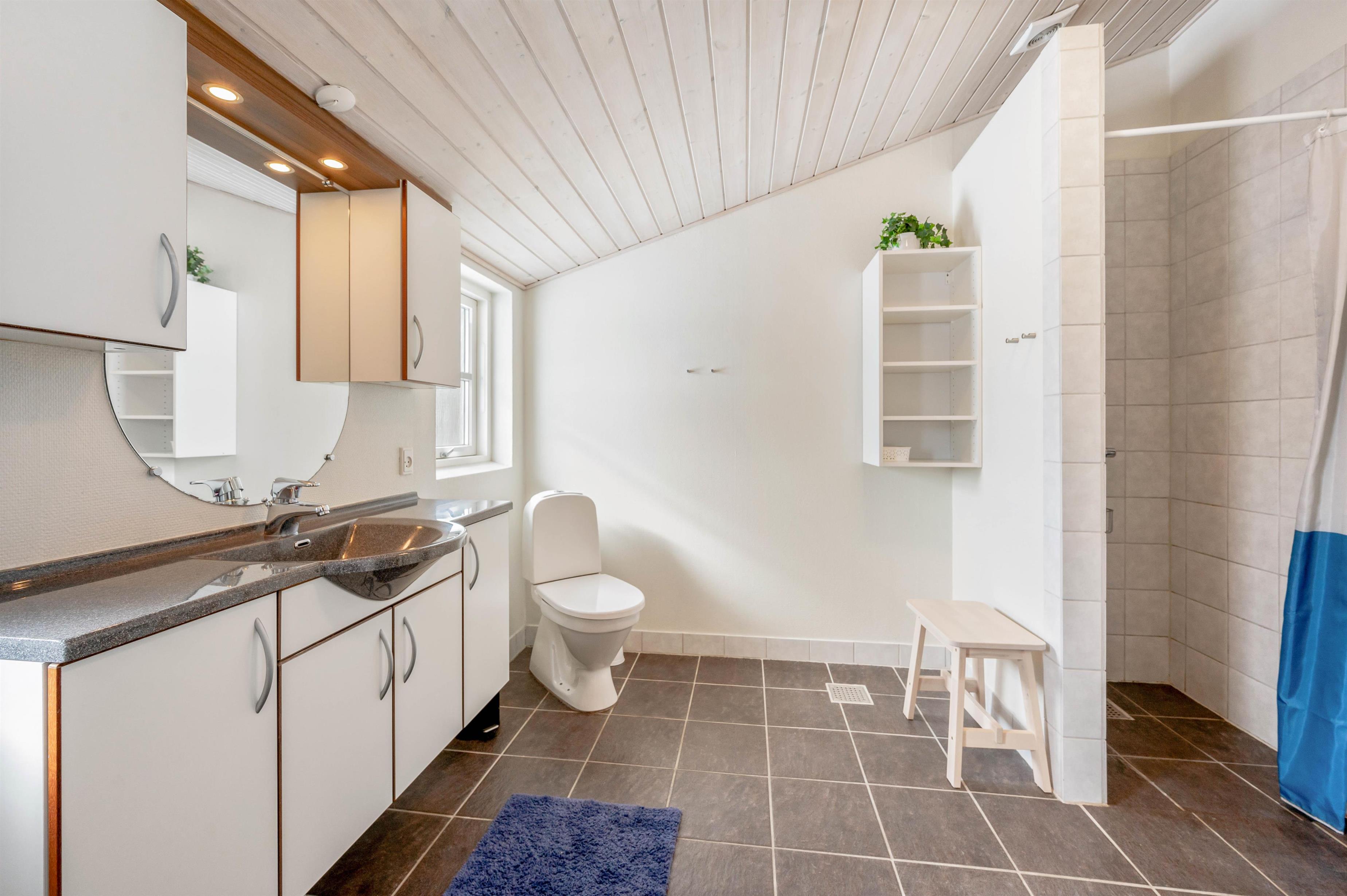 Som en del af den gennemtænkte indretning er der i sommerhuset to moderne badeværelser. Begge badeværelser er udstyret med gulvvarme, så ingen kolde tæer her.