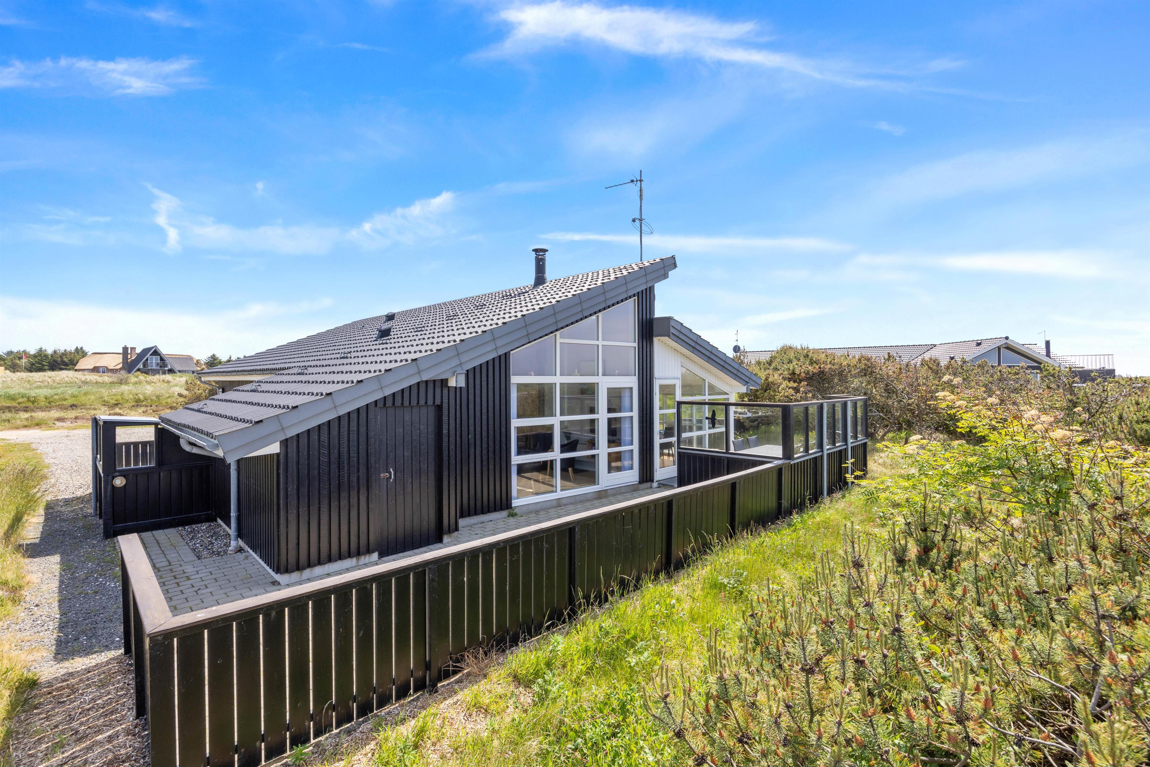 På vestsiden af sommerhuset er der en fantastisk udsigt over marker, enge og klitlandskabet i baggrunden. Stranden ligger kun 1000 meter fra sommerhuset og byder året rundt på enestående oplevelser.