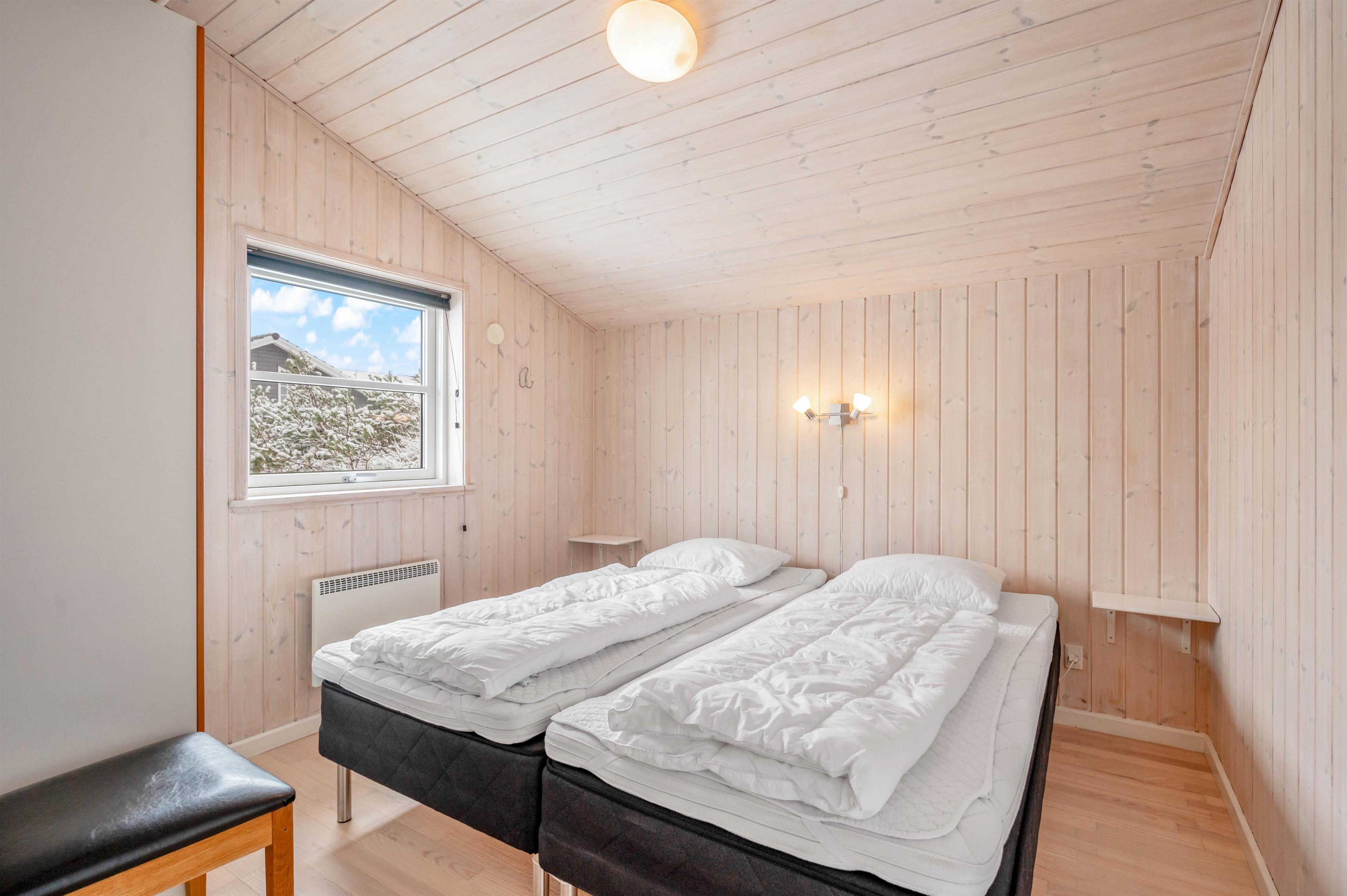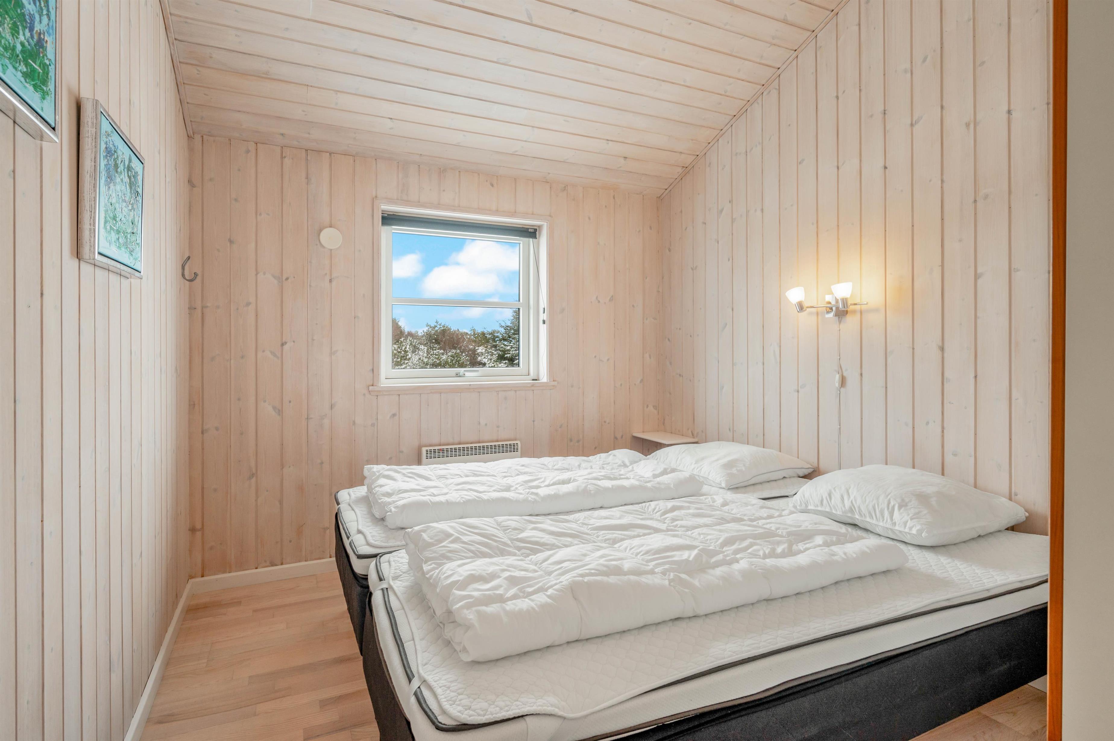 Feriehusets inddeling er flot og gennemtænkt. Takket være de høje lofter og de store lysindfald fremstår sommerhuset rummeligt og lækkert. De lyse træpaneler, som sommerhuset er beklædt med indvendigt, giver en særlig varme til indretningen.
