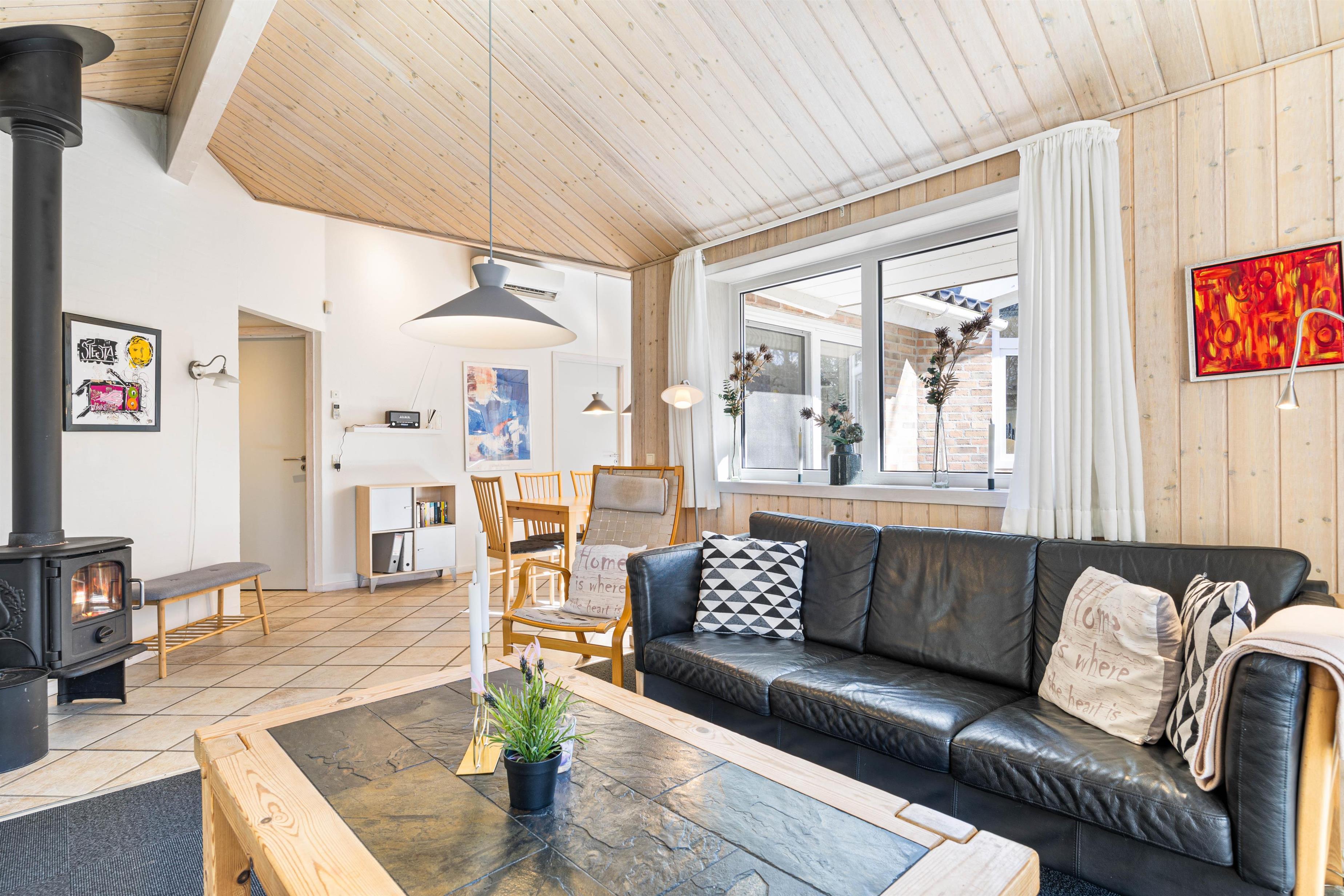 Stue og køkken ligger i åben forbindelse med hinanden, og de store vinduer inviterer ikke kun solens lys, men også den grønne natur indenfor. Brændeovnens knitren gør de mørke efterårsaftener og frostklare vinterdage på sofaen endnu hyggeligere, og rundt om spisebordet kan I samles til mange gode måltider og skønne familiestunder. Sommerhuset er også perfekt egnet til vinterudlejninger, idet det er et godt isoleret stenhus.