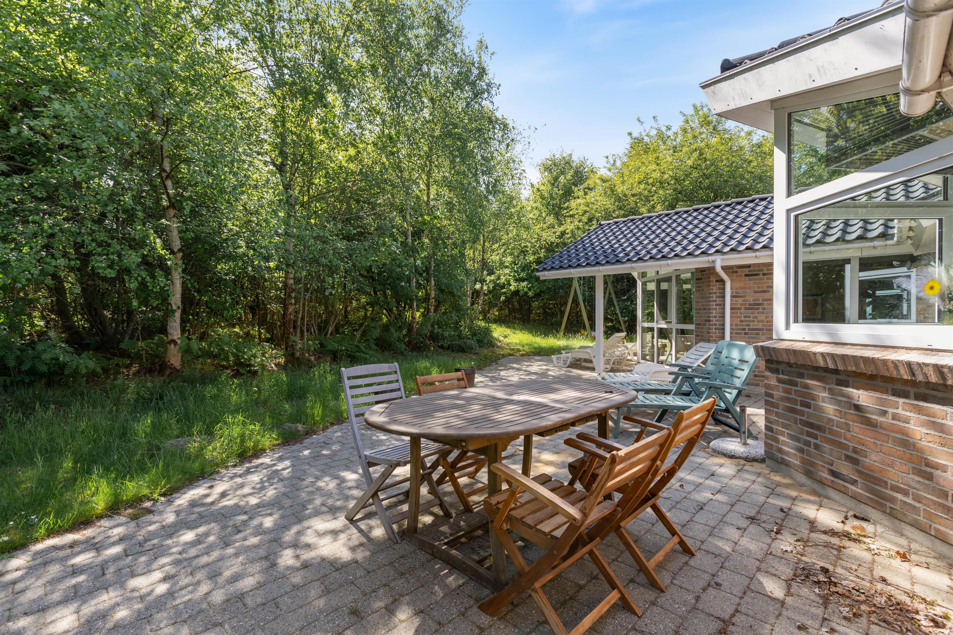 Fra stuen er der udgang til den store, åbne terrasse, som er omgivet af grøn natur og træer, der giver jer både læ, privatliv og ikke mindst en god udsigt fra liggestolene. Mens I nyder freden og roen - og den beroligende havluft -, kan børnene og hundene lege i den store have eller få glæde af gyngestativet og sandkassen.