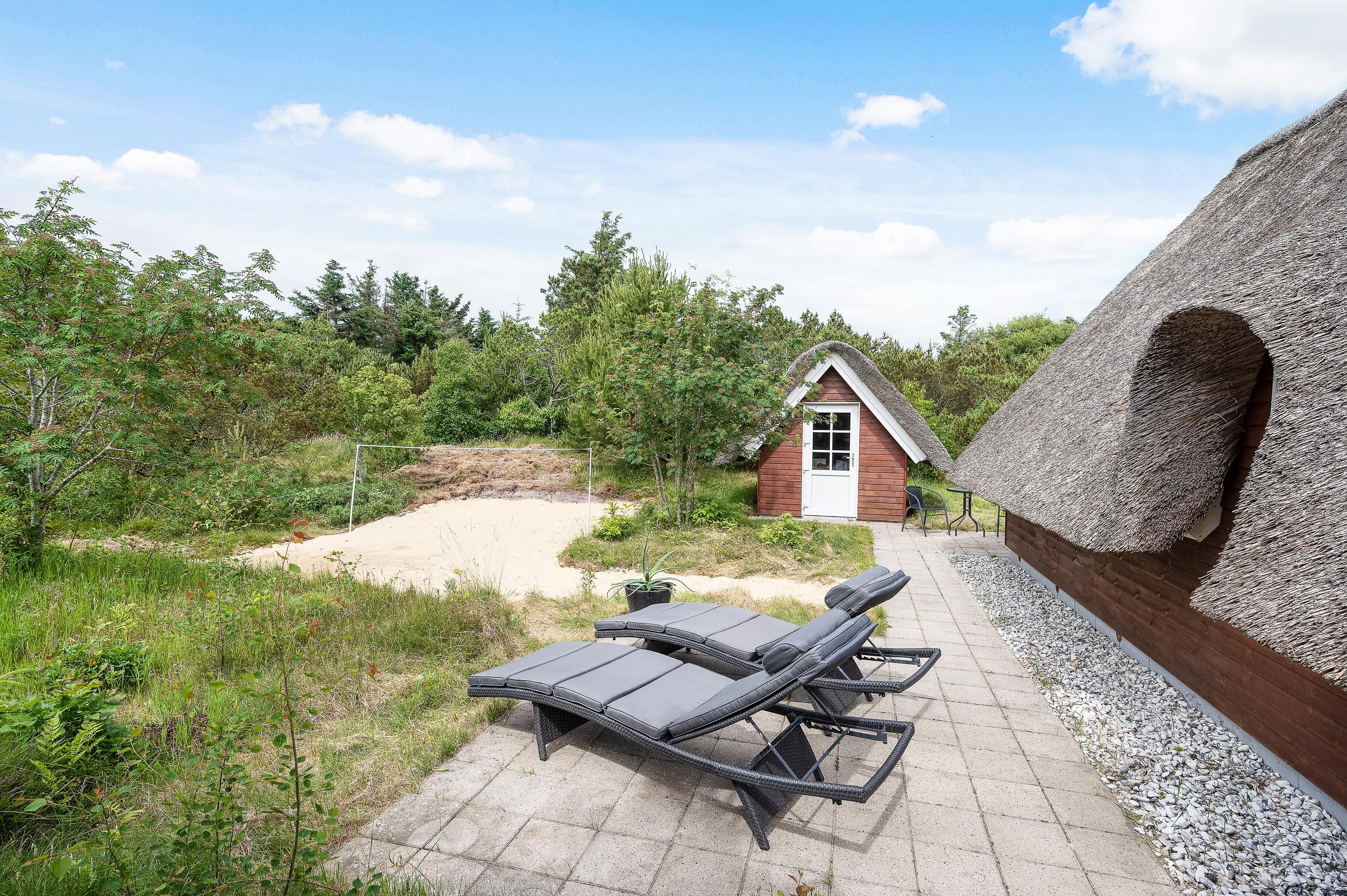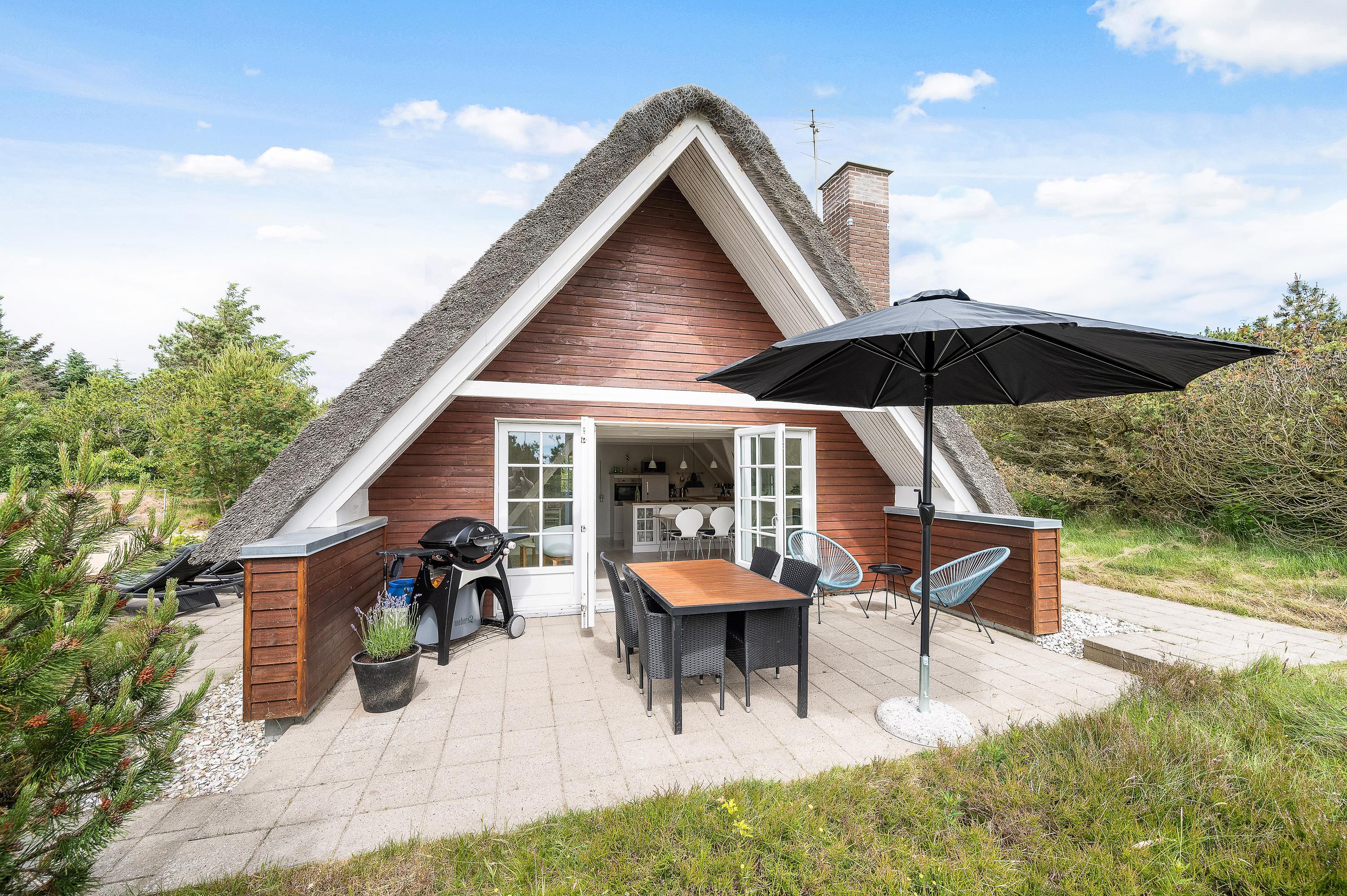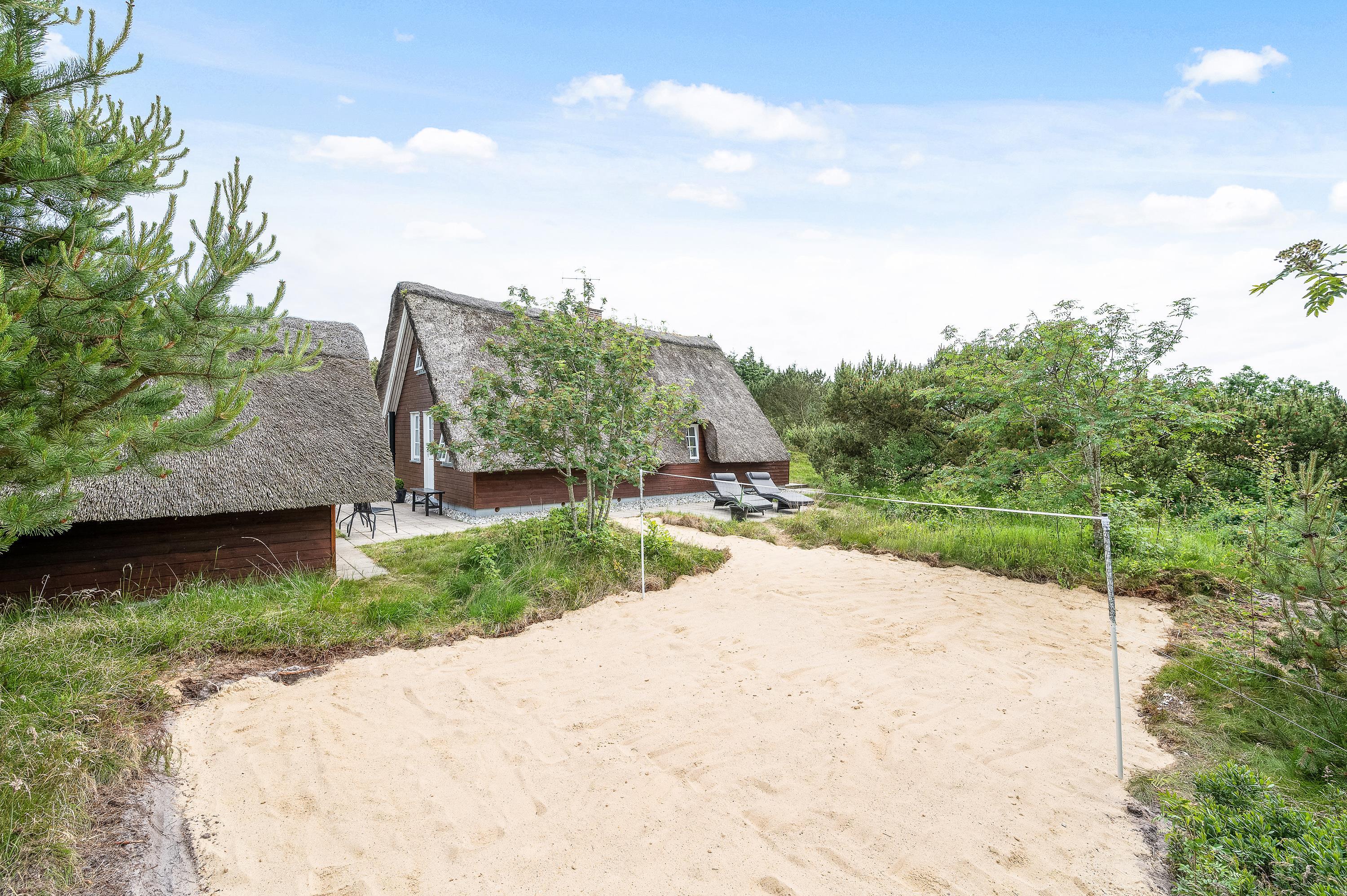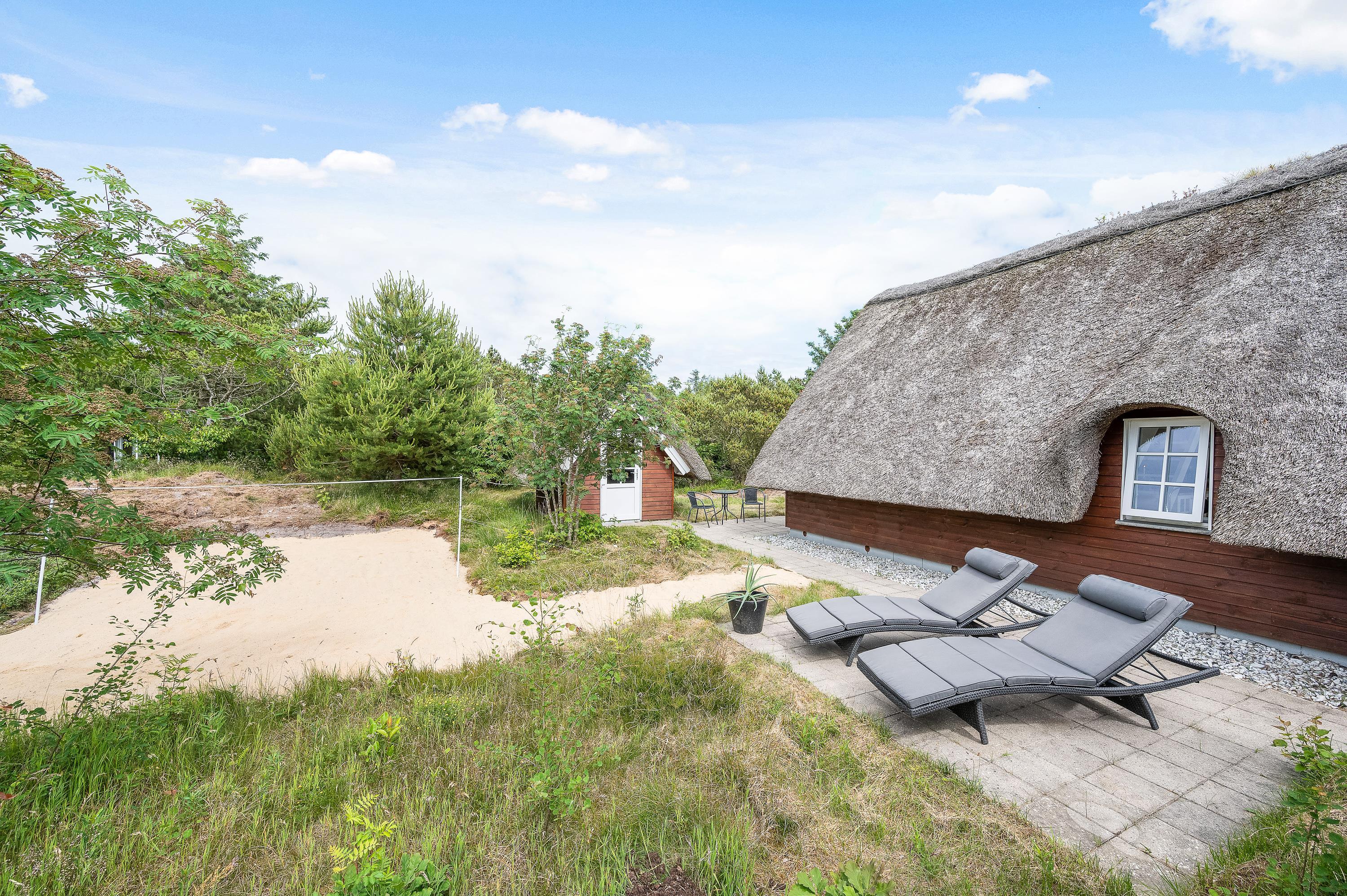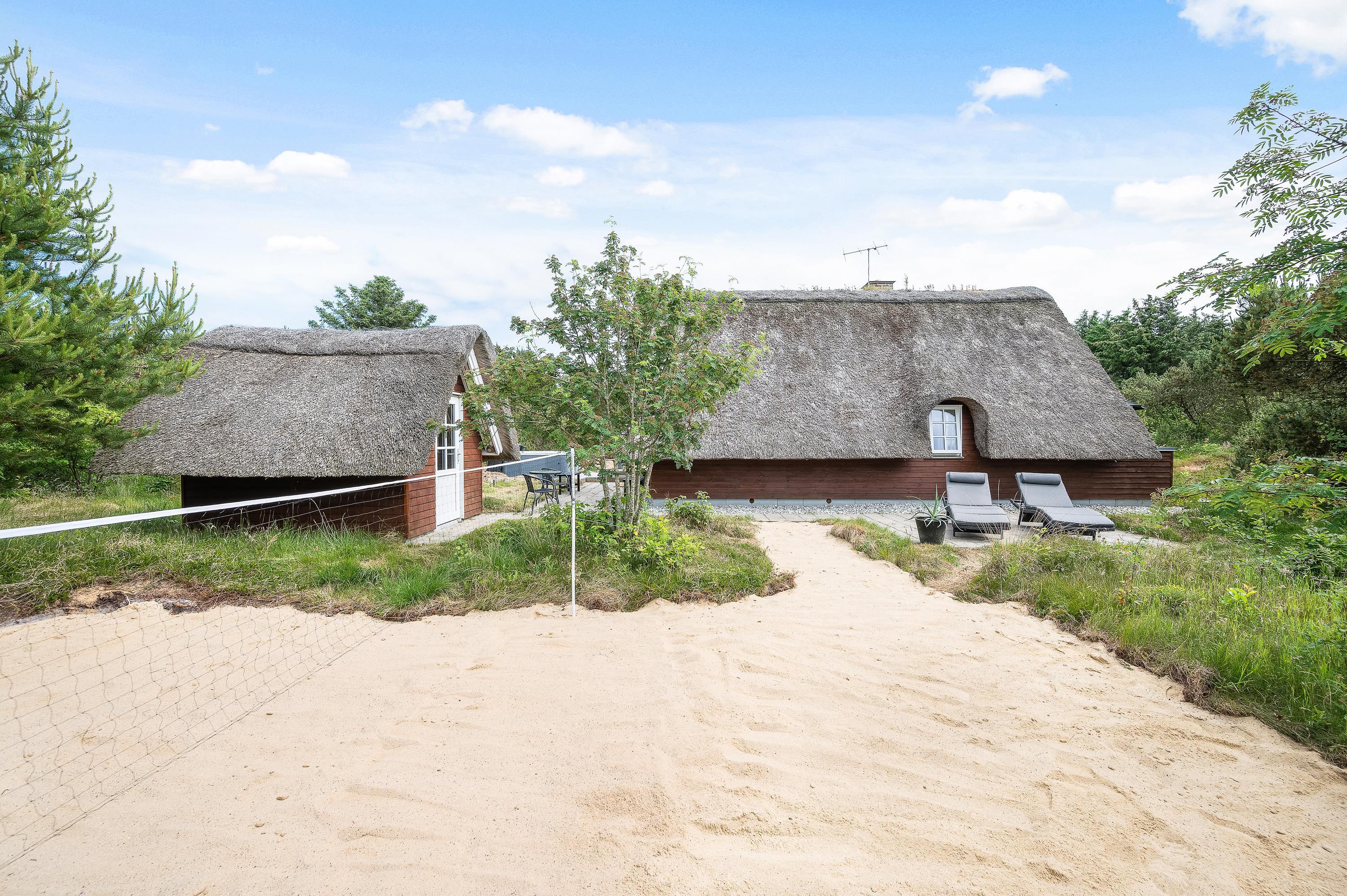 Lodbjerg Hede er generelt et roligt ferieområde, og denne ferieadresse er ingen undtagelse – tværtimod. Det lille stråtagshus er placeret på en 2.000 kvadratmeter stor naturgrund og er omgivet af høje grantræer og tæt buskads. Den ugenerede beliggenhed emmer således af klassisk sommerhusidyl med den vestjyske natur som ramme for ferien.