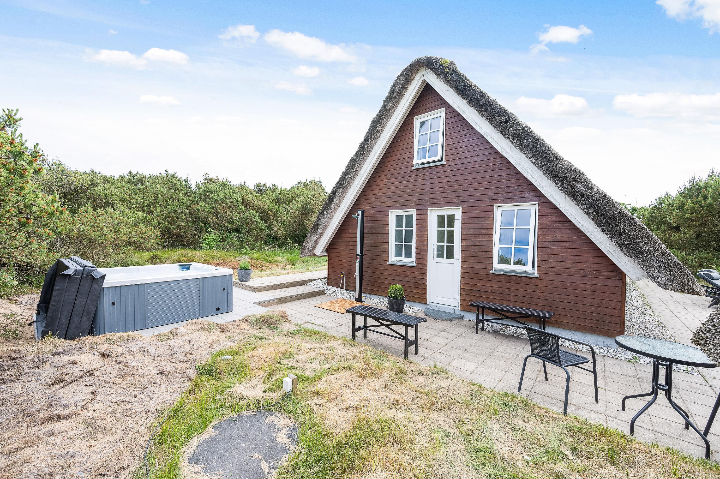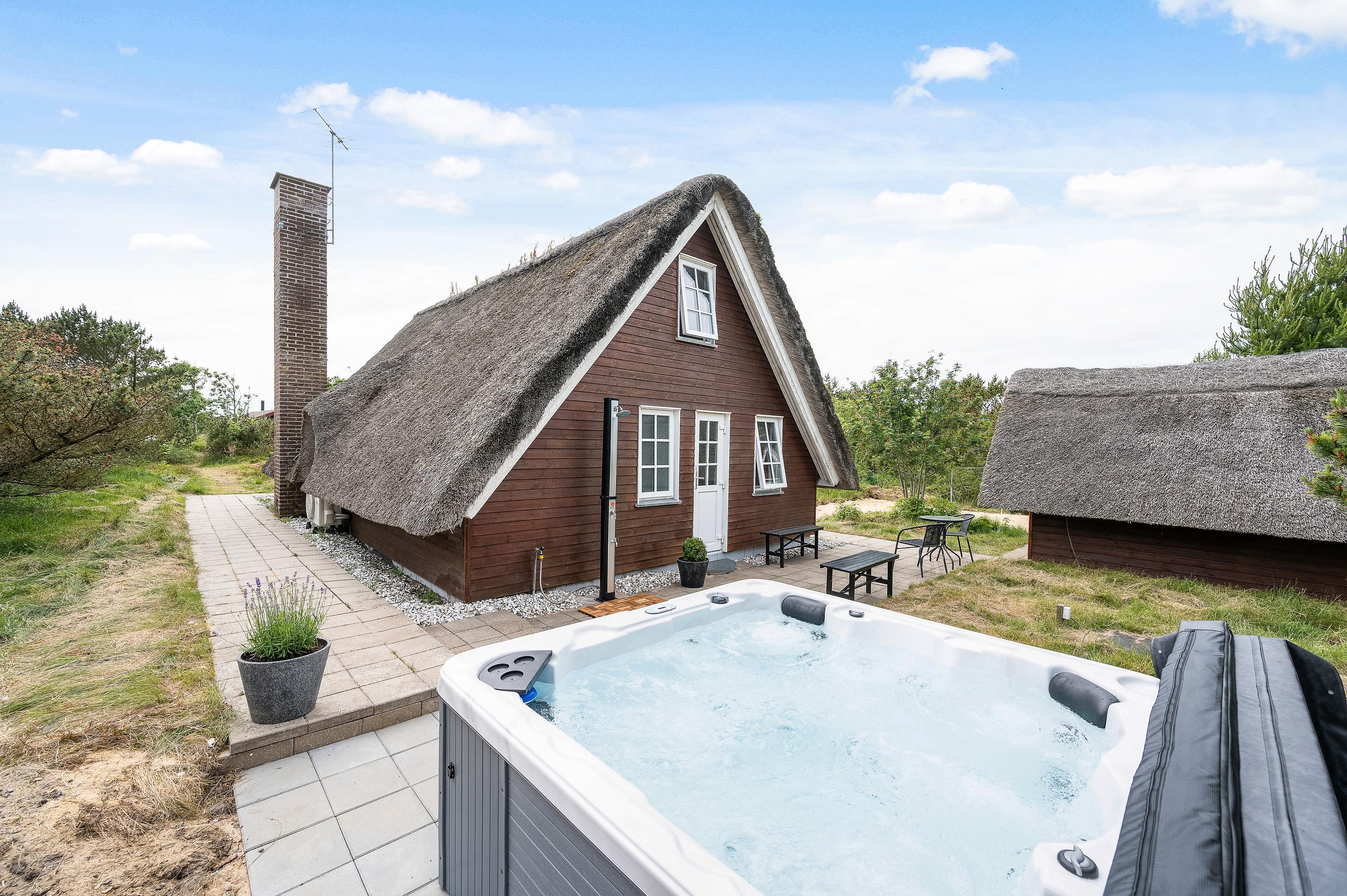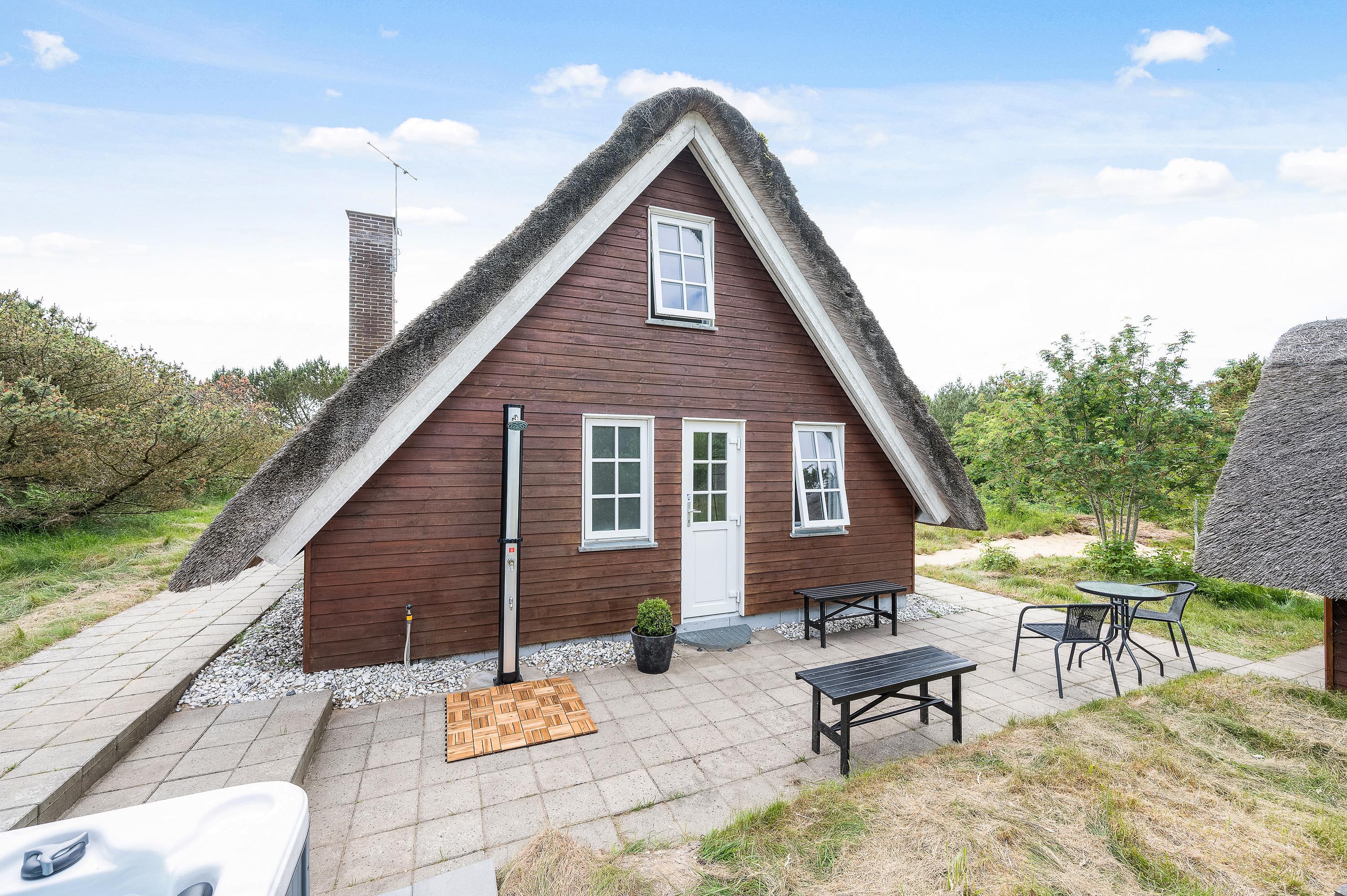 Ægte sommerhusidyl venter jer på adressen Hybenvej 60 i Lodbjerg Hede. Det stråtækte sommerhus har en herlig, ugeneret beliggenhed på en stor naturgrund omgivet af træer og buskads, og på terrassen er der både ude spa og udendørs bruser. Den lyse og indbydende indretning med blandt andet brændeovn rummer plads til 4 personer – et godt valg for en lille familie eller et romantisk ophold for to!