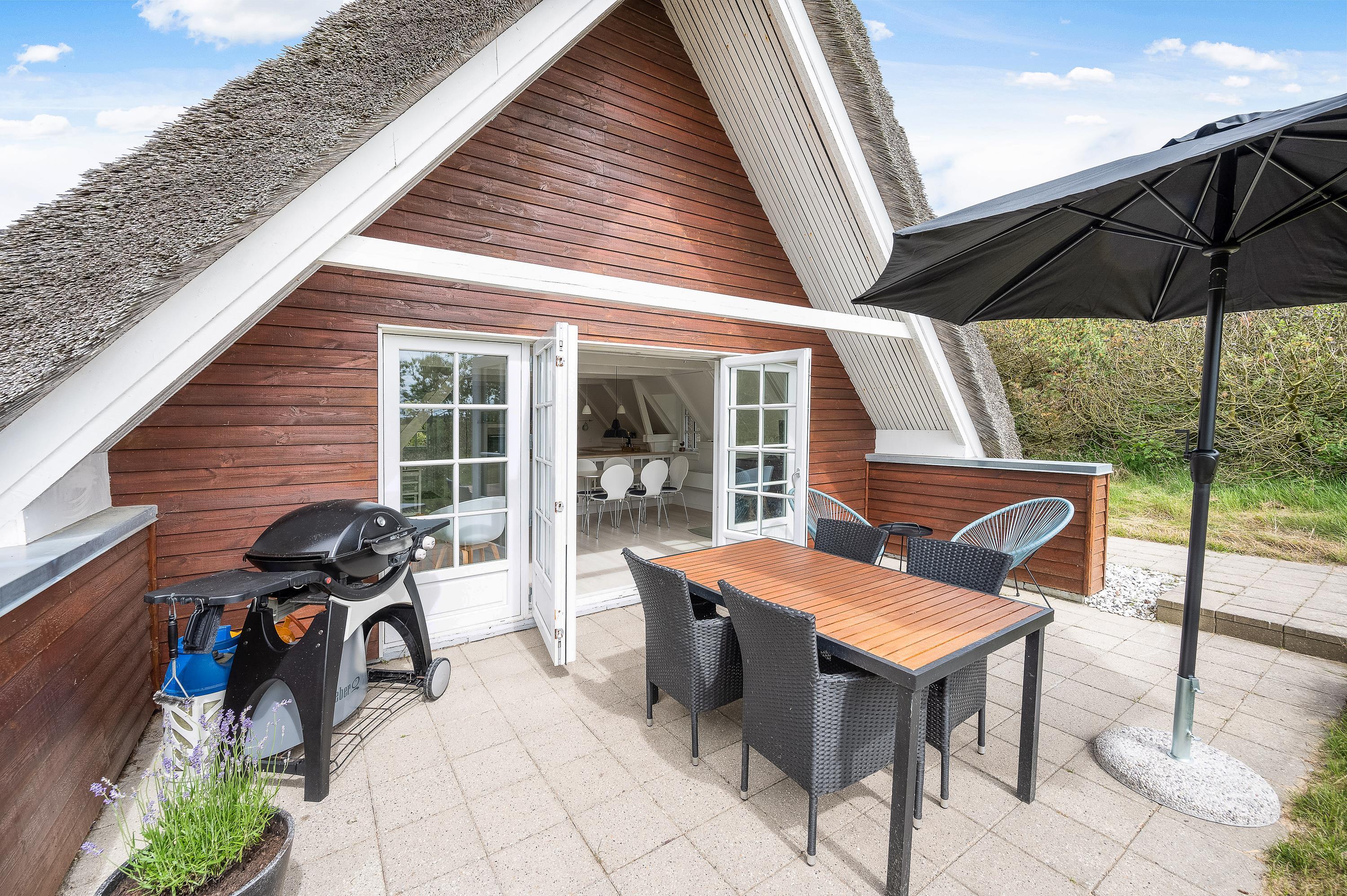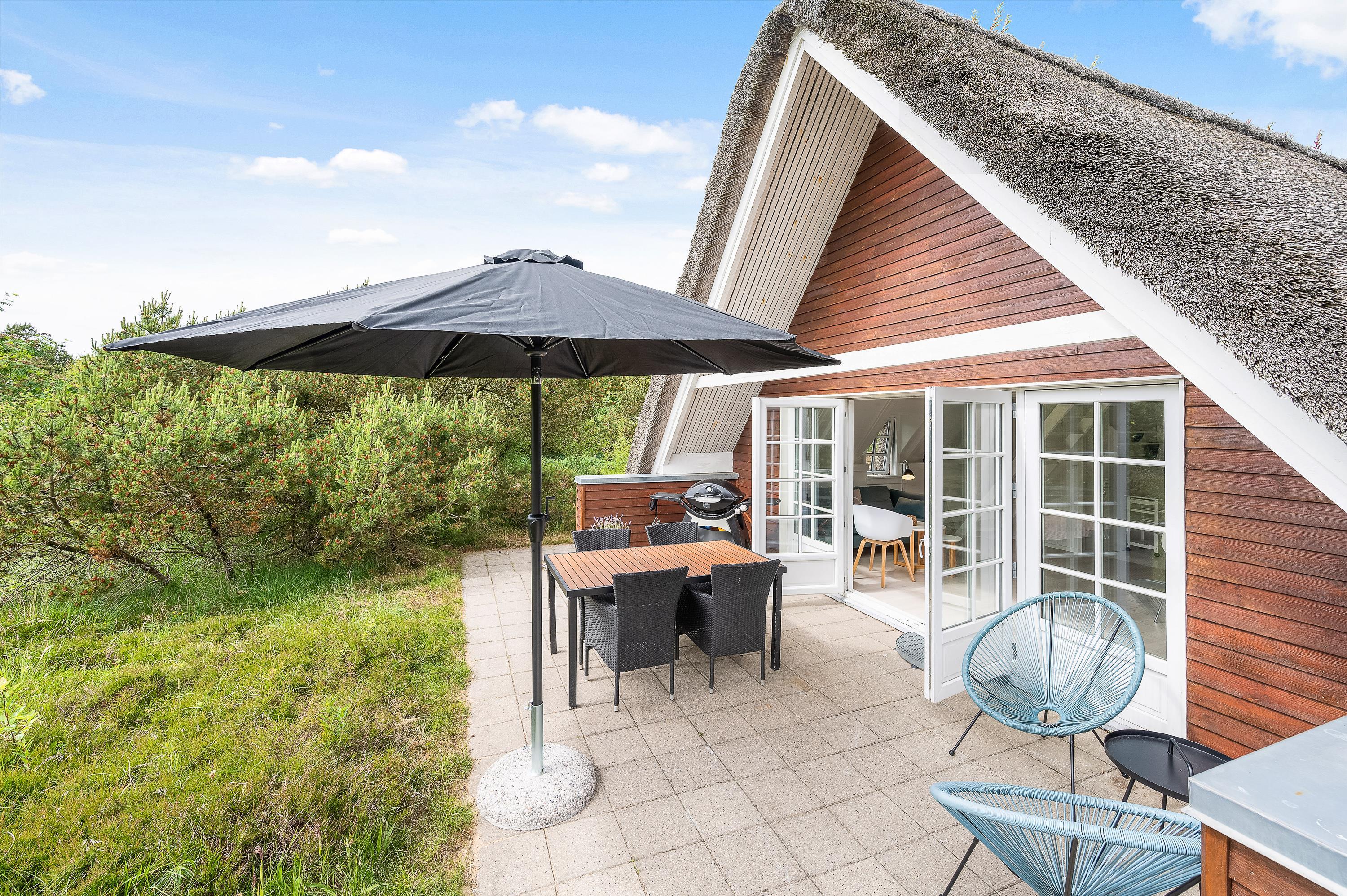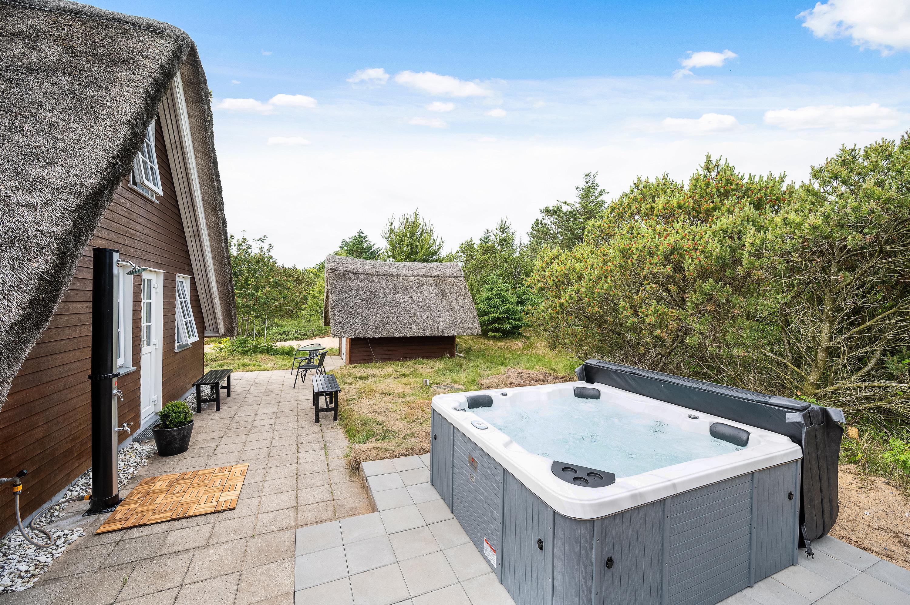 Ægte sommerhusidyl venter jer på adressen Hybenvej 60 i Lodbjerg Hede. Det stråtækte sommerhus har en herlig, ugeneret beliggenhed på en stor naturgrund omgivet af træer og buskads, og på terrassen er der både ude spa og udendørs bruser. Den lyse og indbydende indretning med blandt andet brændeovn rummer plads til 4 personer – et godt valg for en lille familie eller et romantisk ophold for to!
