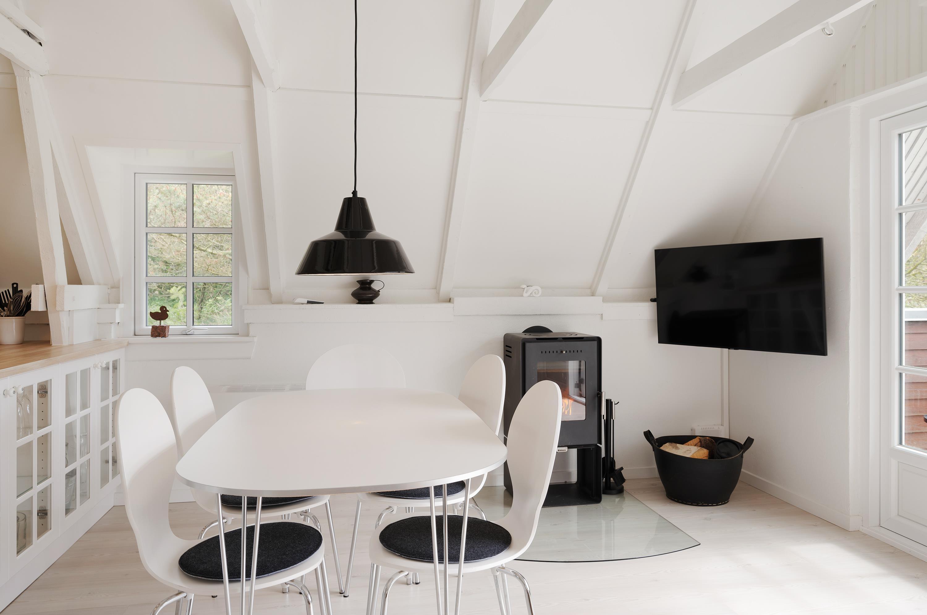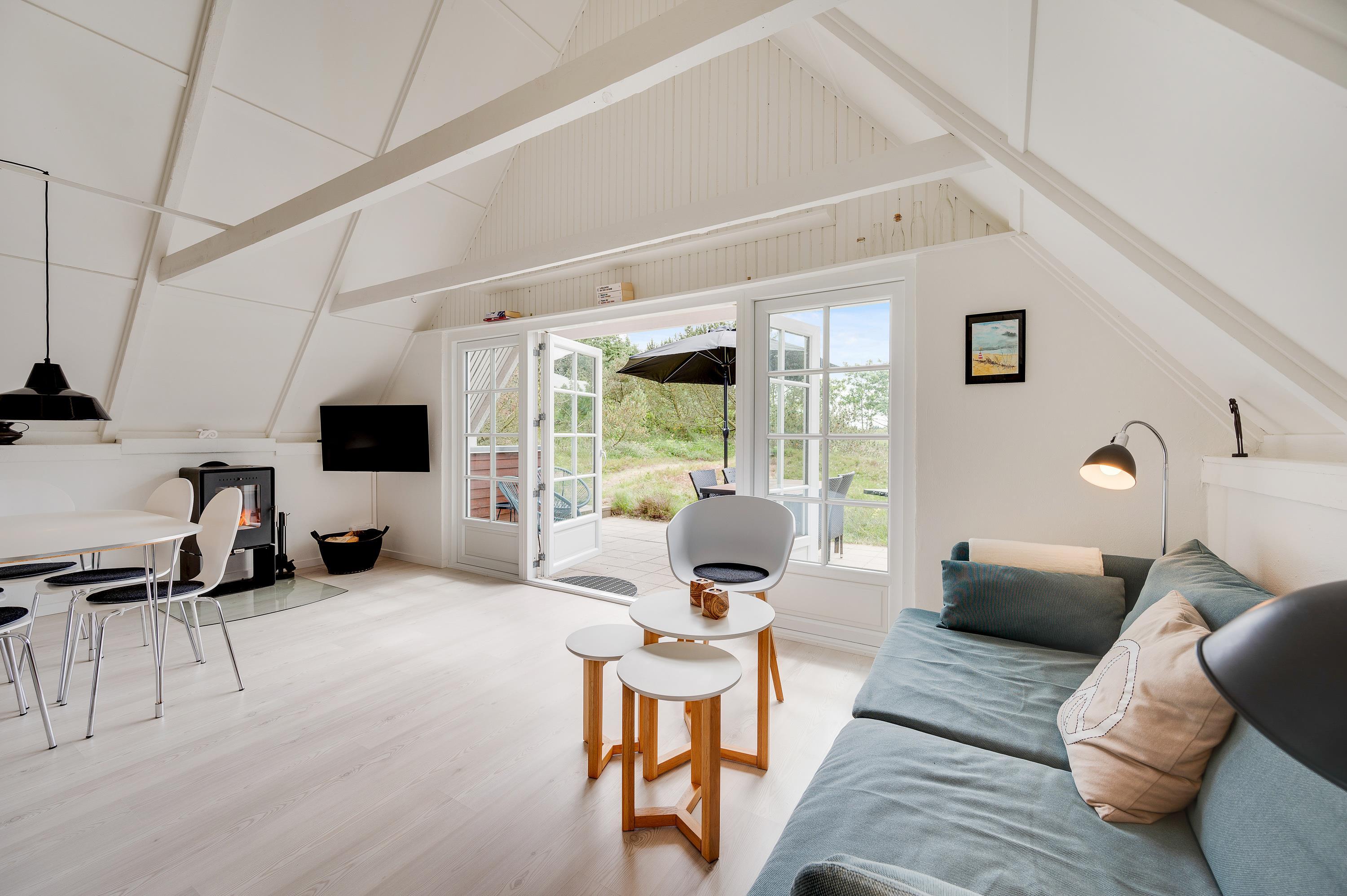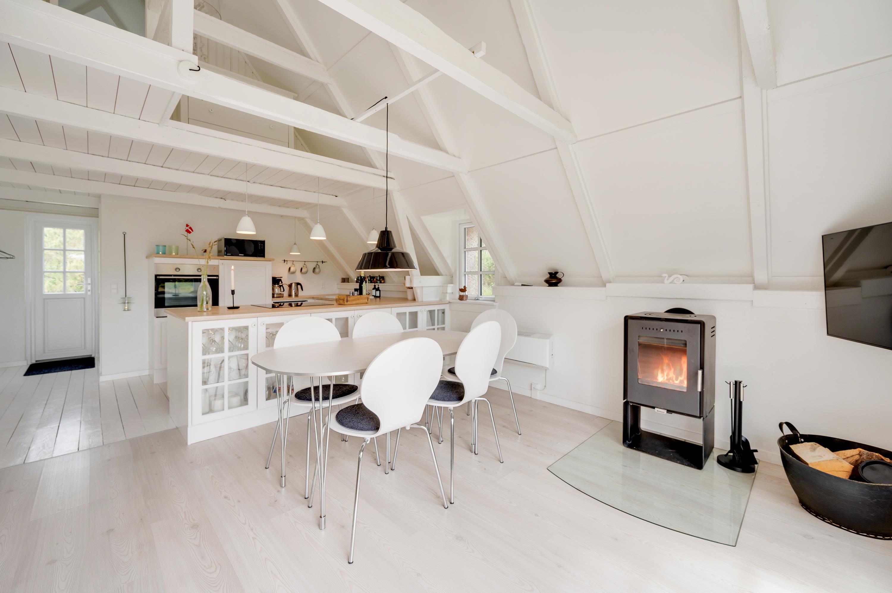 Træsommerhuset har et lyst og indbydende indre fordelt på to etager. På stueetagen finder I det åbne køkkenalrum med brændeovn, loft til kip og et flot udsyn til den grønne natur gennem de sydvendte vinduer. Herfra kommer I også ud på den afskærmede terrasse.