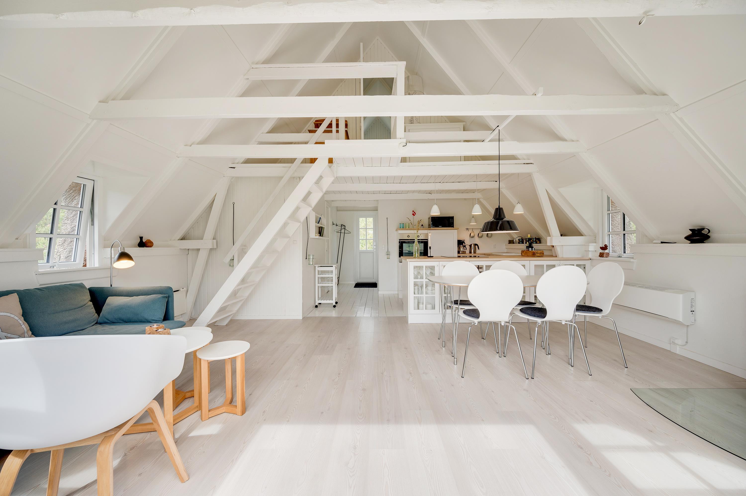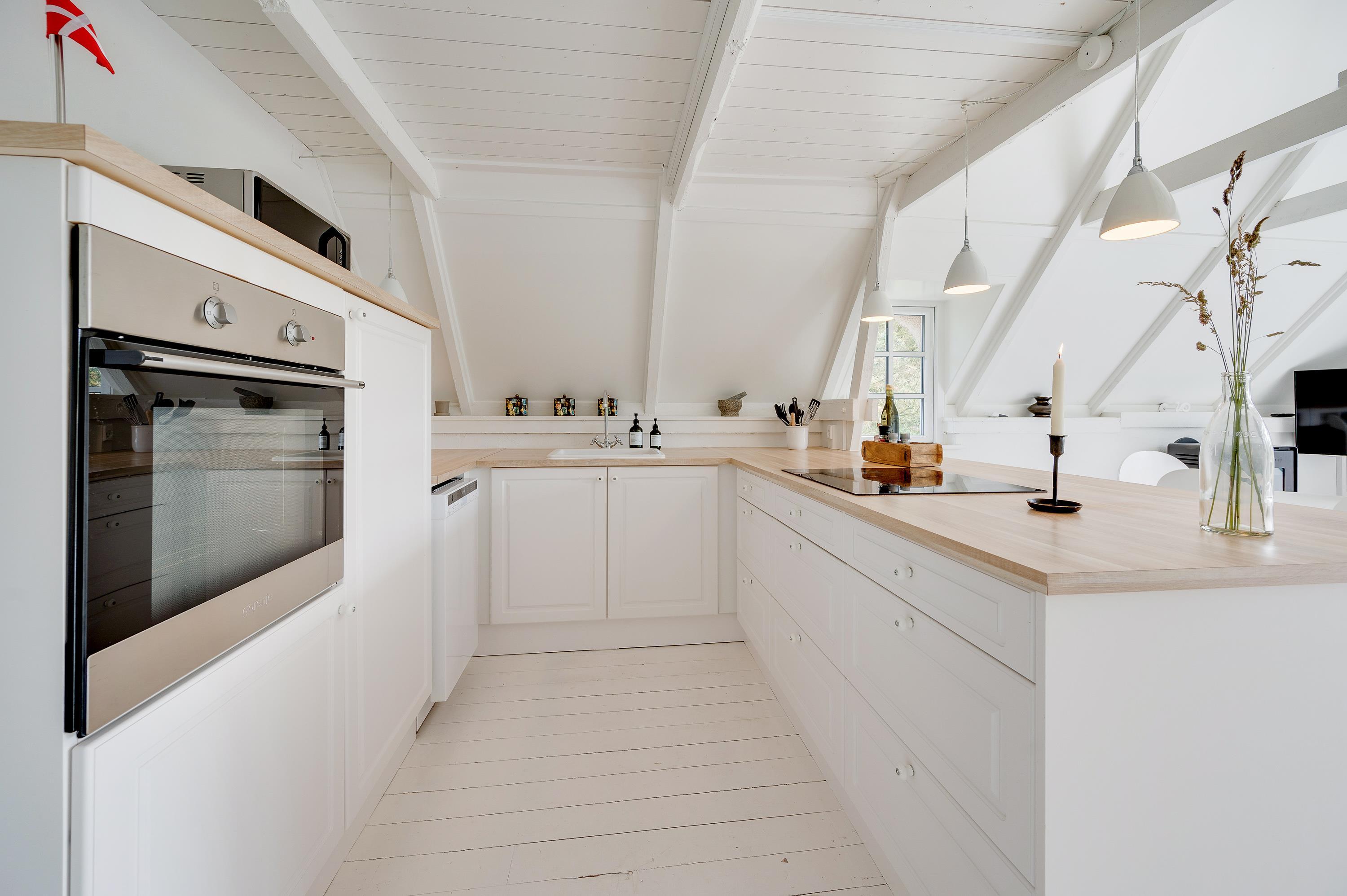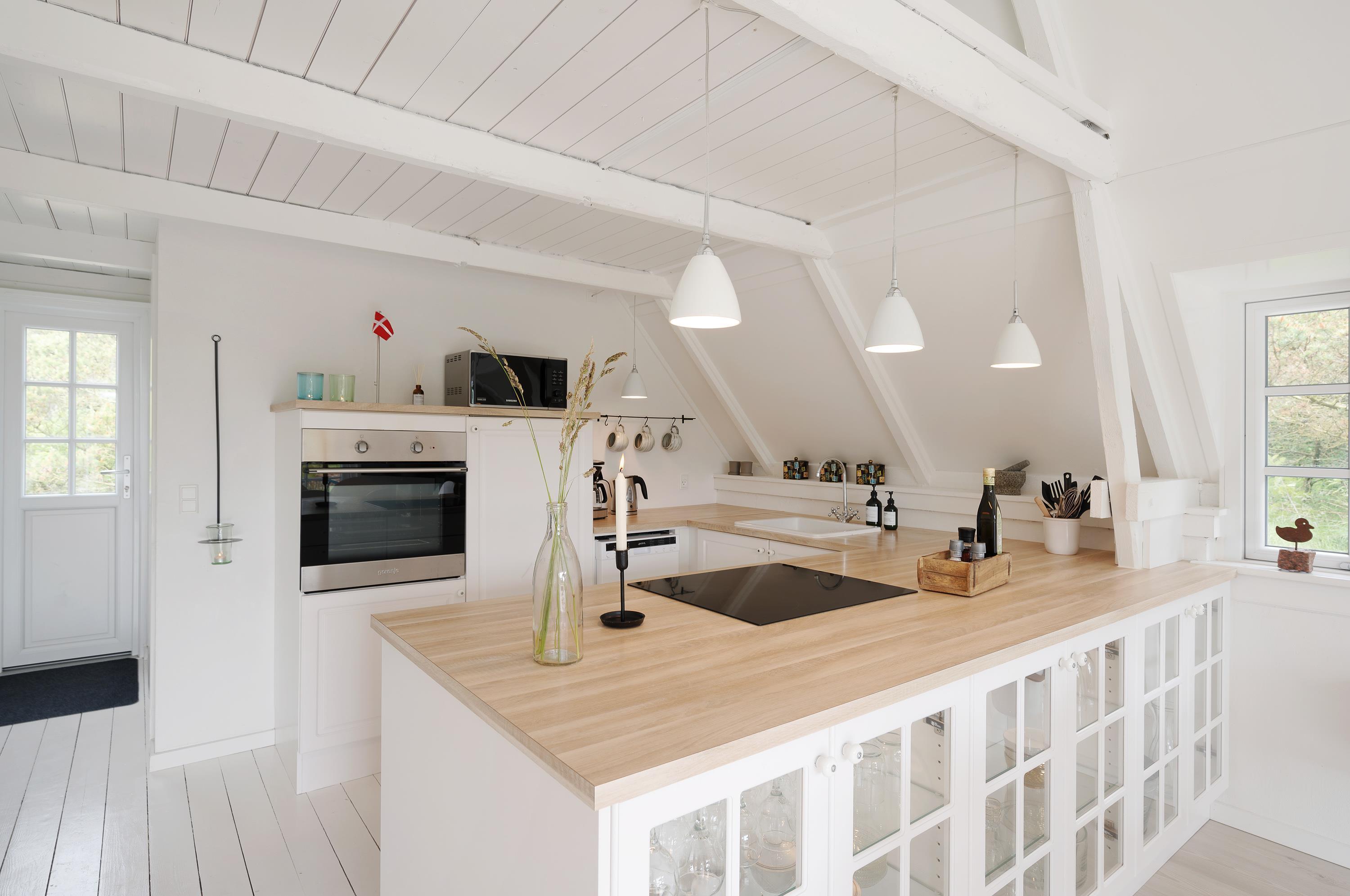Træsommerhuset har et lyst og indbydende indre fordelt på to etager. På stueetagen finder I det åbne køkkenalrum med brændeovn, loft til kip og et flot udsyn til den grønne natur gennem de sydvendte vinduer. Herfra kommer I også ud på den afskærmede terrasse.