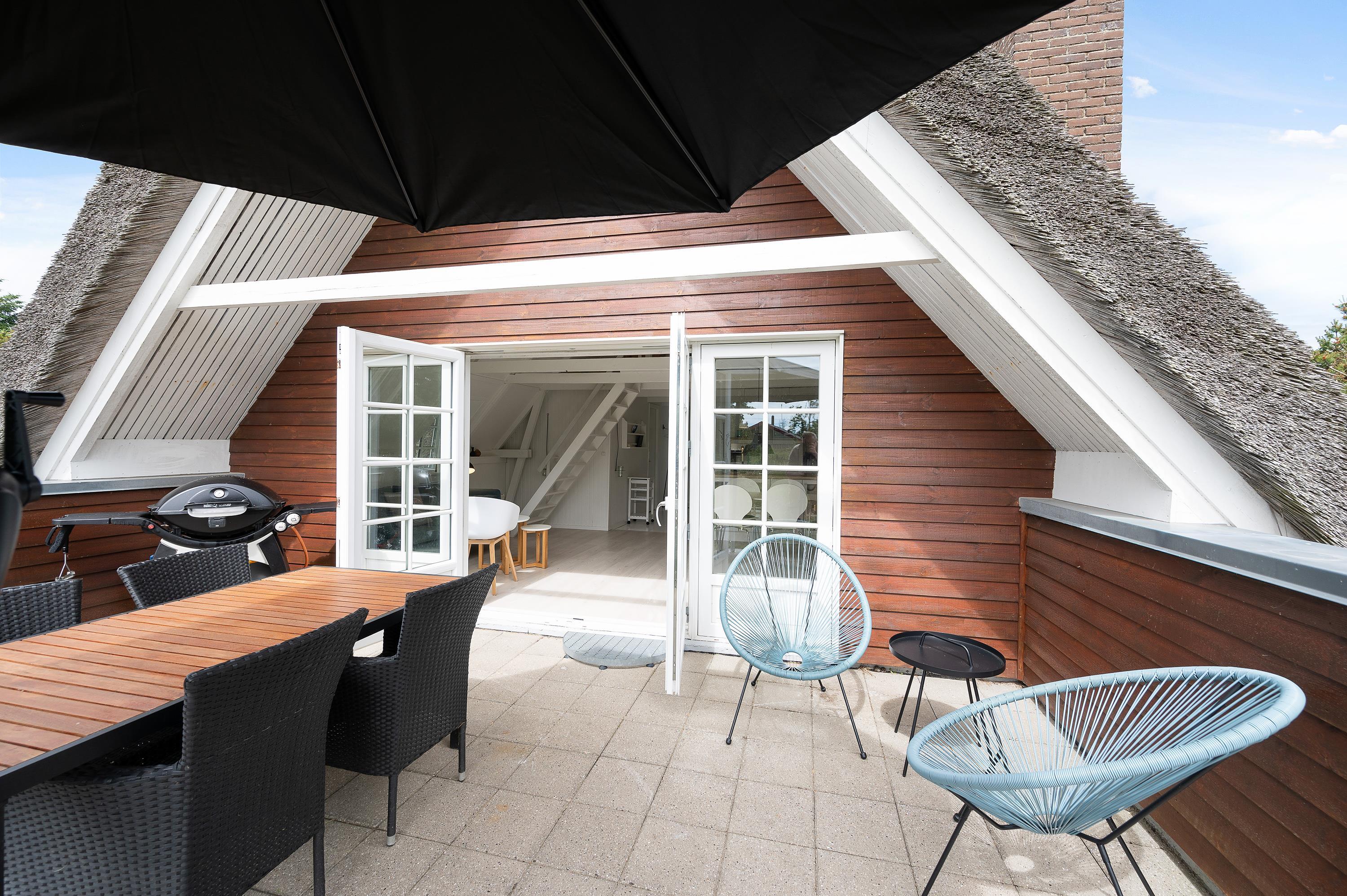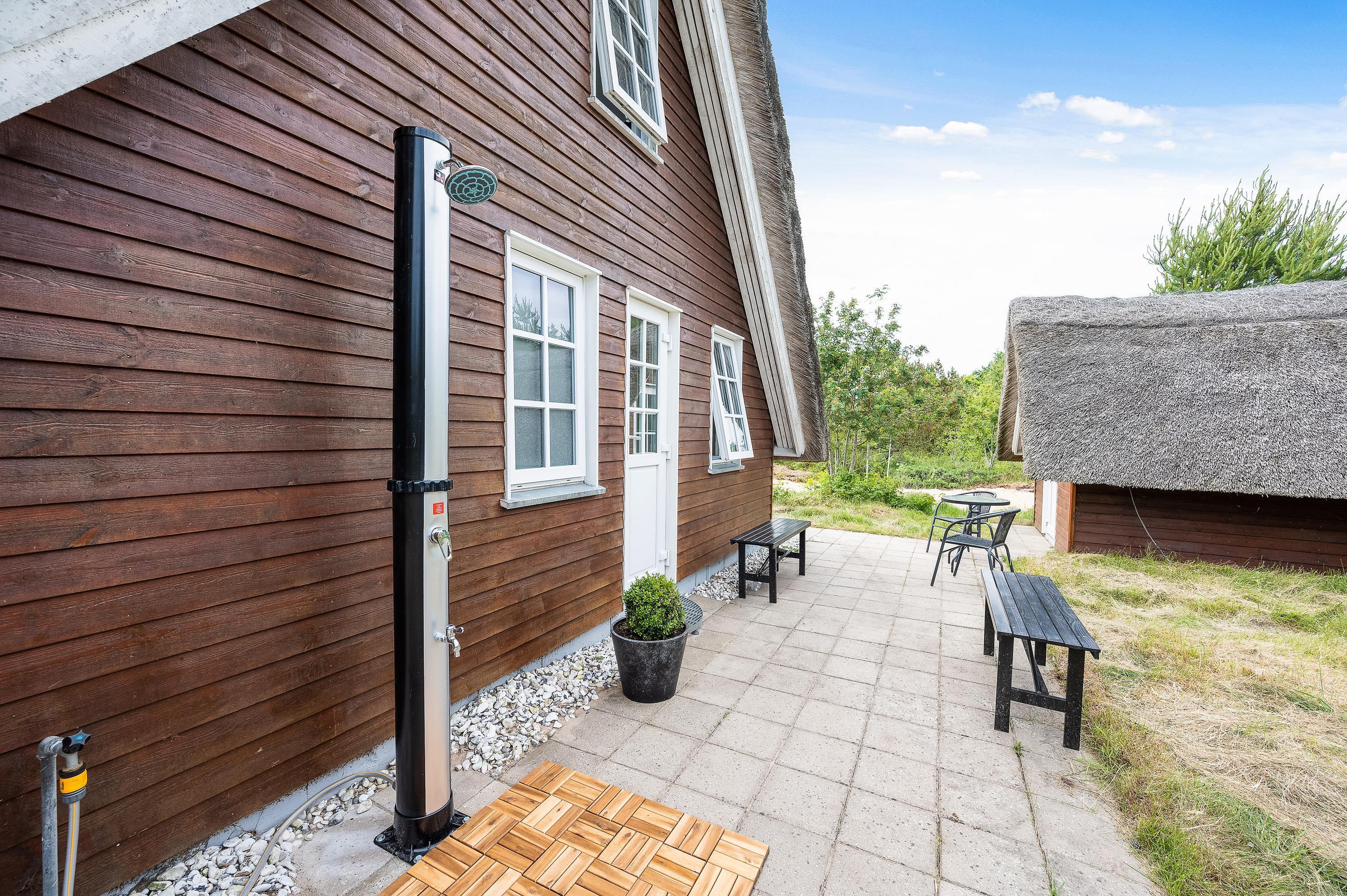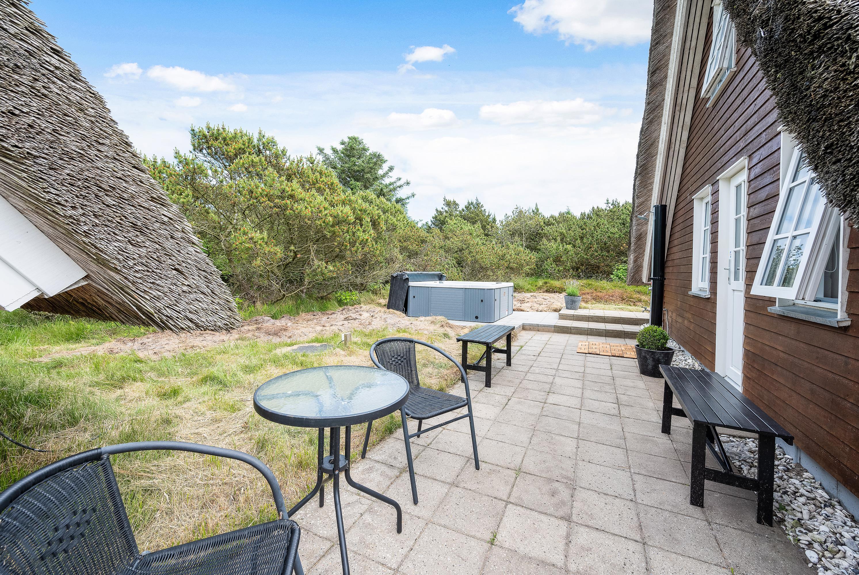 På terrassen kan I nyde den friske luft og Lodbjerg Hedes grønne natur i god ro og fred, og I kan også skrue en ekstra tand op for følelsen af velvære med et dyp i det lækre udendørs spabad. Efter en afslappende session i udespaen kan I få et forfriskende skyl under terrassens udendørsbruser.
