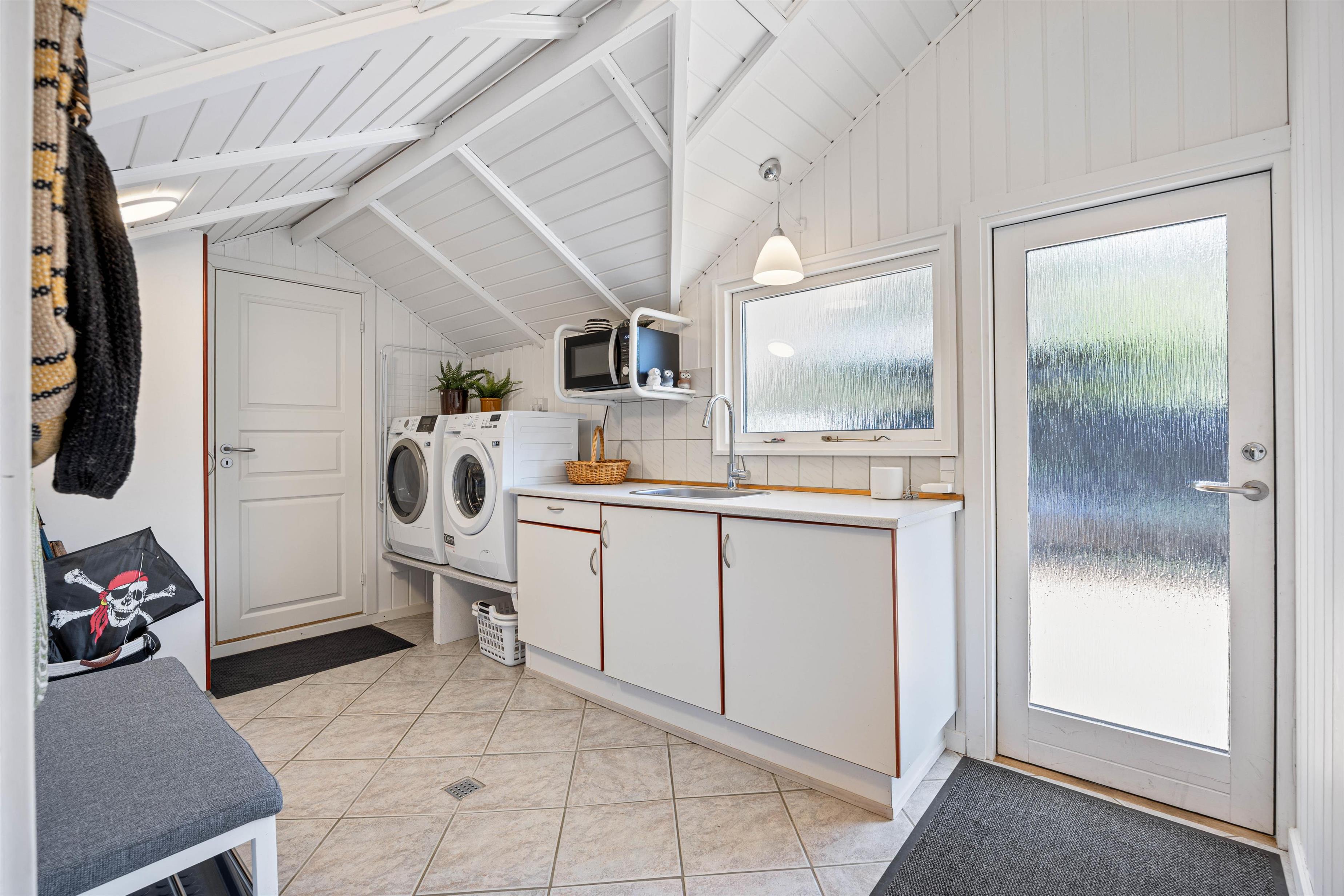 Faciliteterne inkluderer en opvaskemaskine, hvilket gør det let at klare de praktiske pligter, så I kan nyde ferien til fulde. En rummelig, 60L separat fryser er tilgængelig, perfekt til opbevaring af friske lokale råvarer. I får også glæde af en bekvem vaskemaskine og tørretumbler, samt en moderne og energibesparende luft-til-luft varmepumpe, der sikrer en behagelig temperatur hele året rundt. Badeværelset er udstyret med gulvvarme, hvilket sikrer en komfortabel start på dagen.