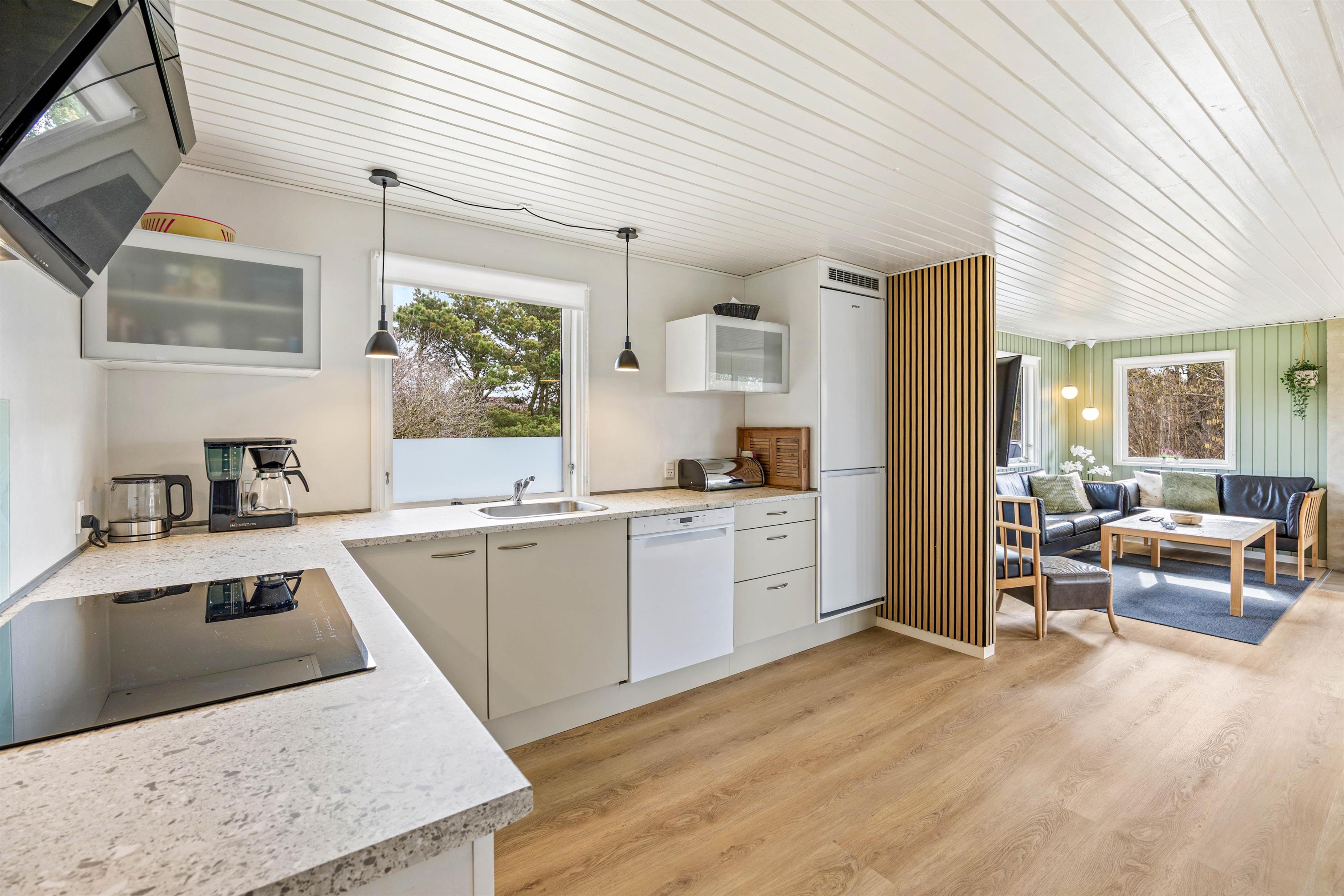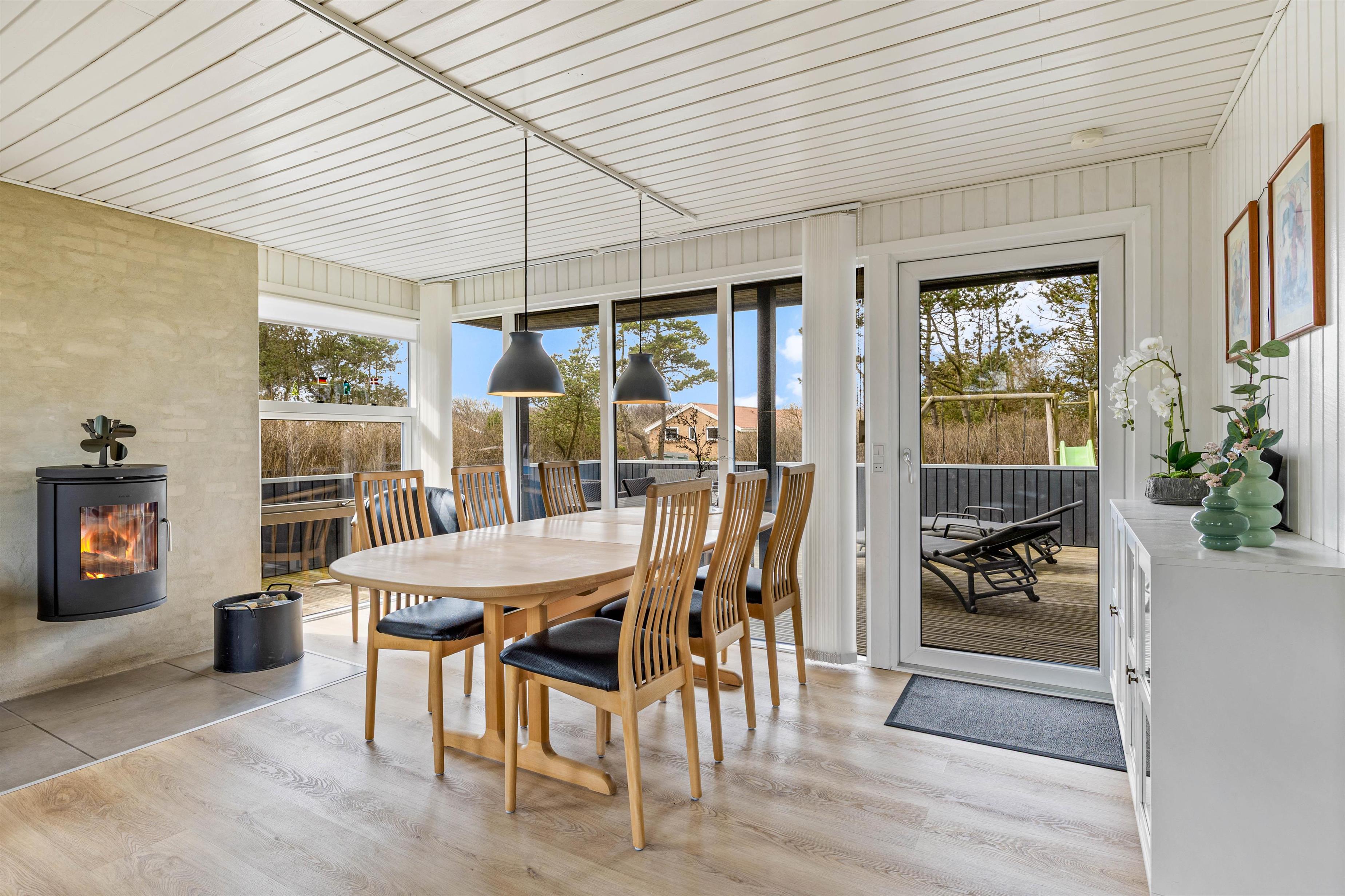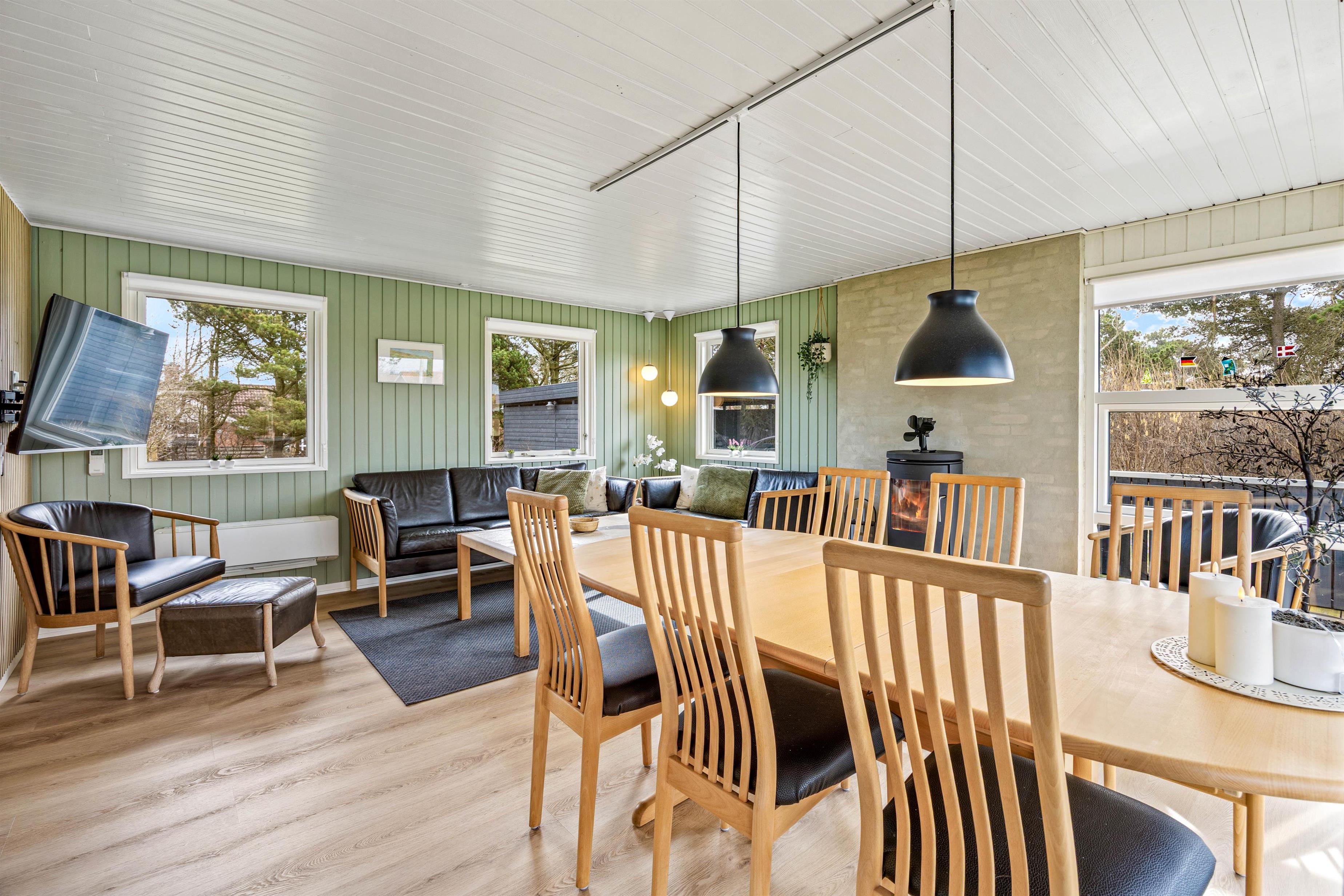 Køkken og stue ligger i forlængelse af hinanden, og det store opholdsrum bliver centrum for samvær og hygge. Her kan I samles rundt om spisebordet til en lækker feriemiddag, en hyggelig filmaften eller et spil kort og en kop kaffe på en kølig feriedag. Brændeovnen sørger for varme og god stemning hele året rundt.