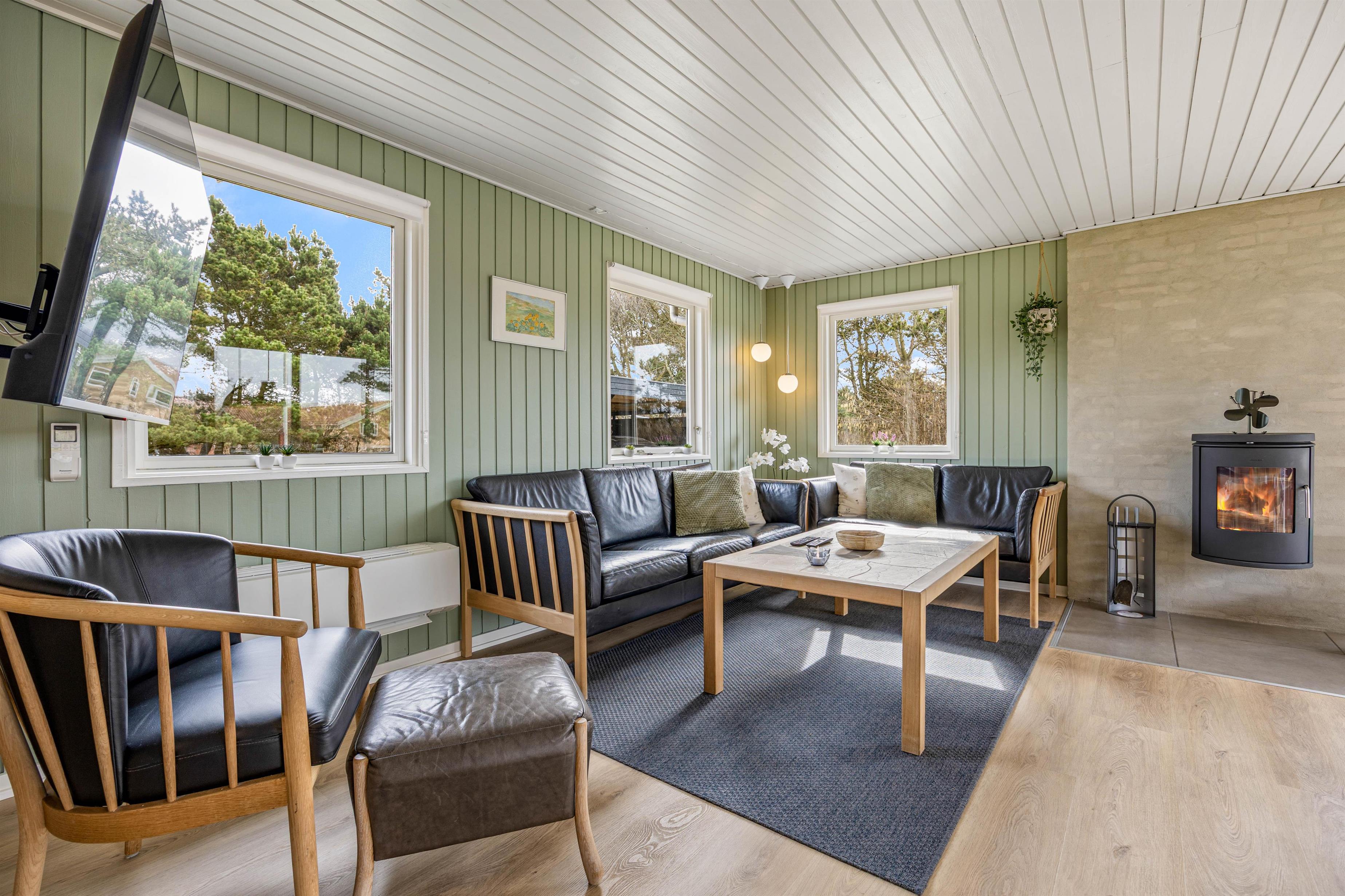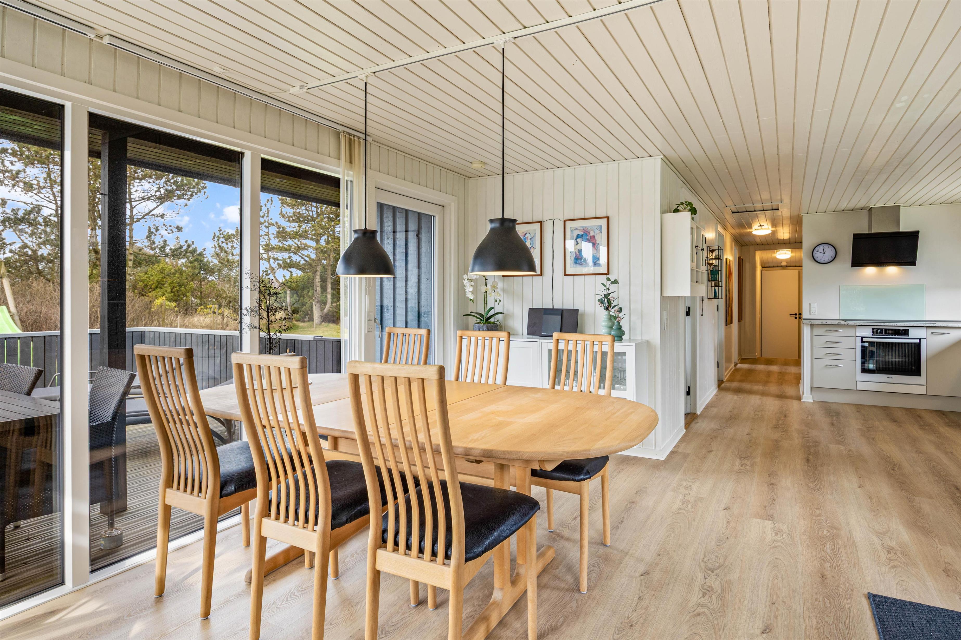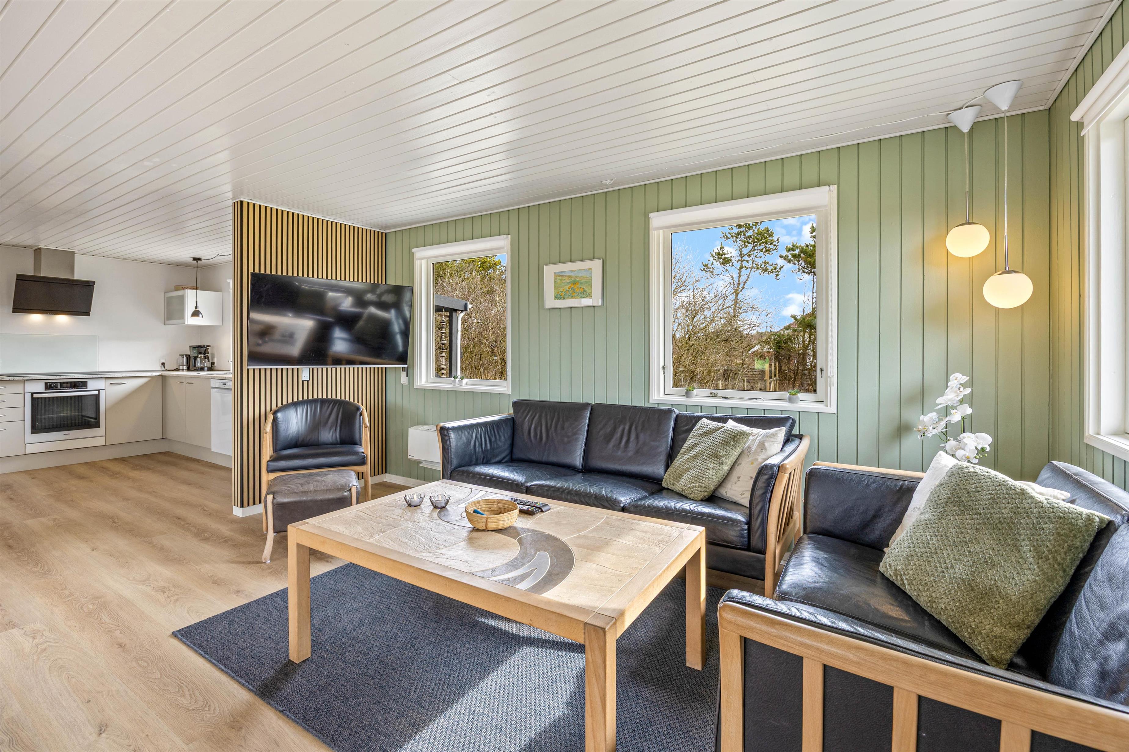 Køkken og stue ligger i forlængelse af hinanden, og det store opholdsrum bliver centrum for samvær og hygge. Her kan I samles rundt om spisebordet til en lækker feriemiddag, en hyggelig filmaften eller et spil kort og en kop kaffe på en kølig feriedag. Brændeovnen sørger for varme og god stemning hele året rundt.