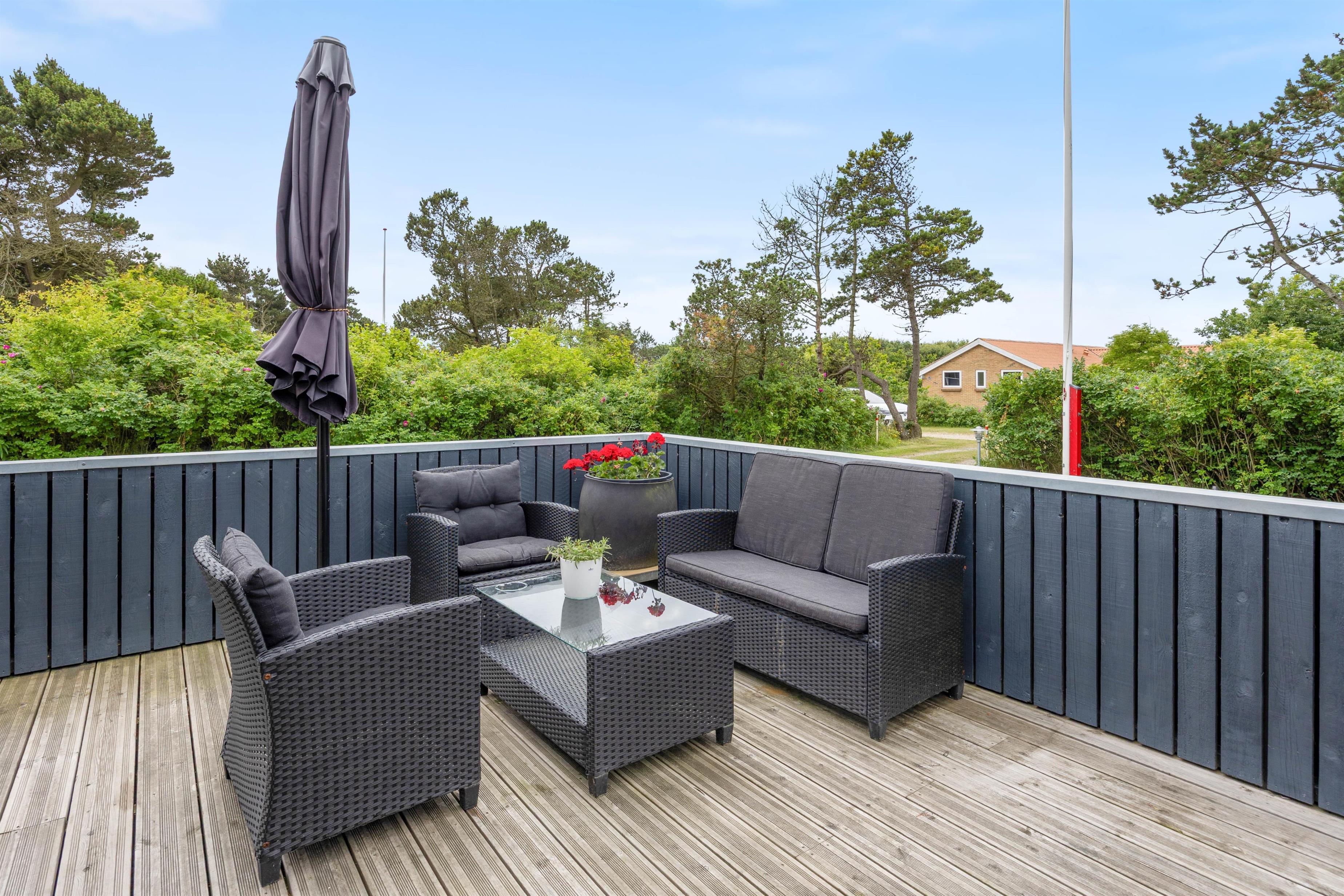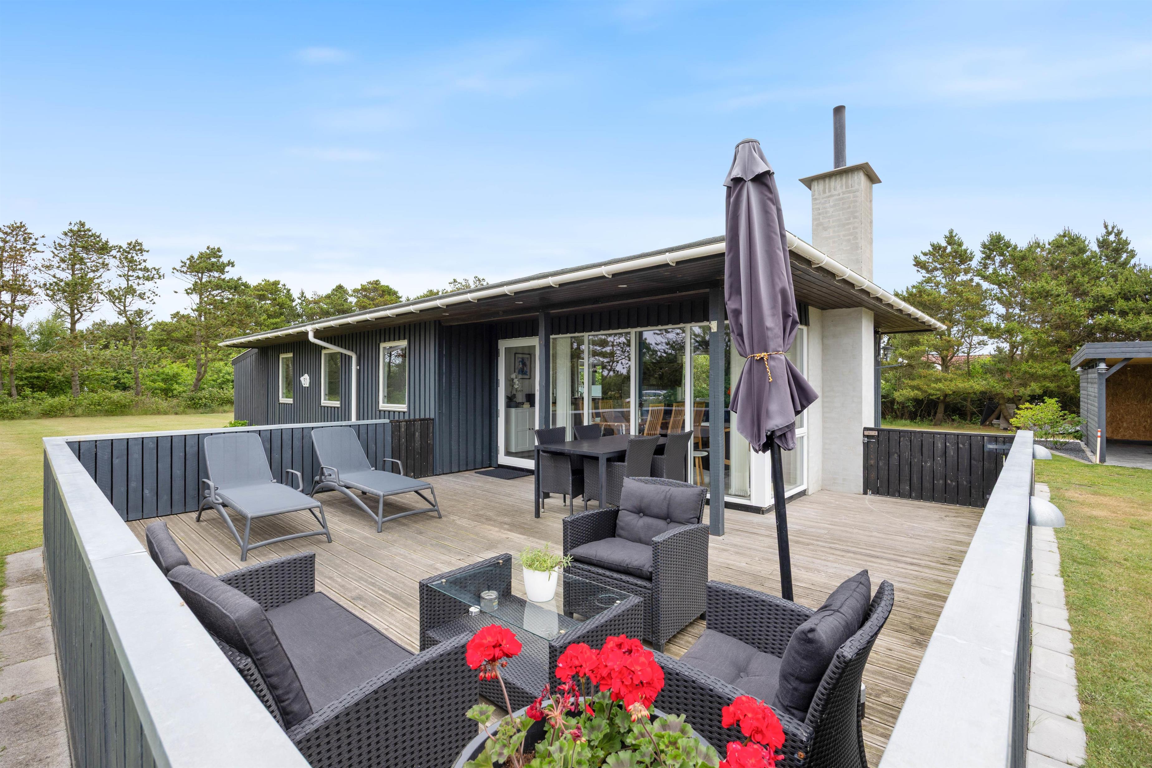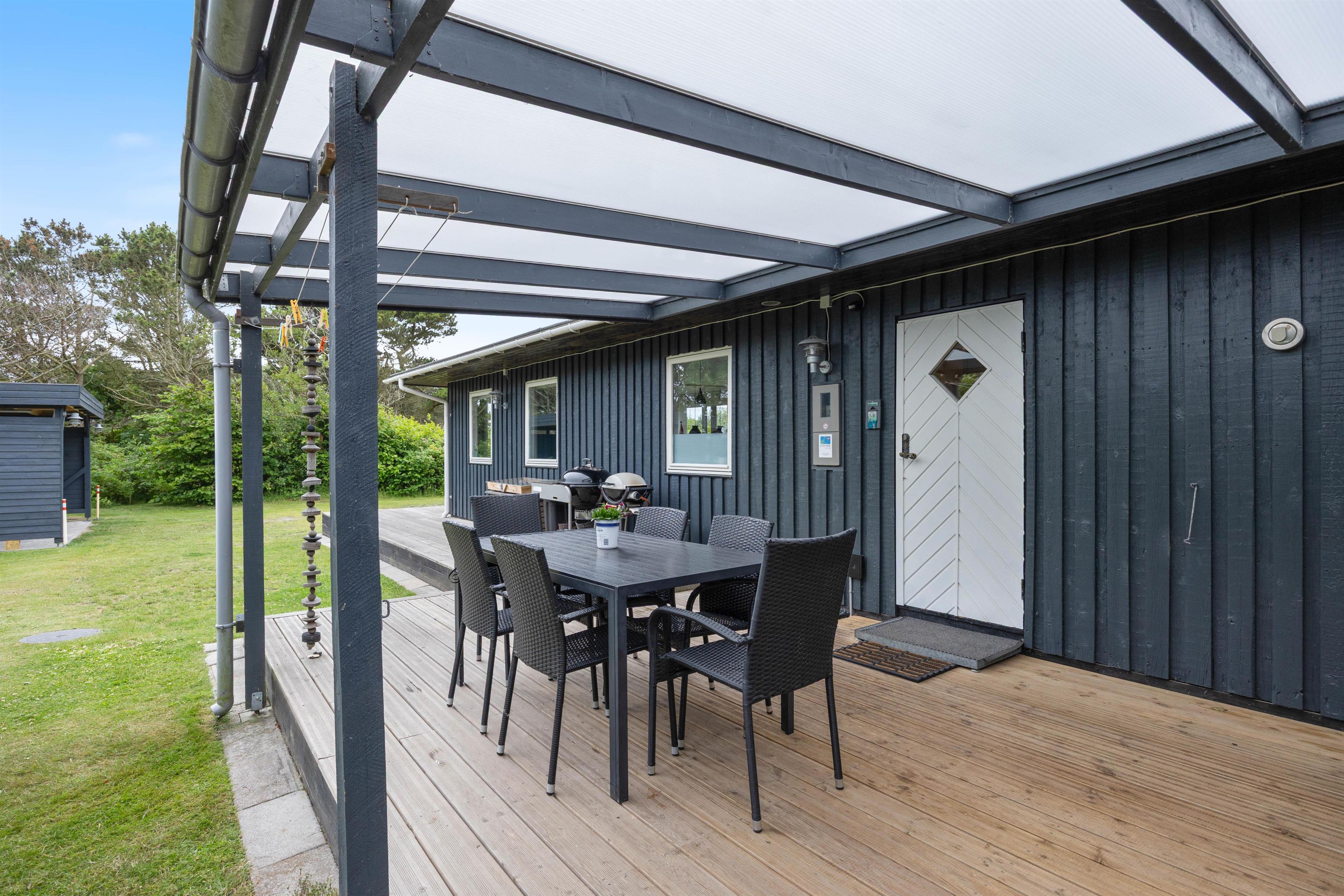 Der er flere skønne terrasser rundt om huset, både en overdækket og en helt lukket terrasse - perfekt til familier med børn og hunde. Der er desuden etableret en indhegnet hundegård i haven på 350 m2. Så der er god plads til, at alle kan få en plads i solen, og den ugenerede beliggenhed giver jer masser af privatliv, når I soler jer i liggestolene eller holder grillhygge under åben himmel.