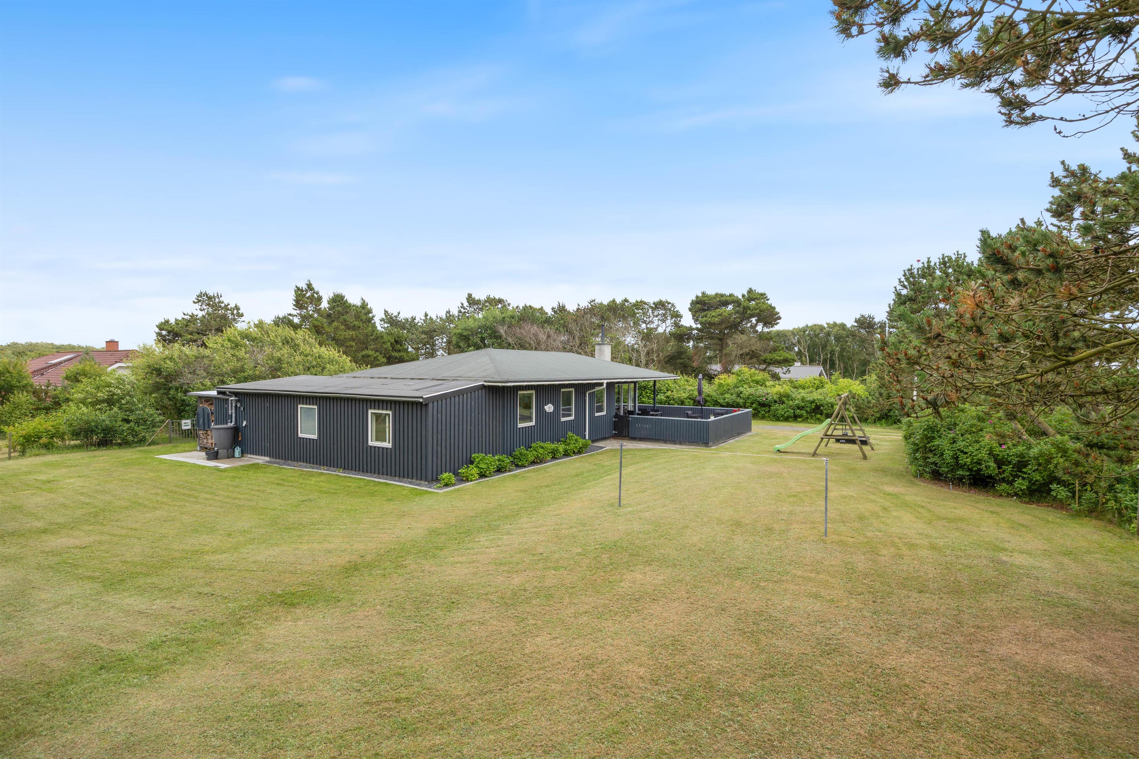 Den store græsplæne er perfekt til leg og boldspil for både børnene og hundene, og der er sat et gyngestativ op, så de mindste gæster er godt underholdt, mens I slapper af i det gode vejr.