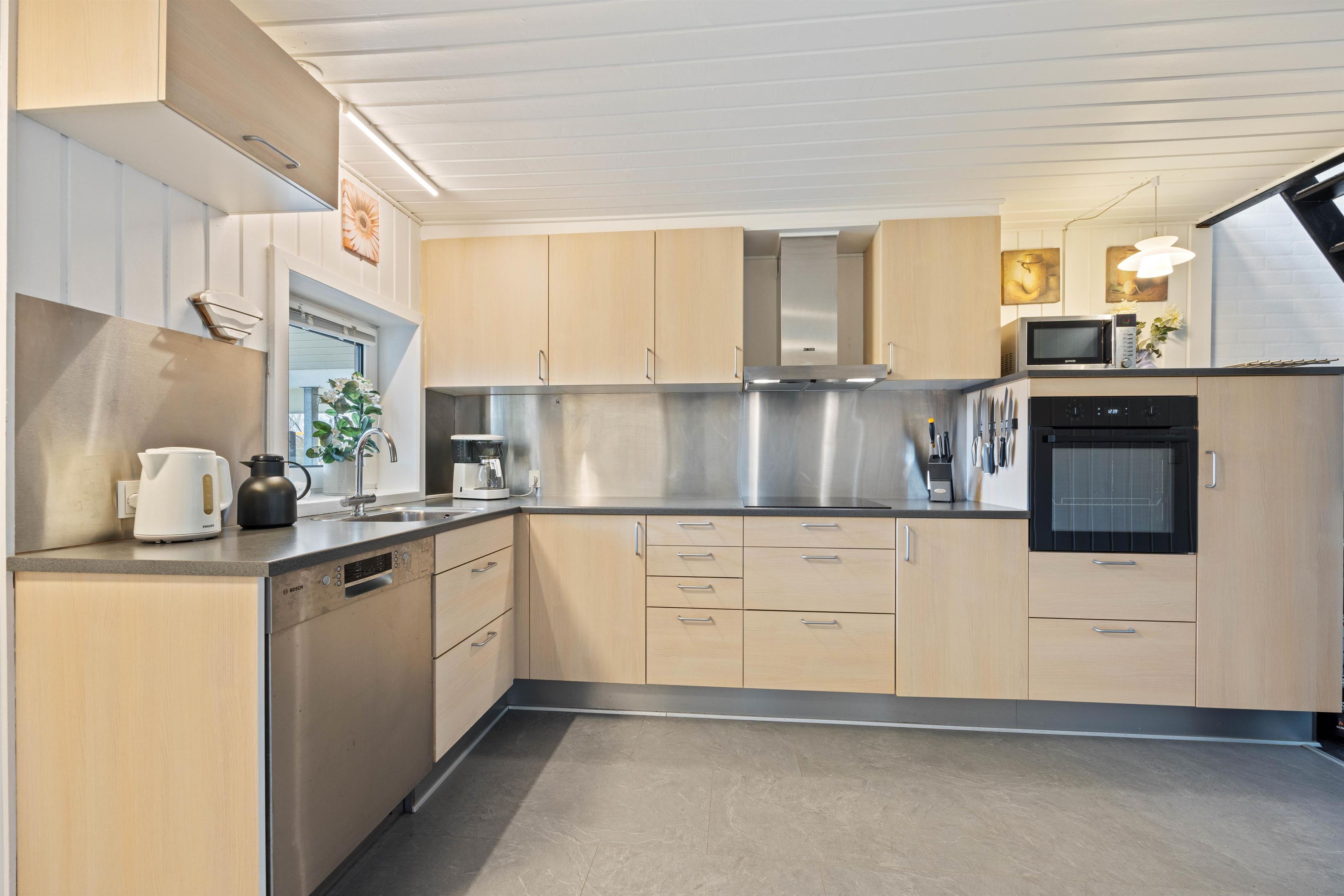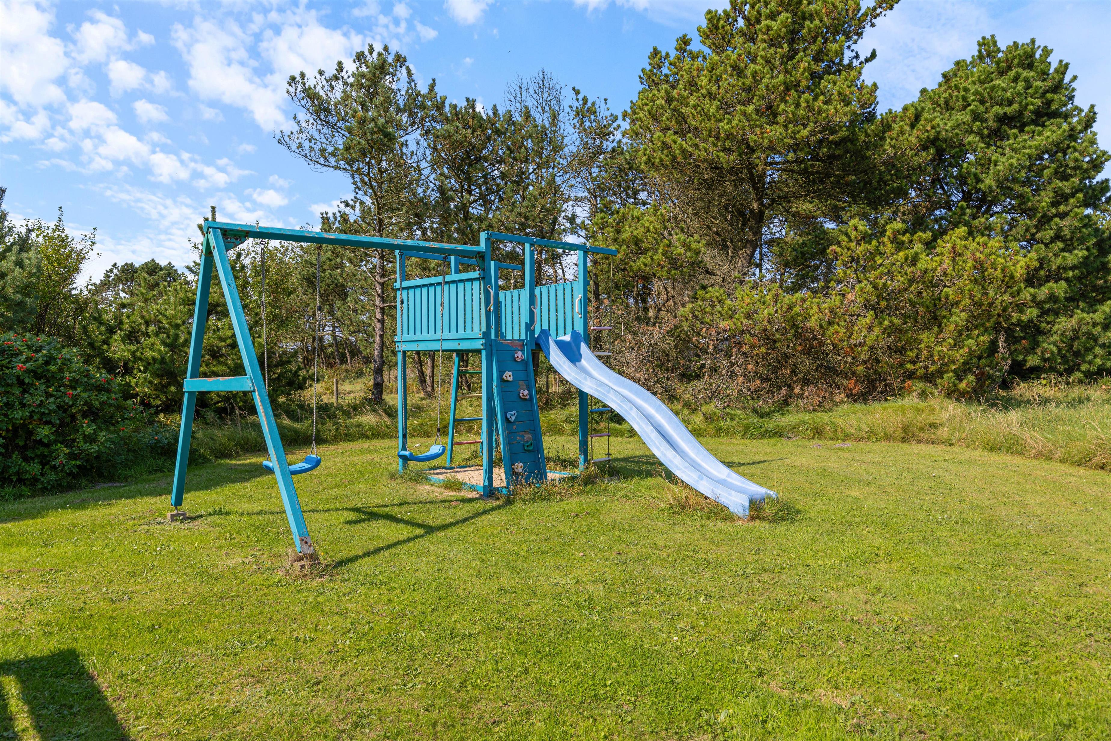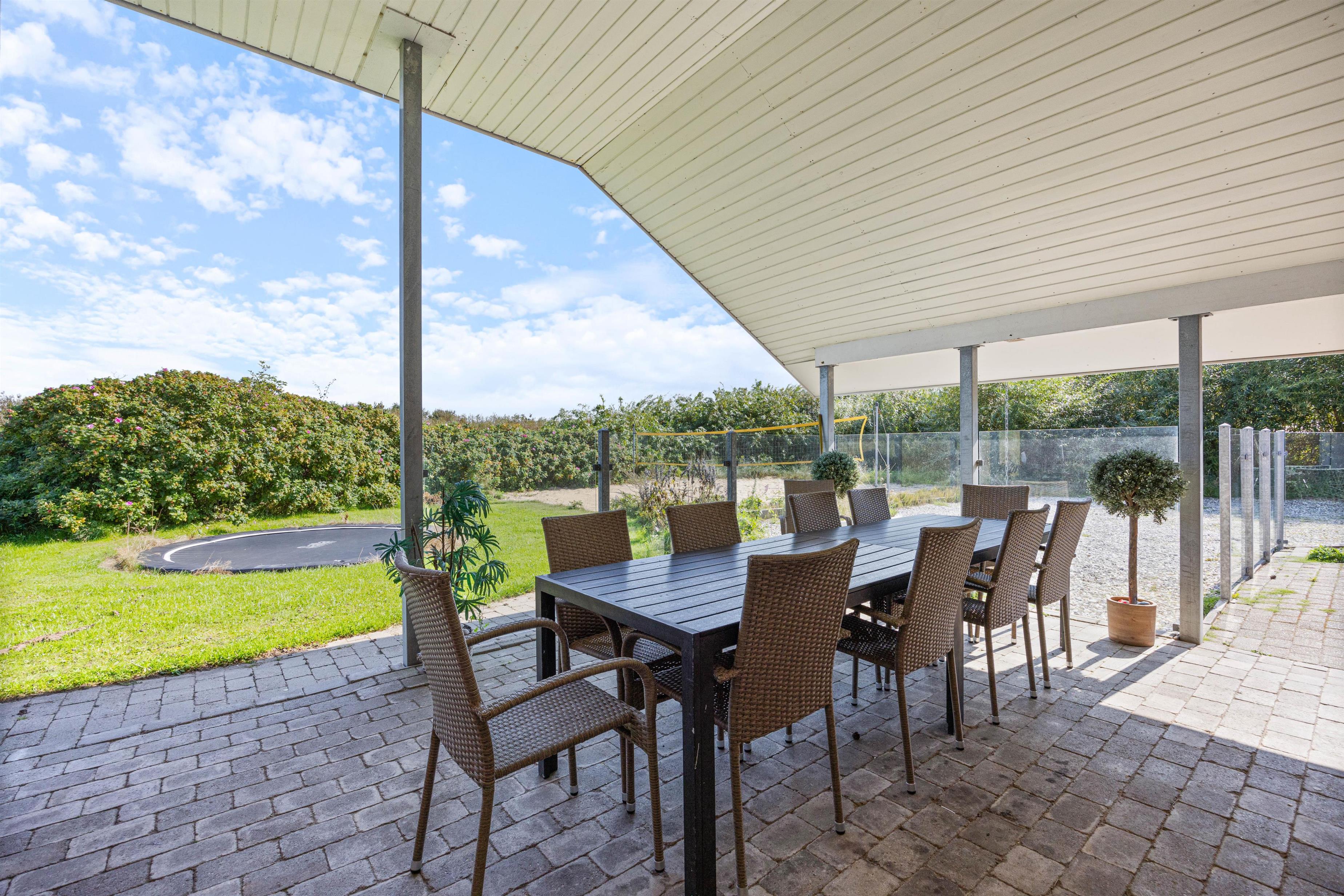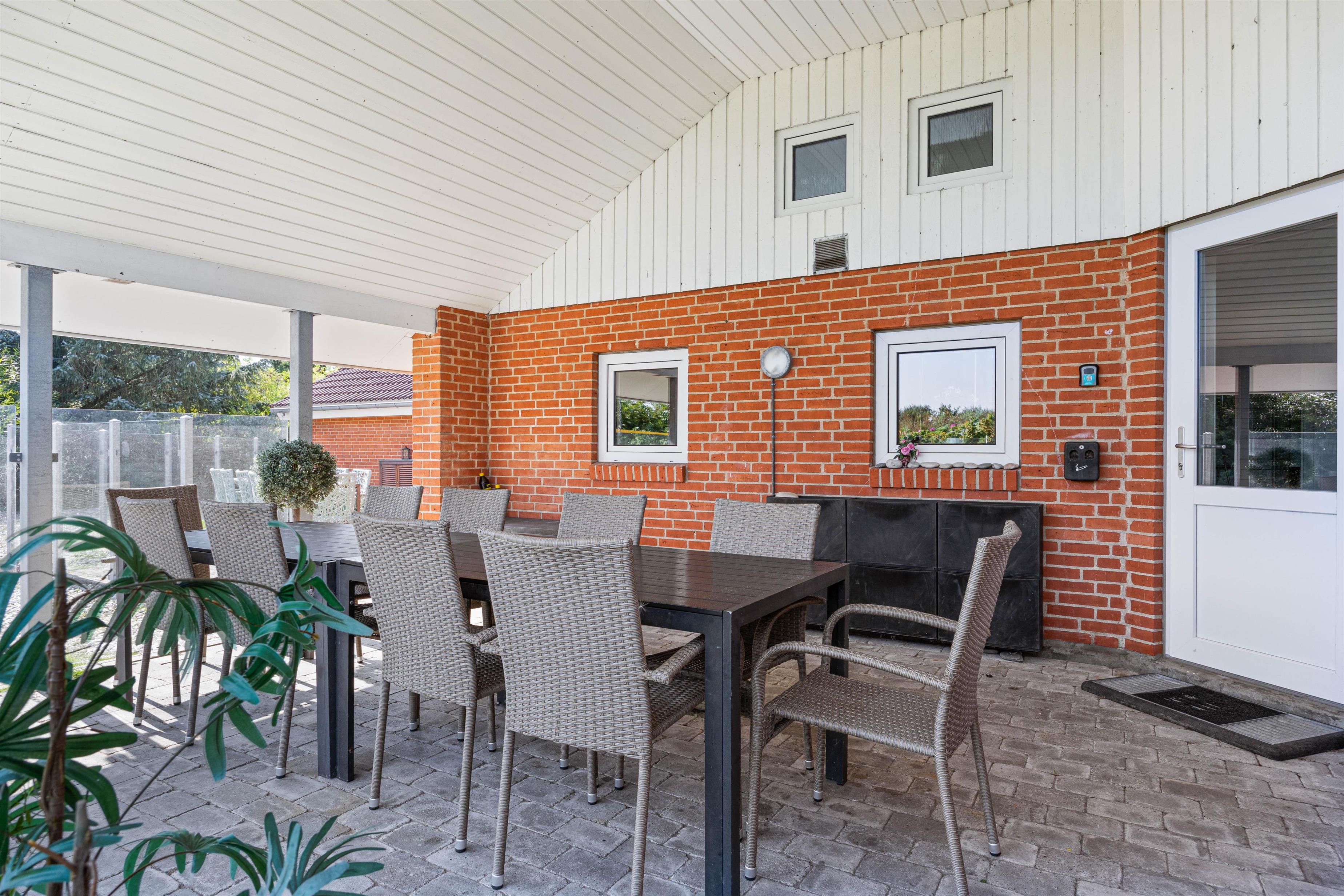 Fra køkkenet er der adgang til den overdækkede terrasse, som er delvist afskærmet. Her kan alle finde deres yndlingsplads, selv hvis det regner. Mens I sætter jer til rette i havemøblerne, kan børnene boltre sig på gyngen eller bygge fantastiske sandslotte i sandkassen. Om aftenen kan I runde en dejlig feriedag af med en lækker grillaften.