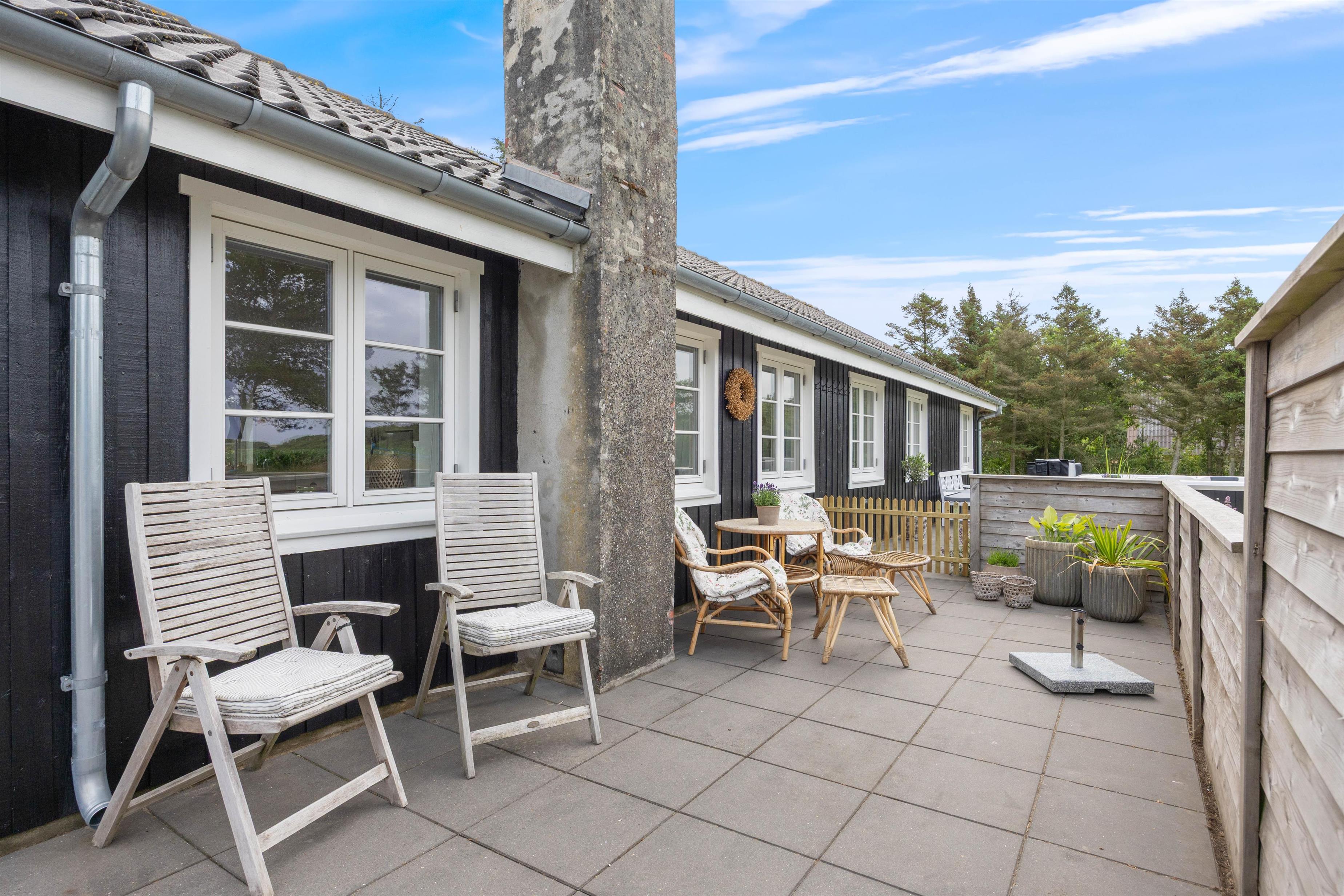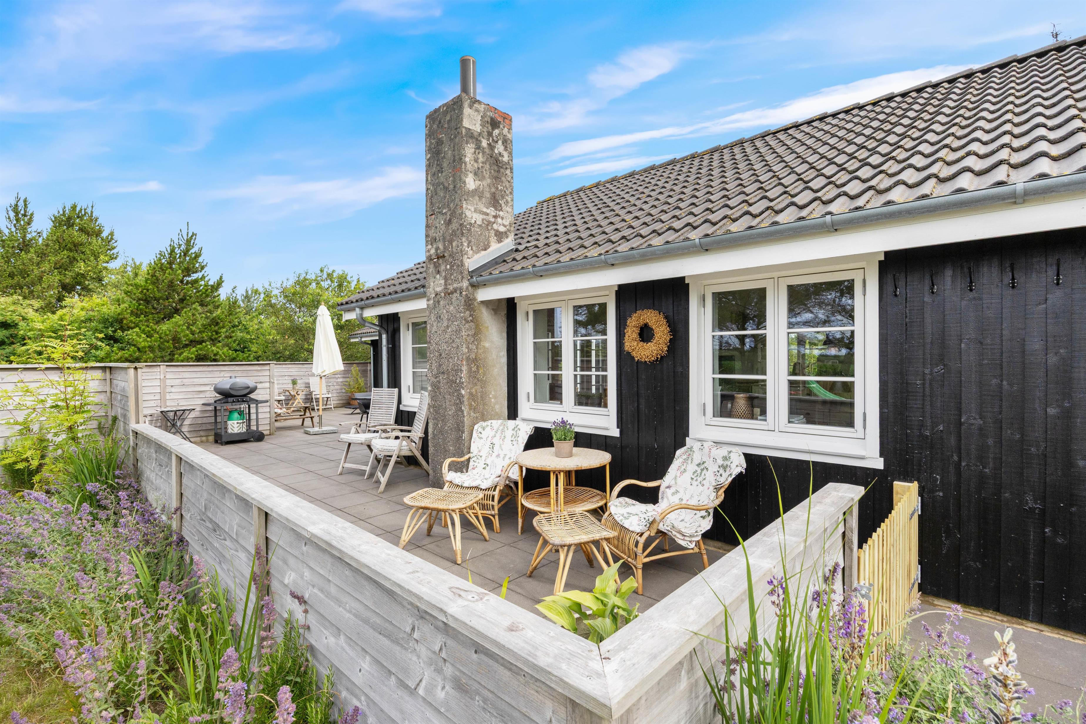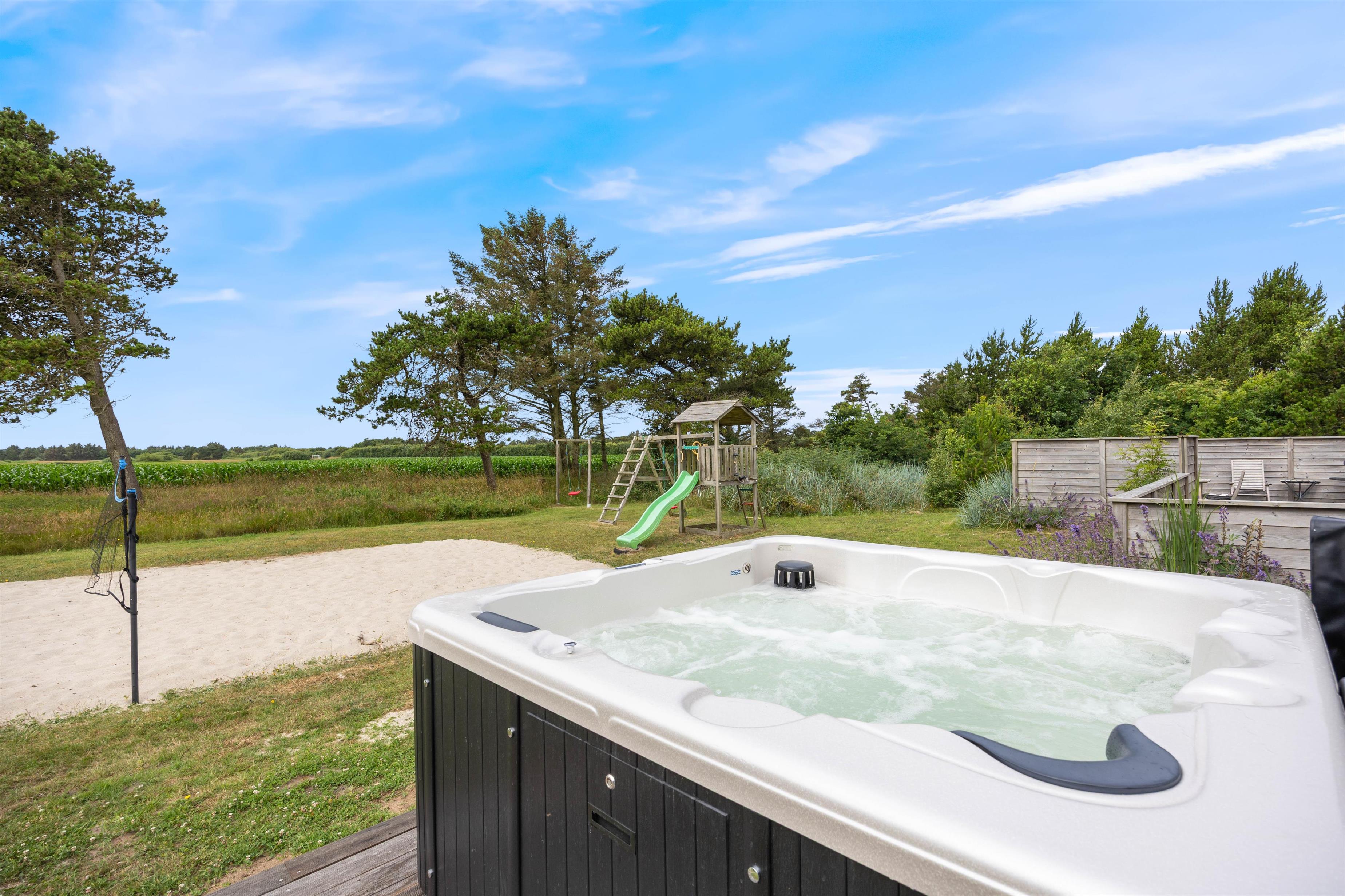 Det er ikke kun indenfor, at der er lagt op til gode stunder. Udenfor finder I en lukket og afskærmet terrasse, der byder på afslapning og gode muligheder for aktiviteter for de små. Terrassen er naturligvis udstyret med møbler og liggestole, og som noget ekstra lækkert finder I her også en udespa. Udover terrassen finder I på grunden både sandkasse og gyngestativ, hvor børnene kan tilbringe mange timers sjov.
