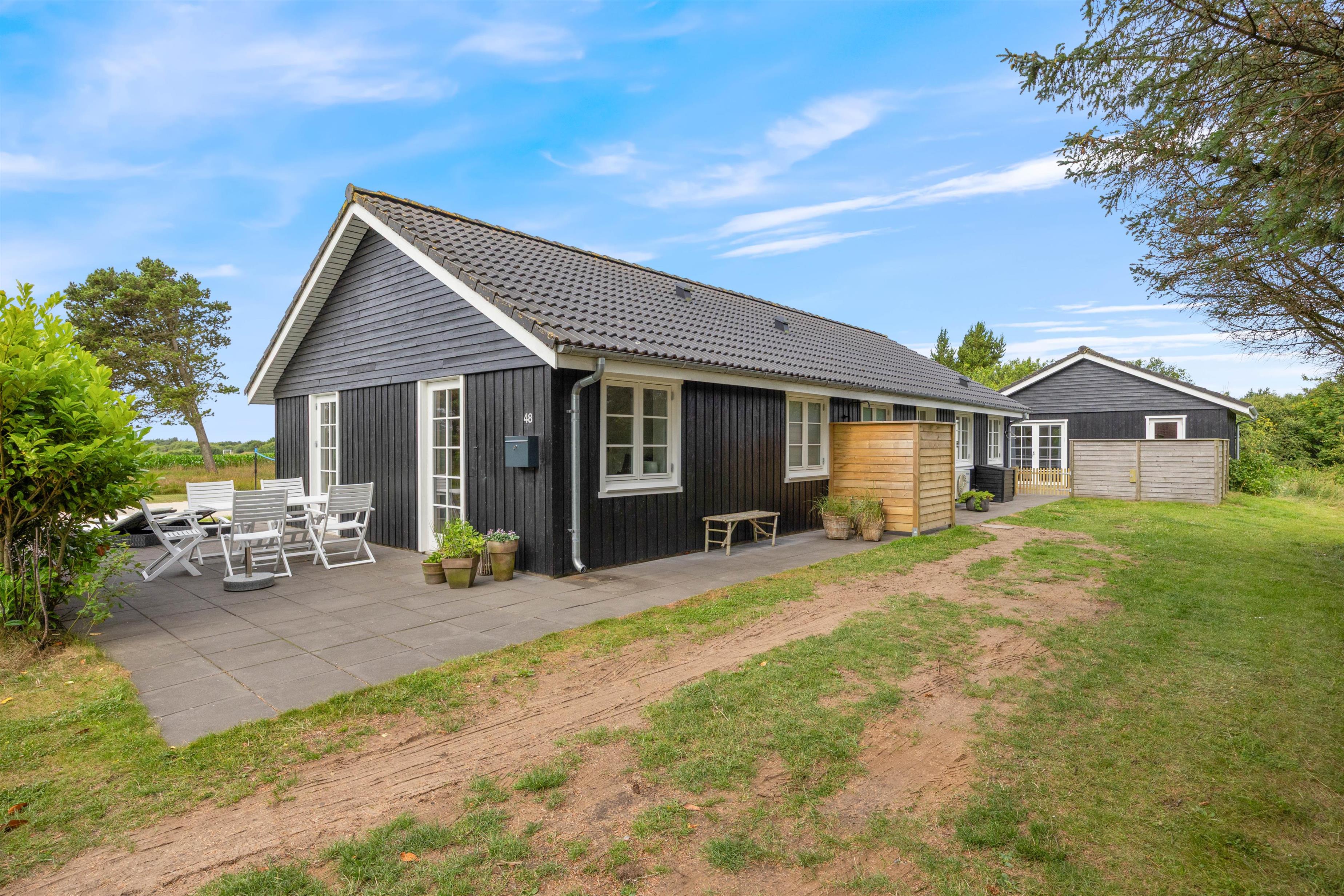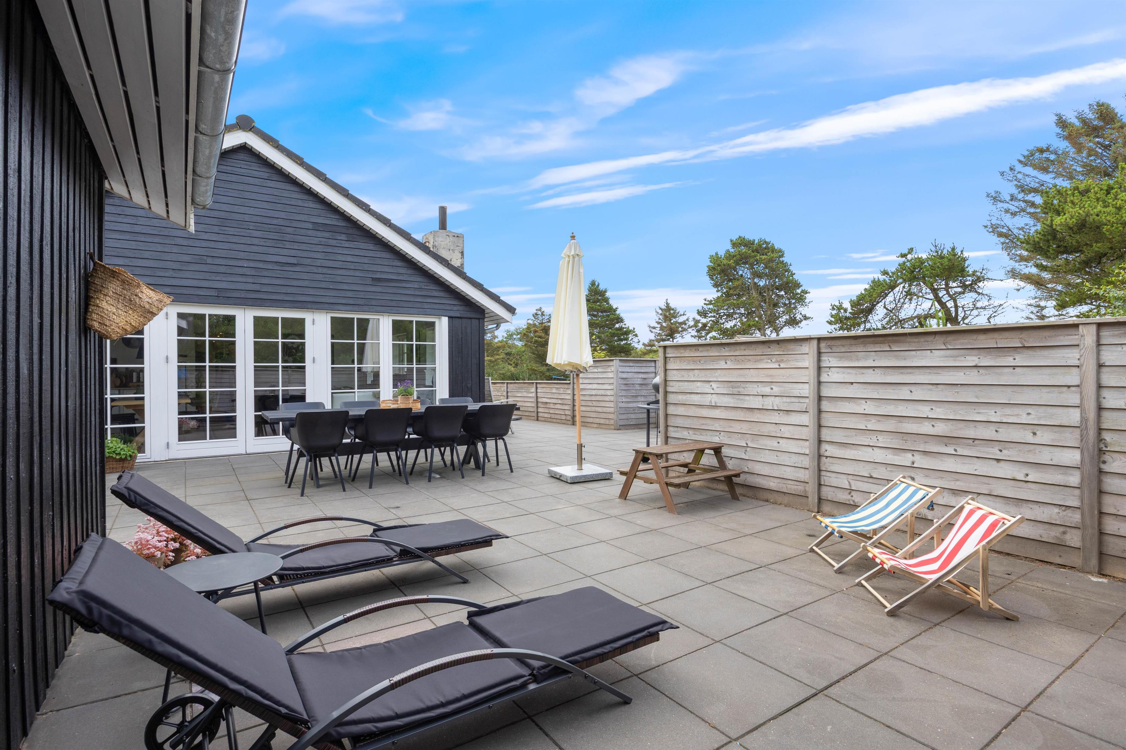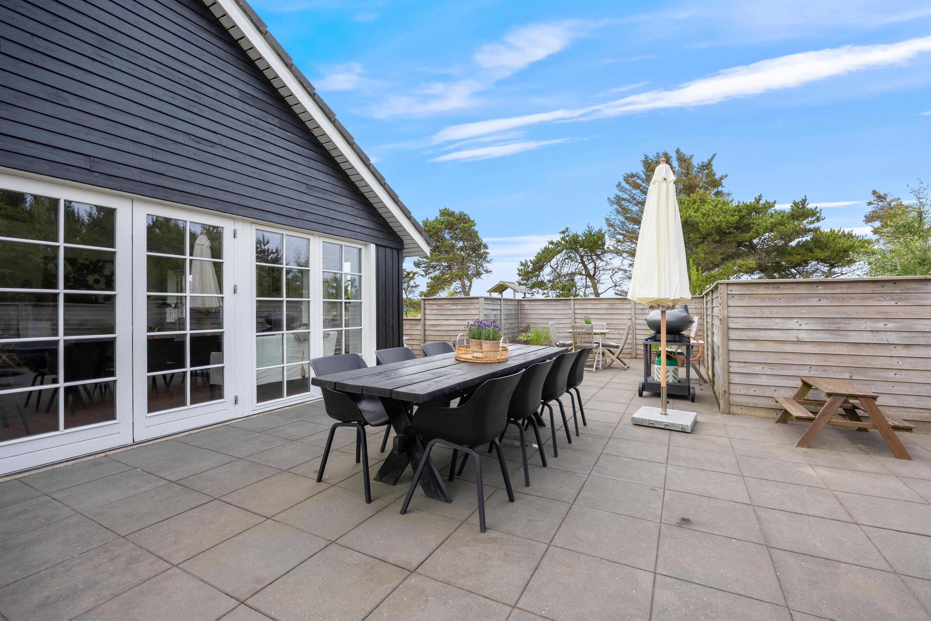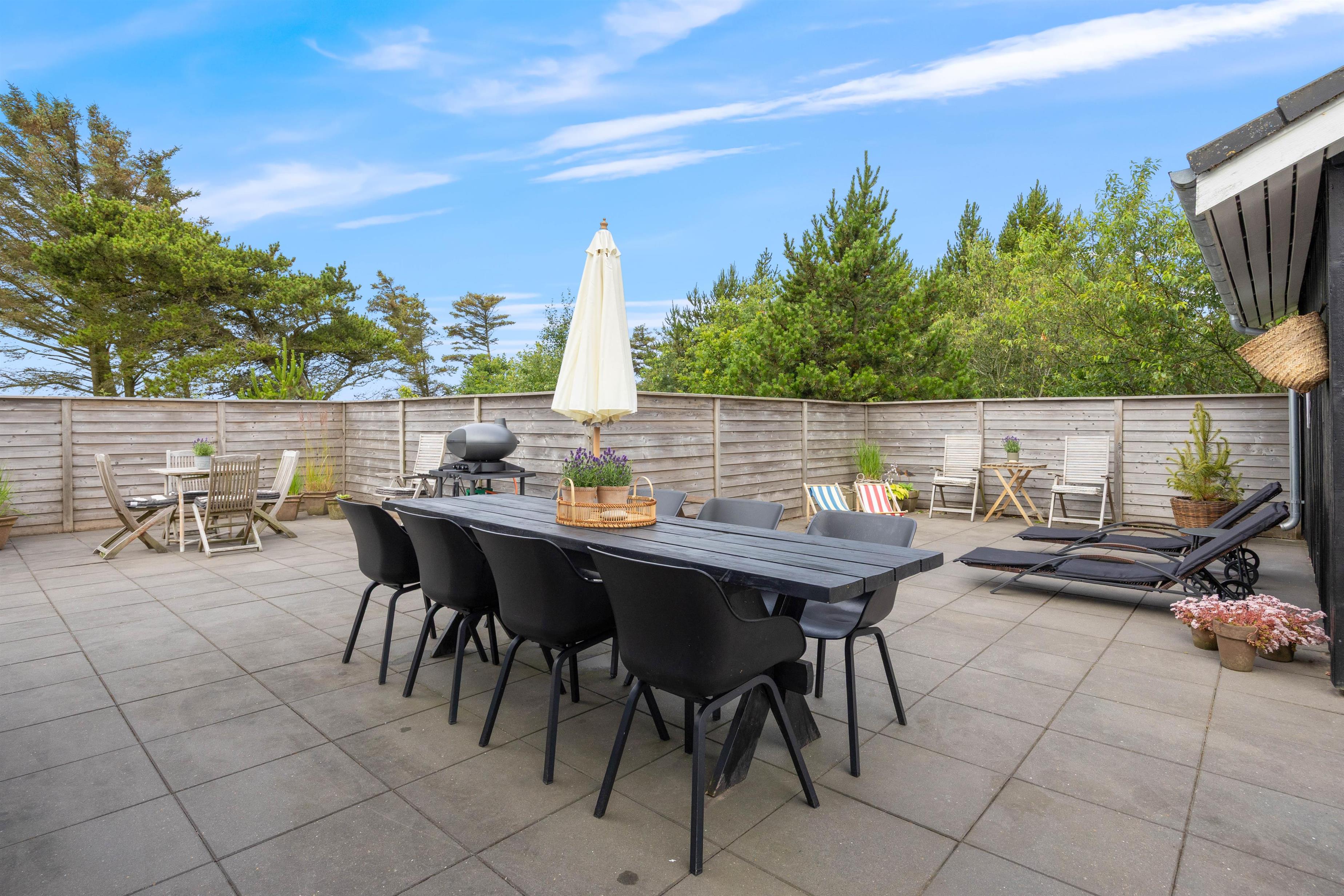 Det er ikke kun indenfor, at der er lagt op til gode stunder. Udenfor finder I en lukket og afskærmet terrasse, der byder på afslapning og gode muligheder for aktiviteter for de små. Terrassen er naturligvis udstyret med møbler og liggestole, og som noget ekstra lækkert finder I her også en udespa. Udover terrassen finder I på grunden både sandkasse og gyngestativ, hvor børnene kan tilbringe mange timers sjov.