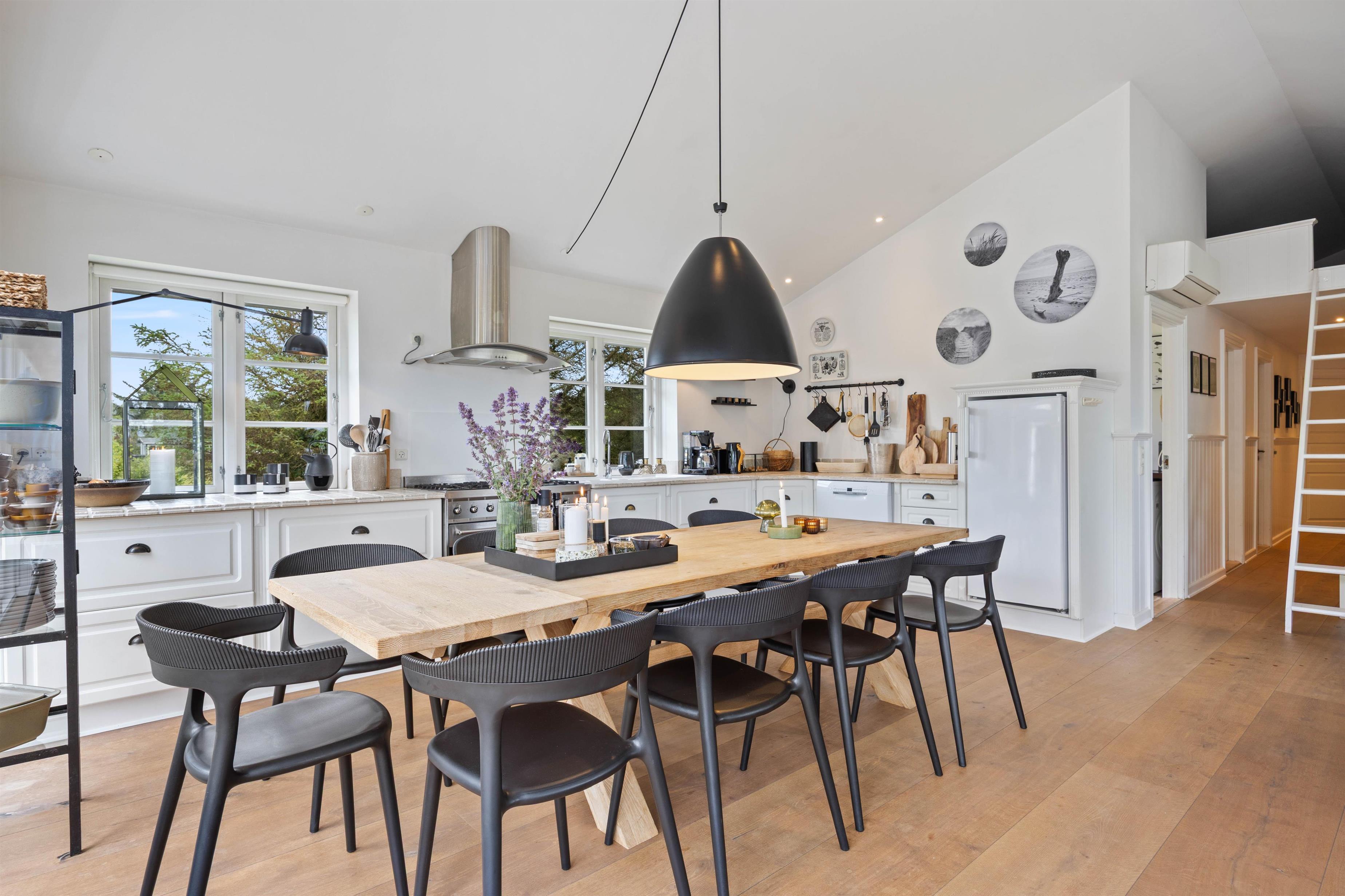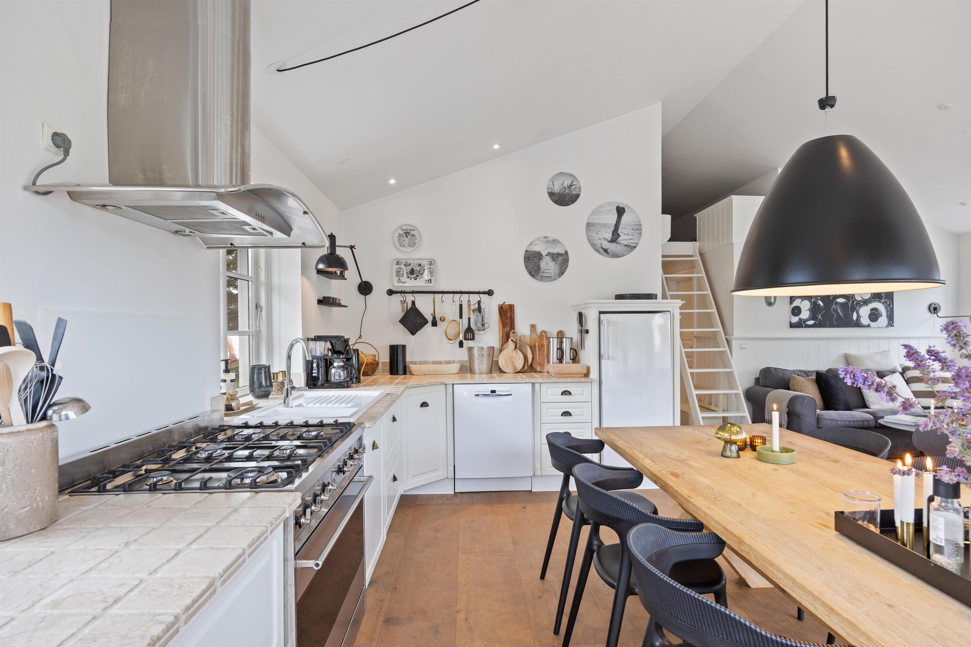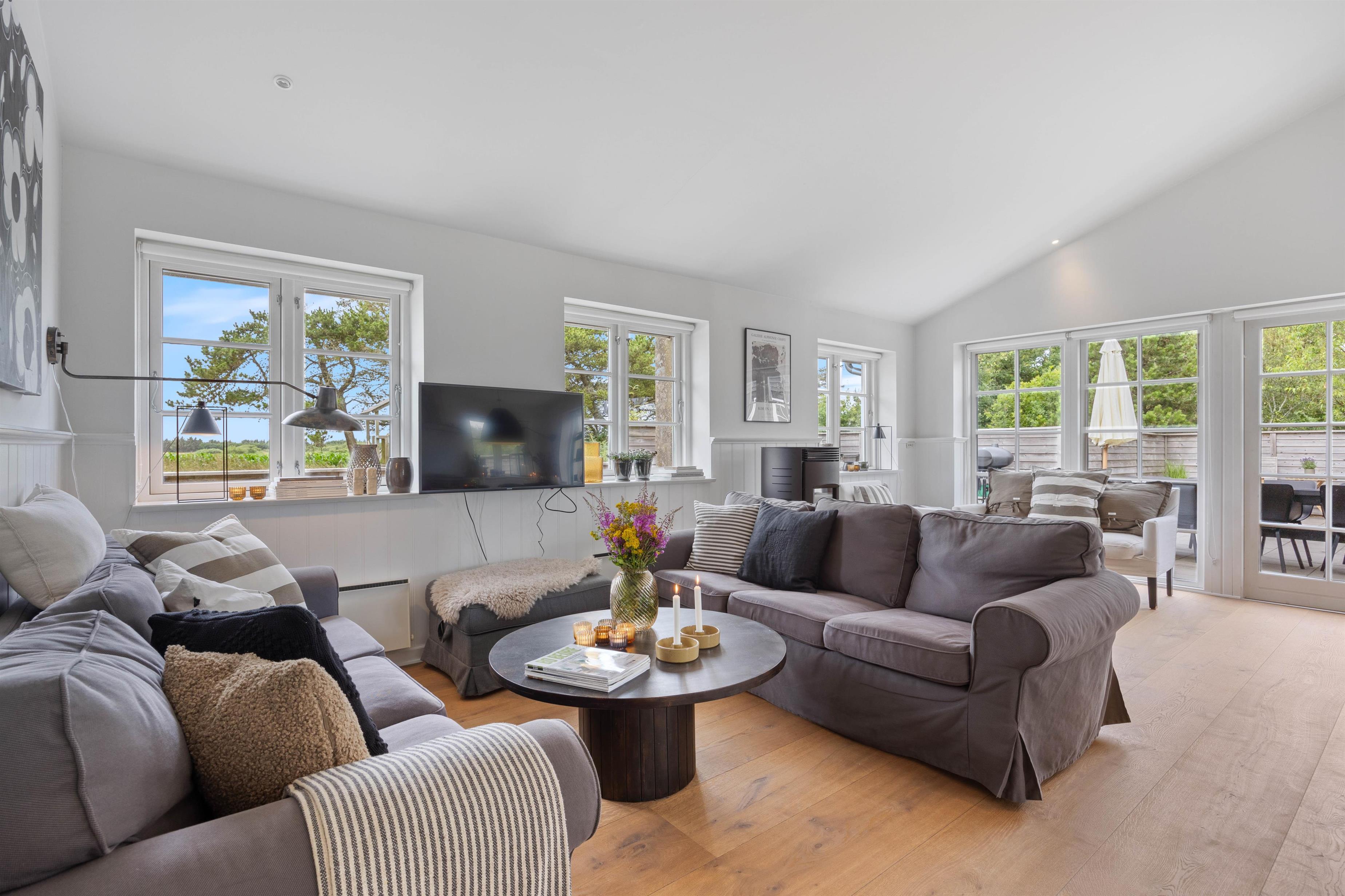 Så snart I træder indenfor på Brunbjergvej 48, vil I unægtelig mærke den hyggelige stemning, som der her er skabt. Her er der fine, hvidmalede lofter og vægge, der sammen med de mange sprossede vinduespartier skaber en dejlig og lys atmosfære. Sommerhusets hjerterum er uden tvivl det dejlige opholdsrum, hvor der er lagt op til mange gode stunder – om det så er i det veludstyrede køkken, i det komfortable sofamøblement eller foran den hyggelige brændeovn.