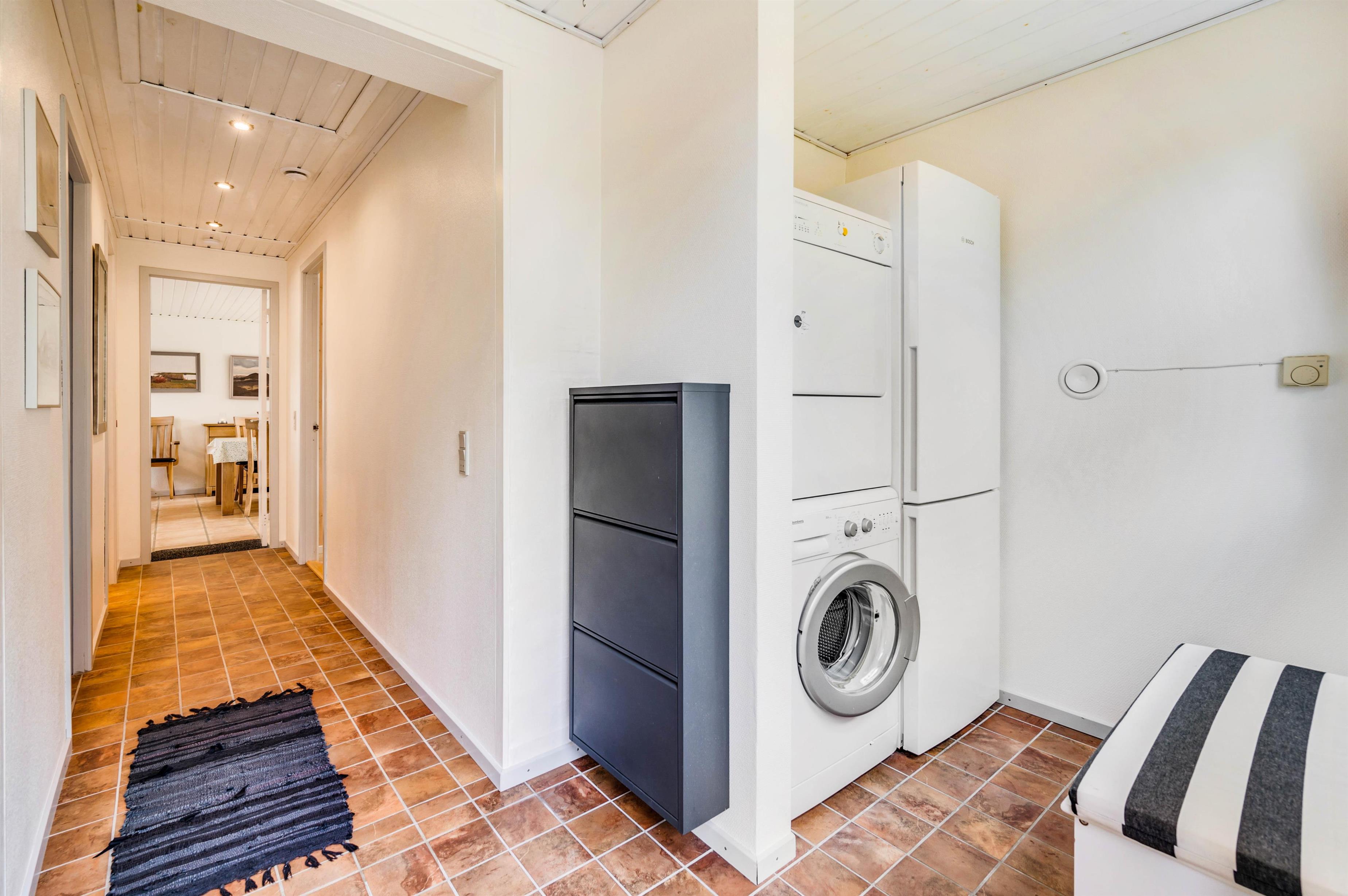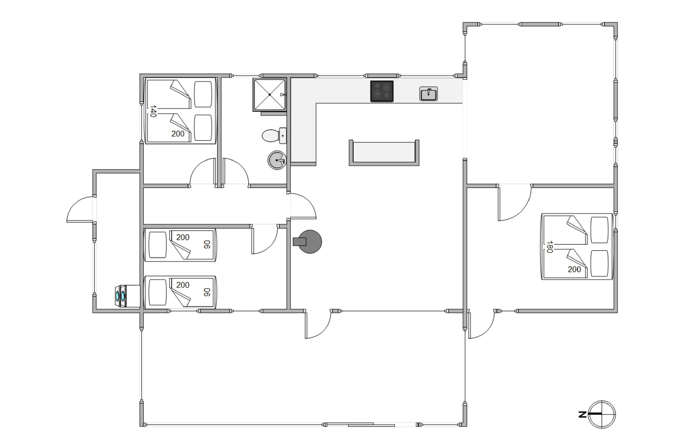 Stemningen i sommerhuset er 100% sommerhusstemning. Det sørger de lyse panelbeklædte vægge, brændeovnen og det smukke lysindfald fra vinduerne for. Og det store opholdsrum, der forbinder køkken, stue og spisekrog med hinanden, giver sommerhuset en hyggelig kerne. Her har man virkelig lyst til at opholde sig sammen.