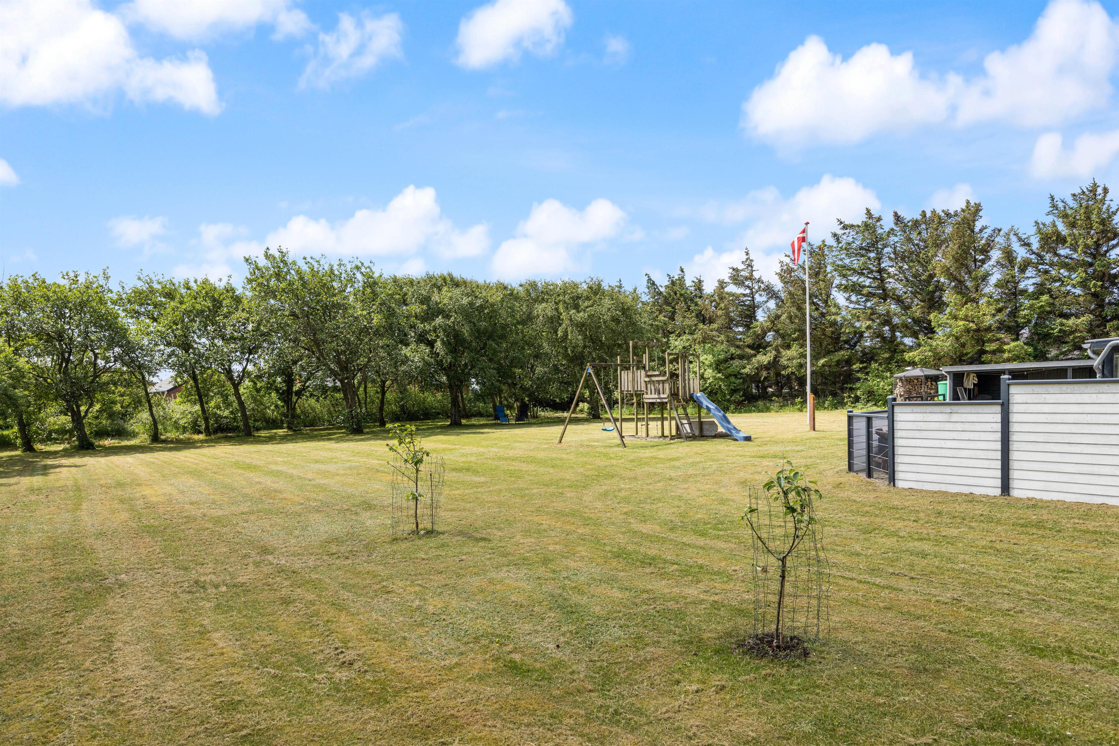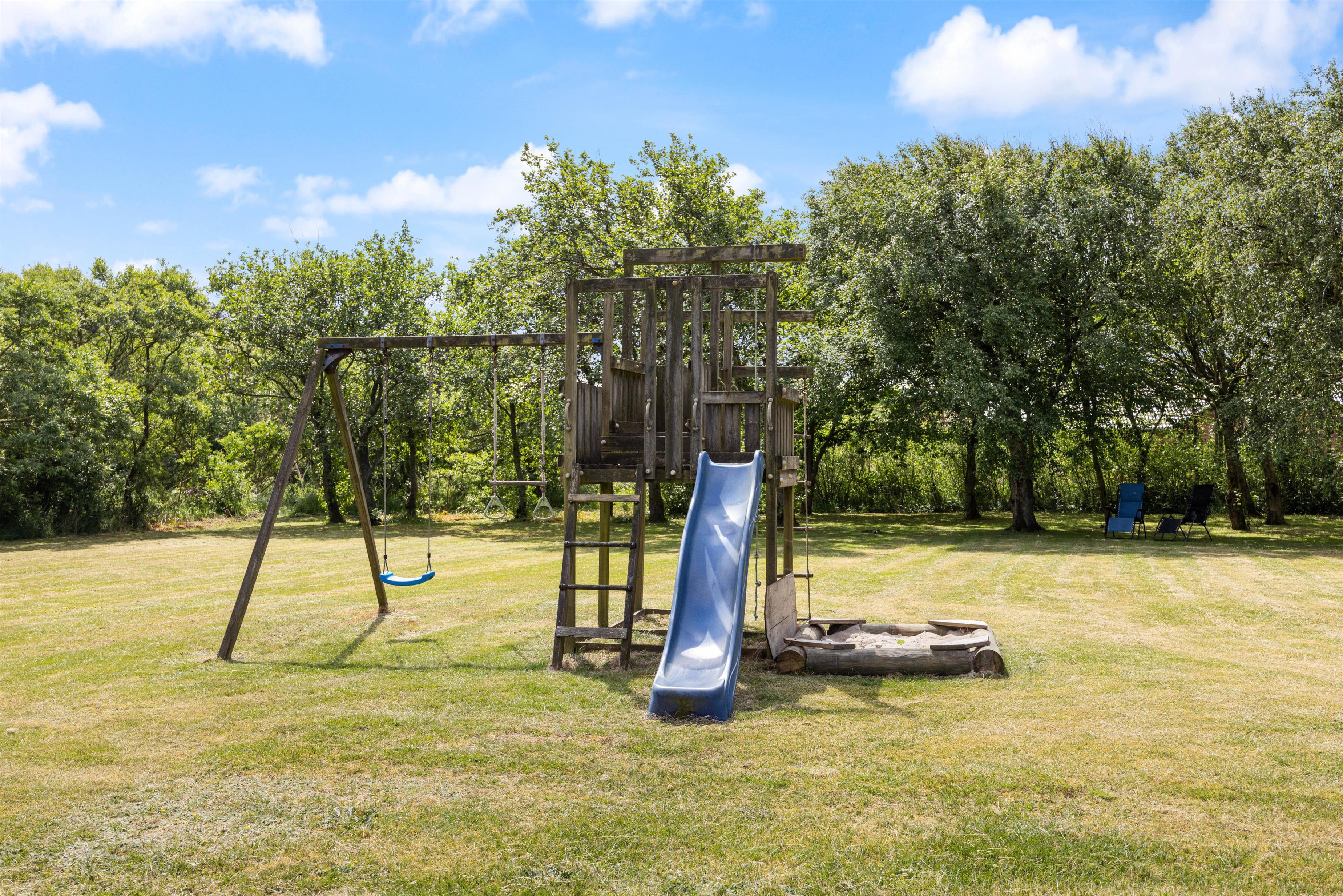 Den store, lukkede naturgrund indbyder til masser af leg og udendørsaktiviteter. Her finder I både en stor græsplæne og et legetårn med gynge og rutsjebane – et sikkert hit hos familiens yngste. Grunden er omkranset af buske og træer, hvilket giver læ for vinden og en god portion privatliv i det grønne.